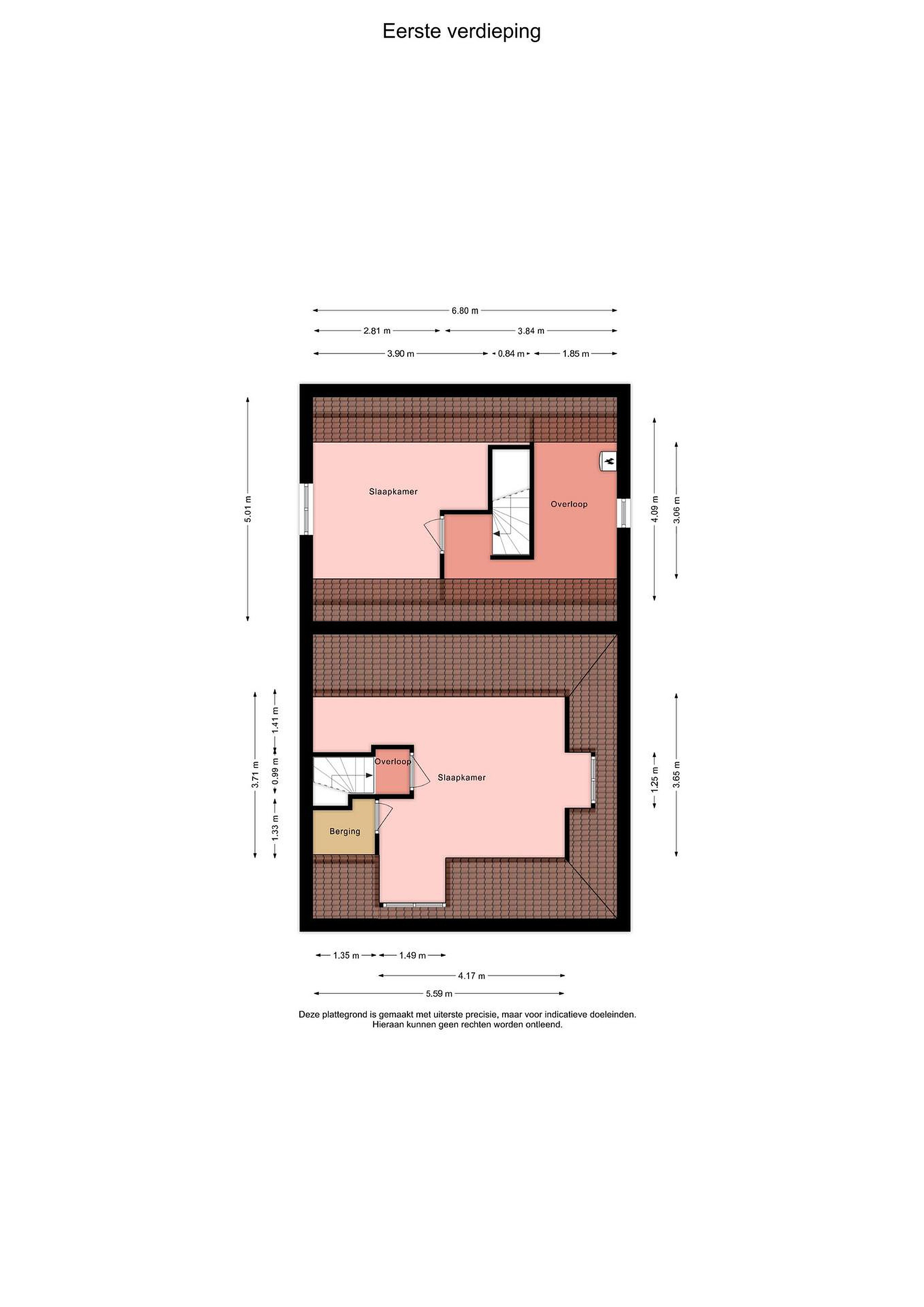 Eerste verdieping 2 aparte trapopgangen met beide een overloop en een ruime slaapkamer.