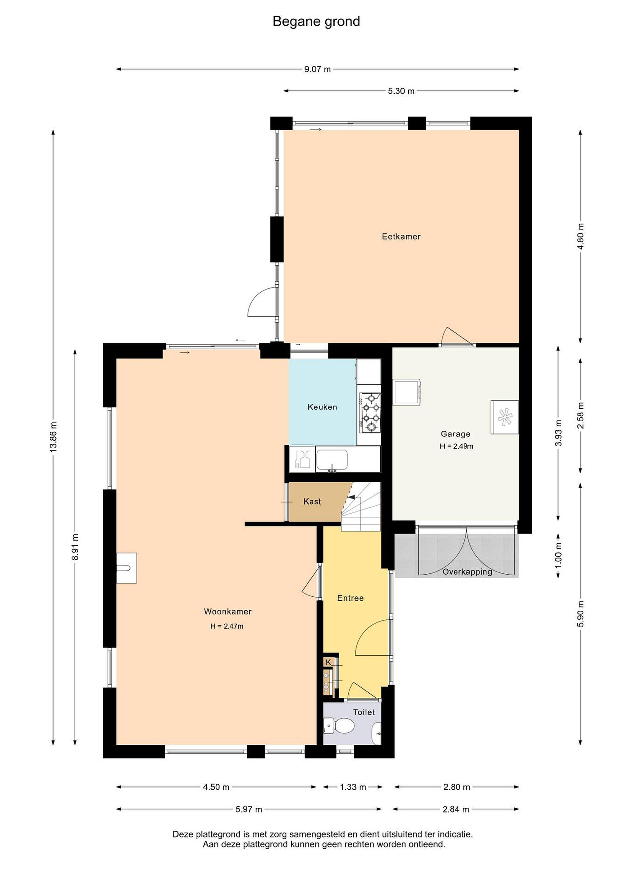 Begane grond entree/hal, toilet, meterkast, woonkamer met palletkachel en schuifpui naar de tuin, hoekkeuken met inbouwapparatuur, ruime aangebouwde eetkamer eveneens met schuifpui naar de tuin en uitzicht over het water. Via de eetkamer kom je in de garage.