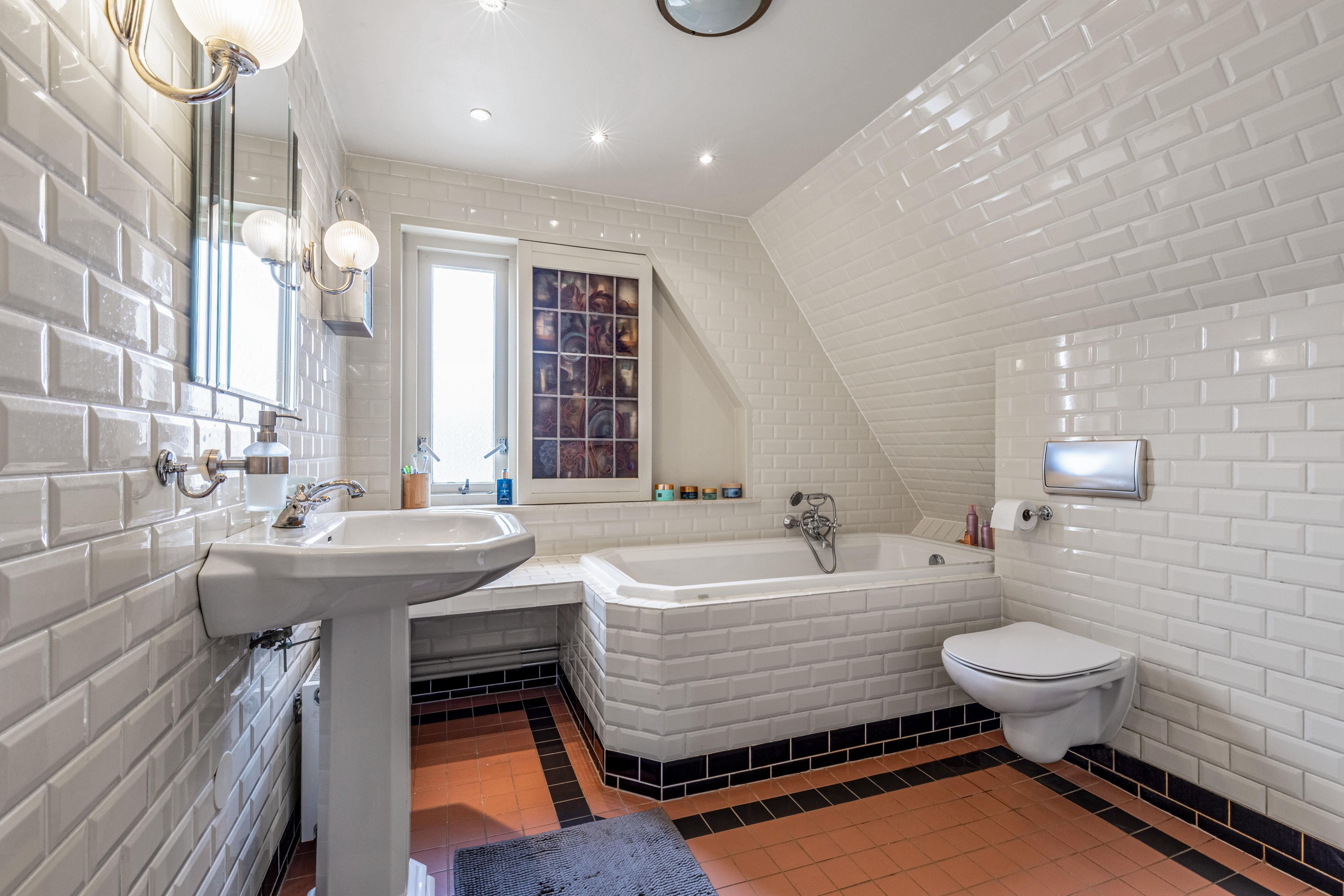 Eerste verdieping overloop, badkamer voorzien van ligbad, douche, toilet en wastafel. Er zijn 4 slaapkamers waarvan 1 hele ruime met openslaande deuren en frans balkon.