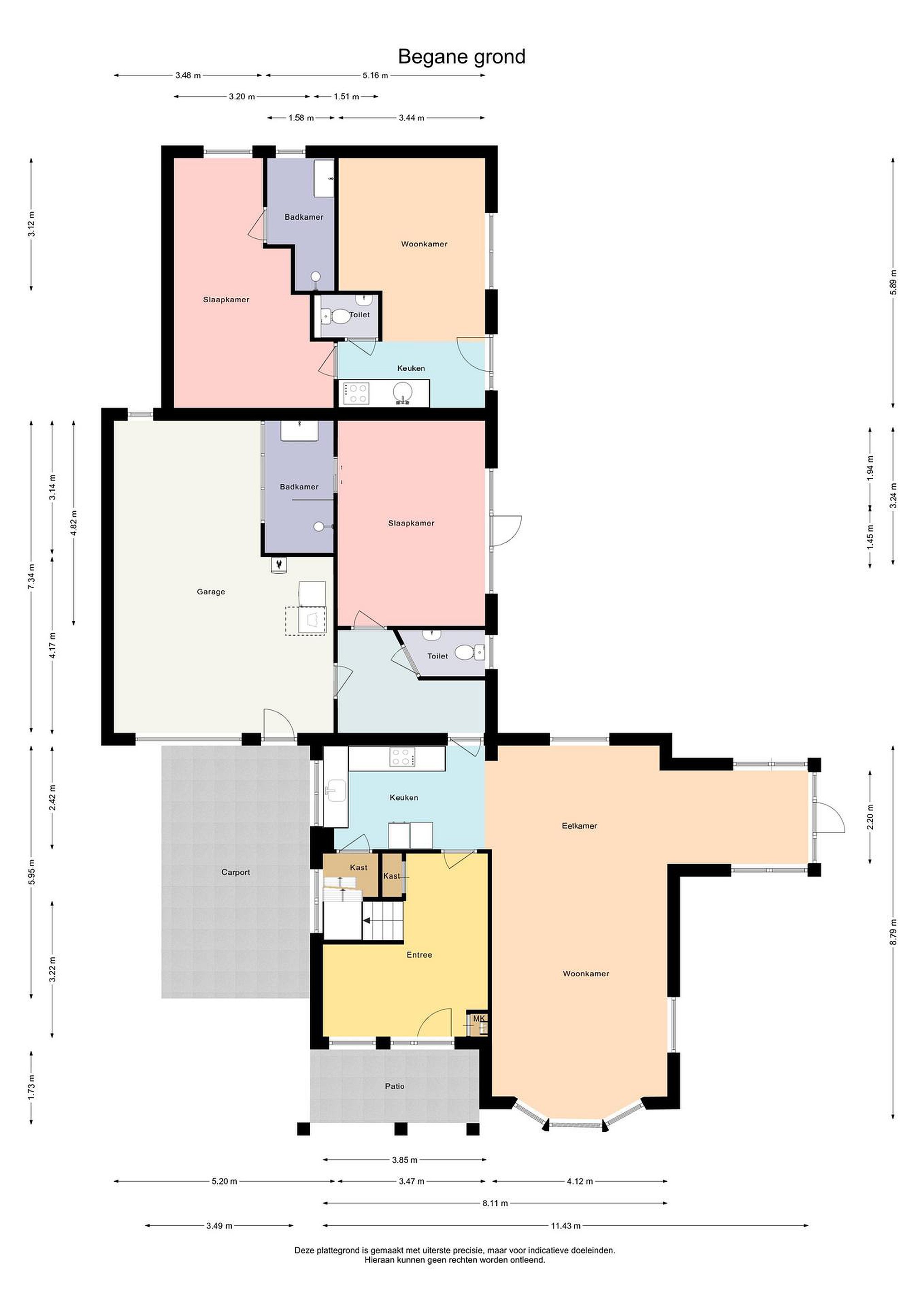 Begane grond entree/hal, meterkast, trapopgang, bergkast, Woonkamer met aanbouw, hoekkeuken met inbouwapparatuur zoals: inductiekookplaat, oven, vaatwasser en koelkast. Hal met toilet, deur naar de garage en deur naar ruime slaapkamer met badkamer met douche en wastafel.