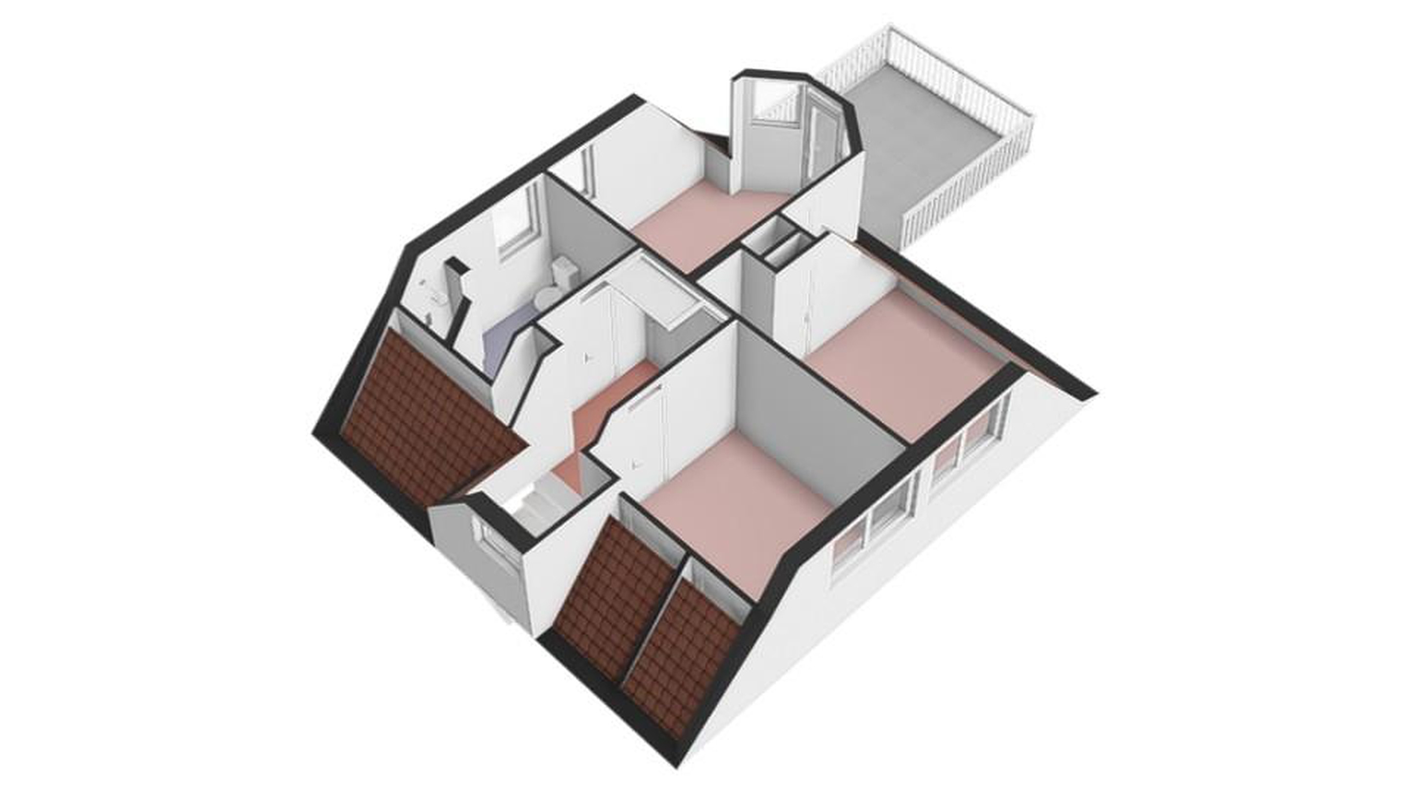 Eerste verdieping overloop, 3 slaapkamers waarvan 1 met balkon en badkamer voorzien van toilet, douche en wastafel.