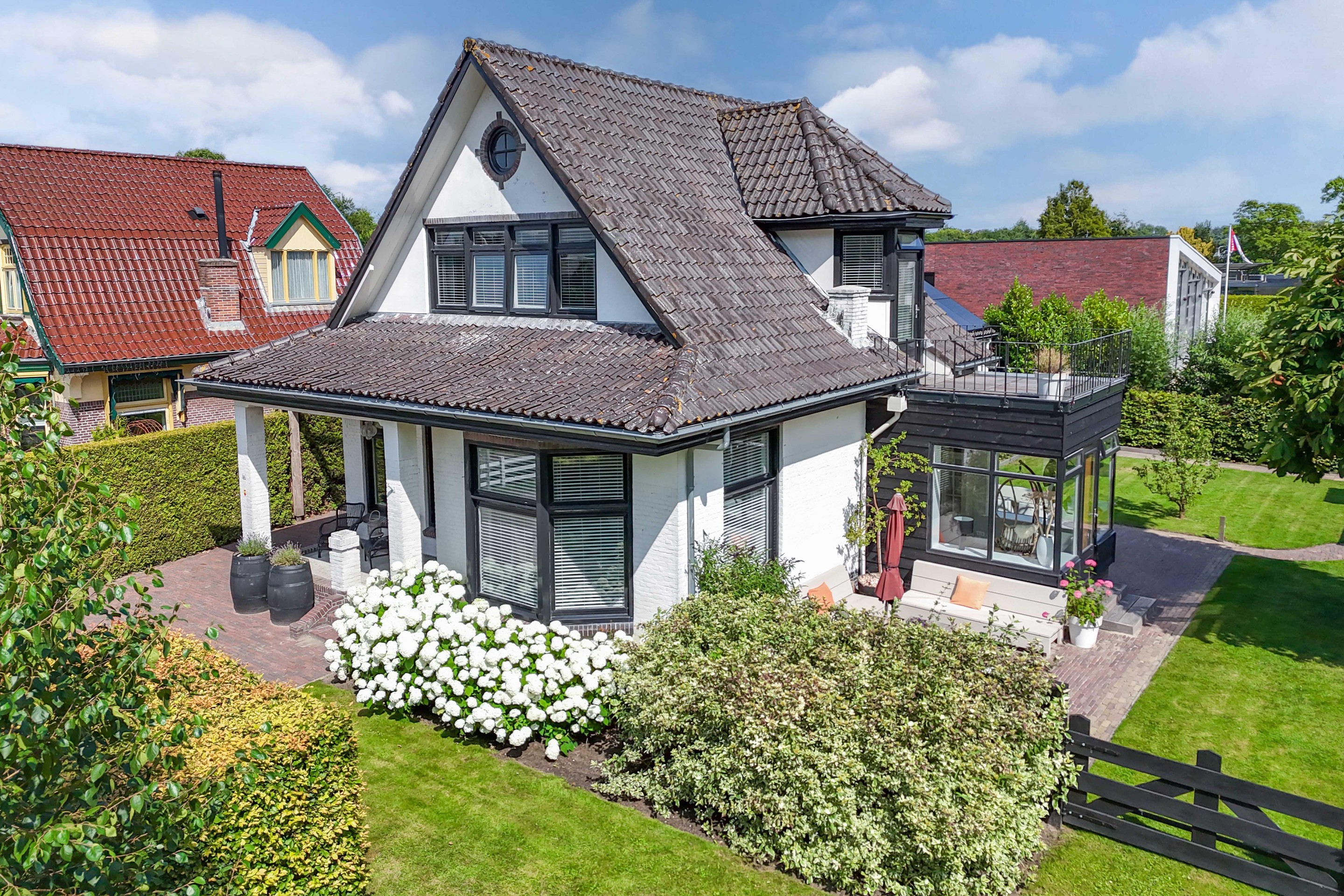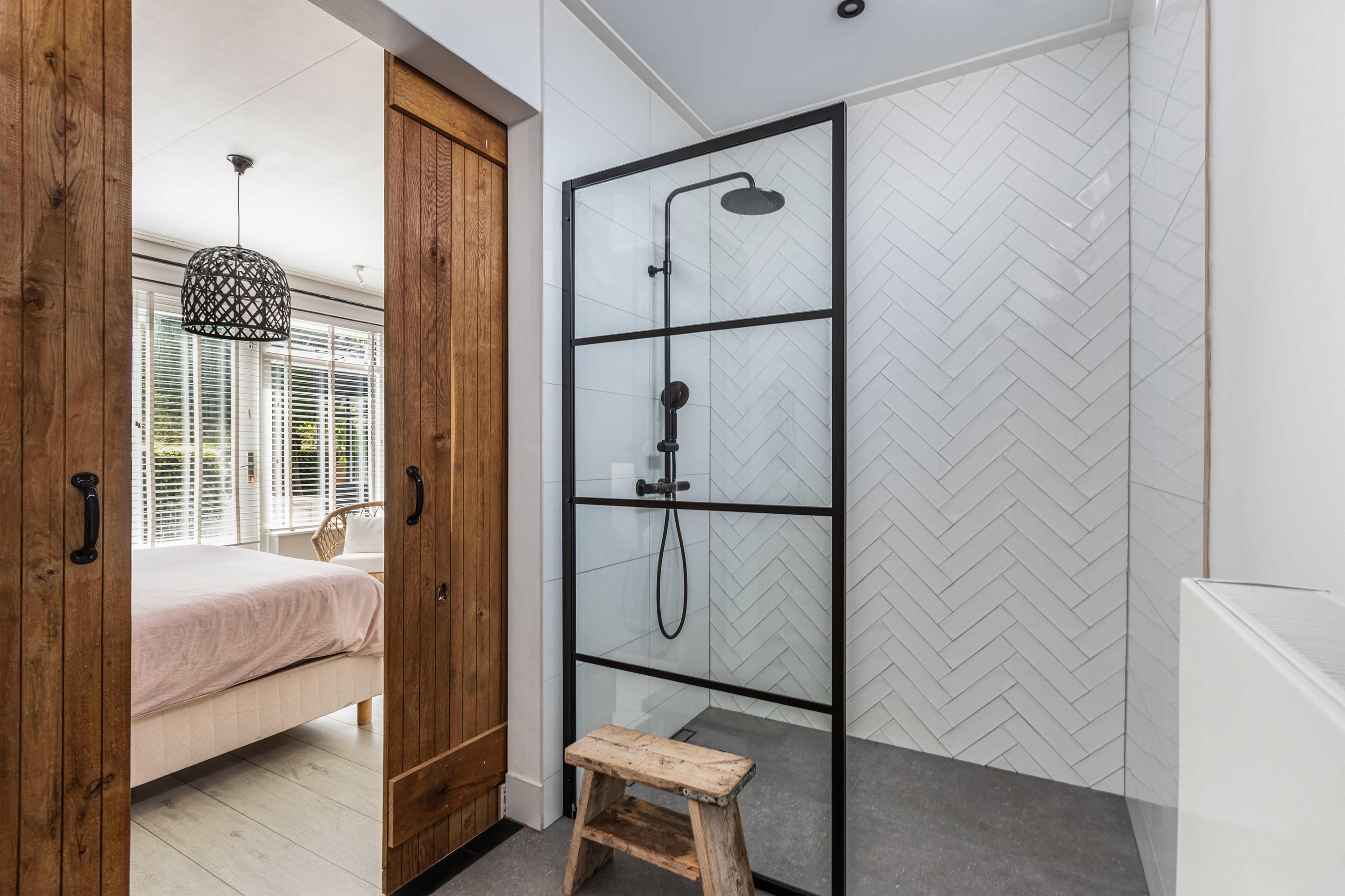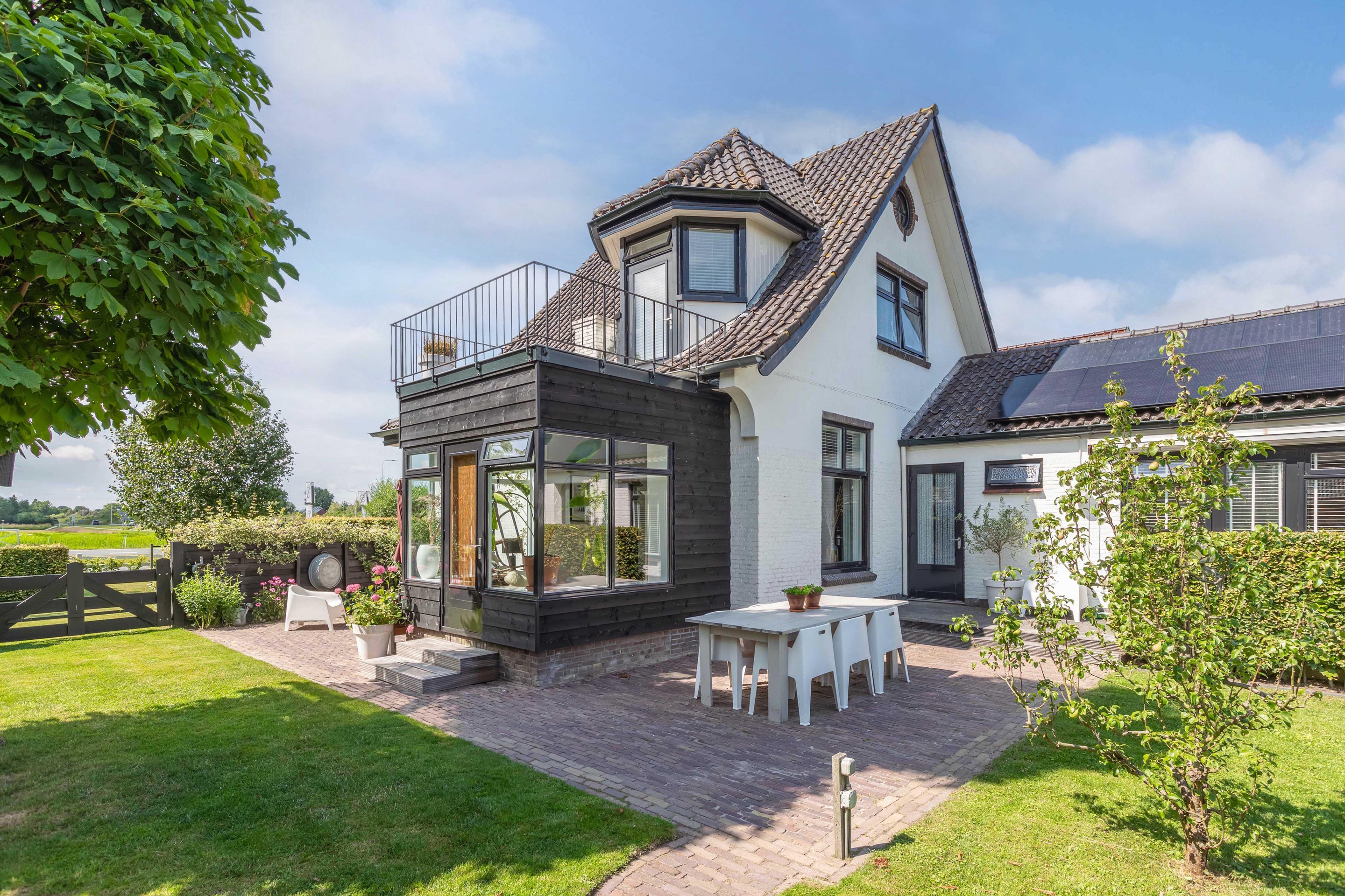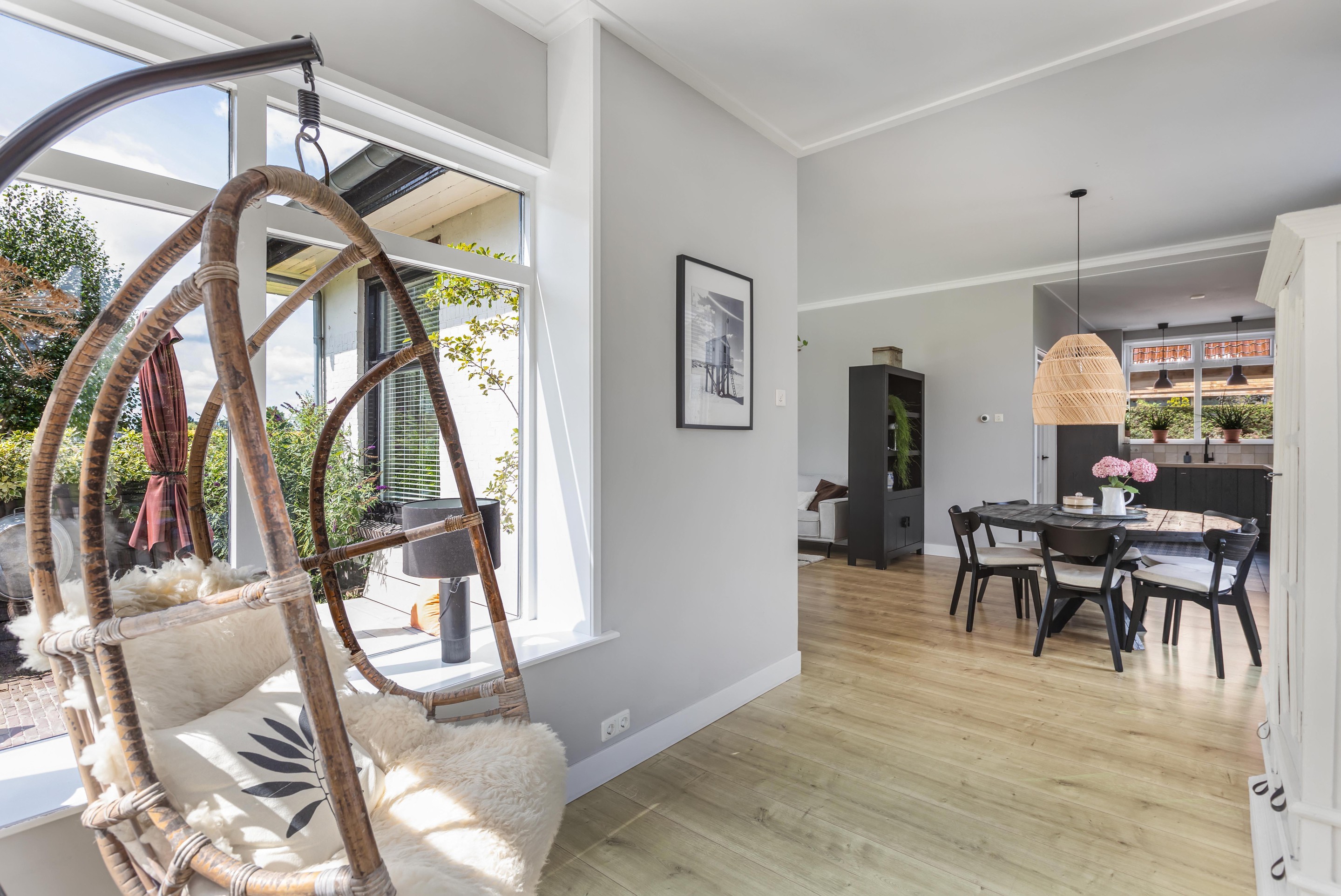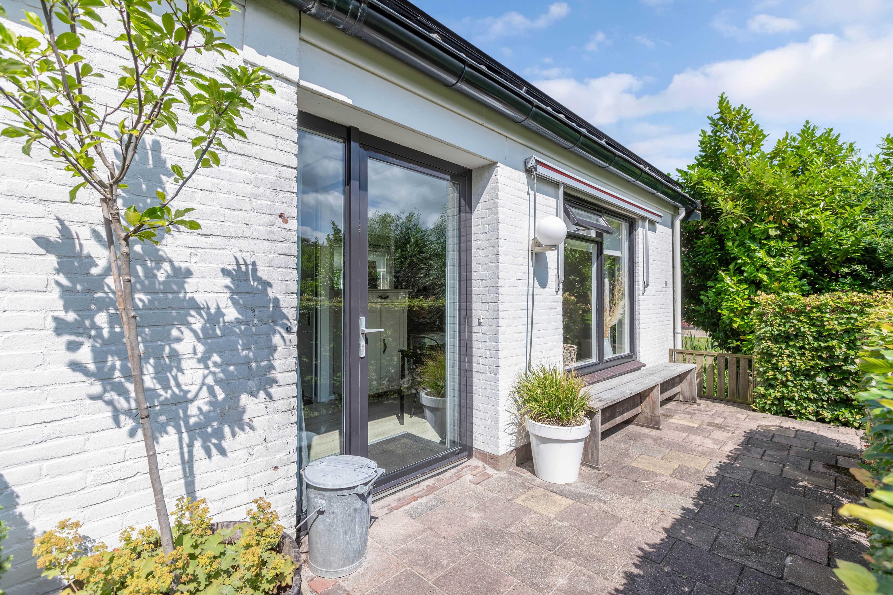 Binnen valt direct het lichte en aangename interieur op. Grote raampartijen zorgen voor een prachtige lichtinval en versterken het ruimtelijke gevoel in huis. De indeling is bijzonder veelzijdig en maakt deze woning geschikt voor uiteenlopende woonwensen. In de oorspronkelijke woning bevinden zich drie slaapkamers en een badkamer op de verdieping. De aanbouw voegt hier nog een extra slaapkamer en badkamer aan toe, terwijl het zelfstandige appartement met eigen keuken, slaapkamer en badkamer tal van mogelijkheden biedt, zoals gebruik voor bed & breakfast, praktijk aan huis, mantelzorg of duowonen.