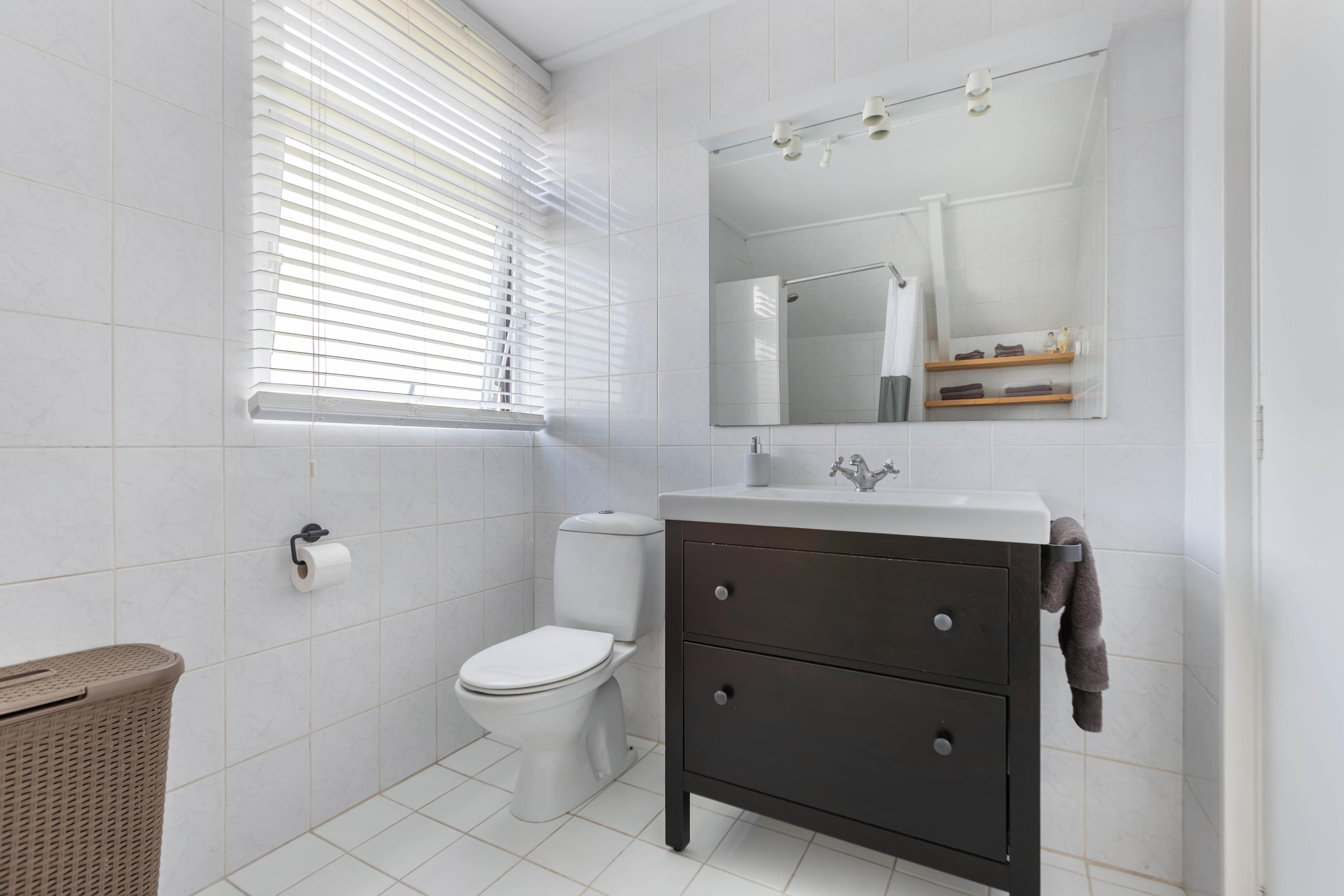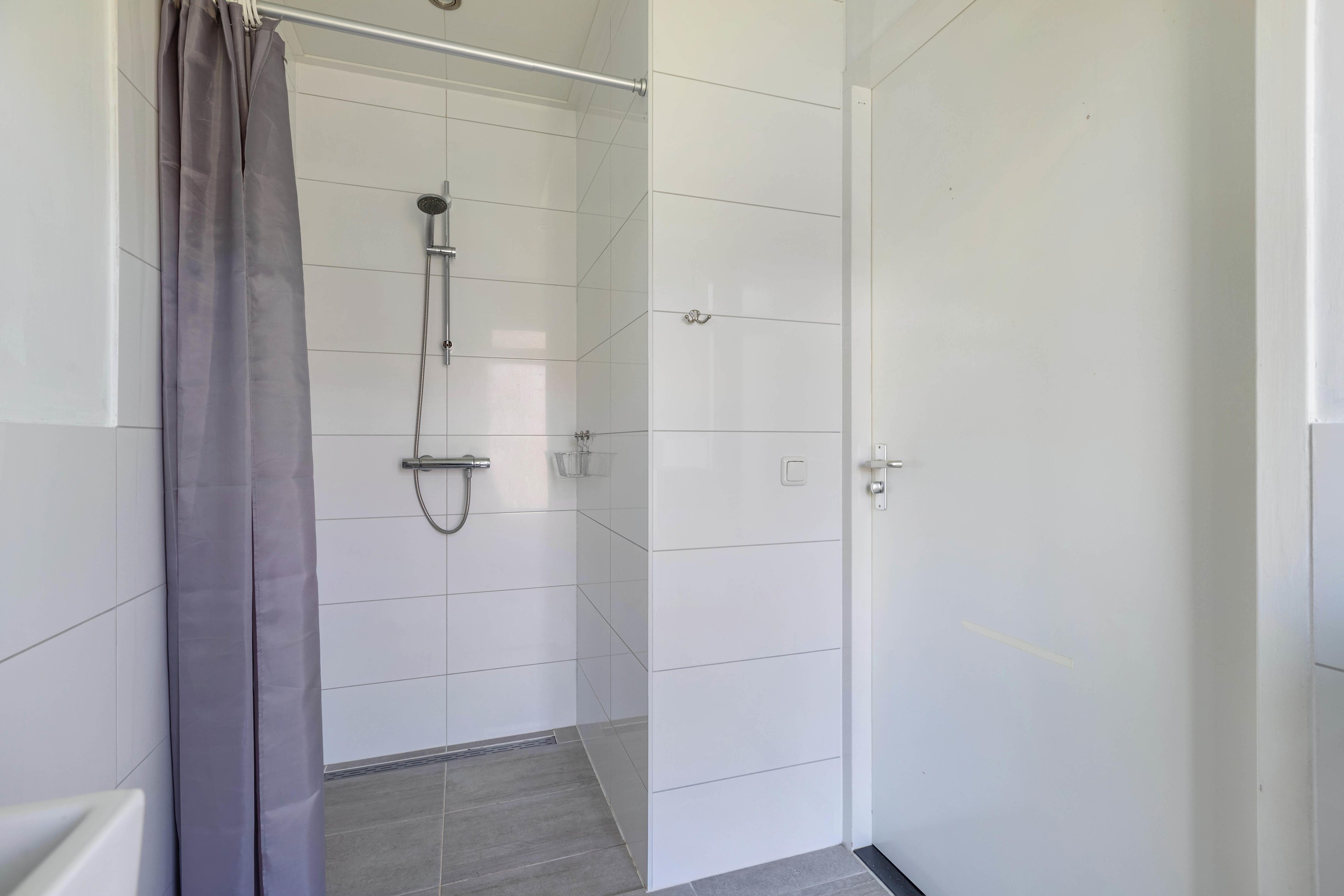 Appartement: keuken, woonkamer, toilet, slaapkamer, badkamer met douche en wastafel.