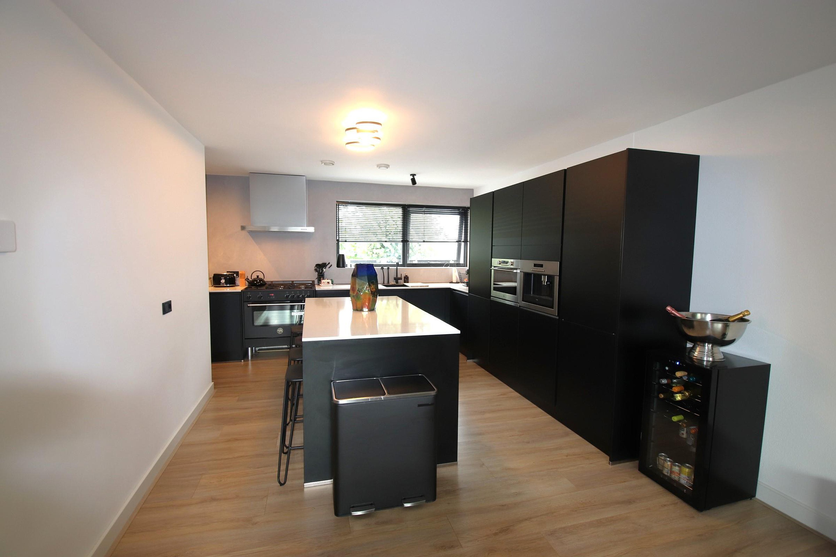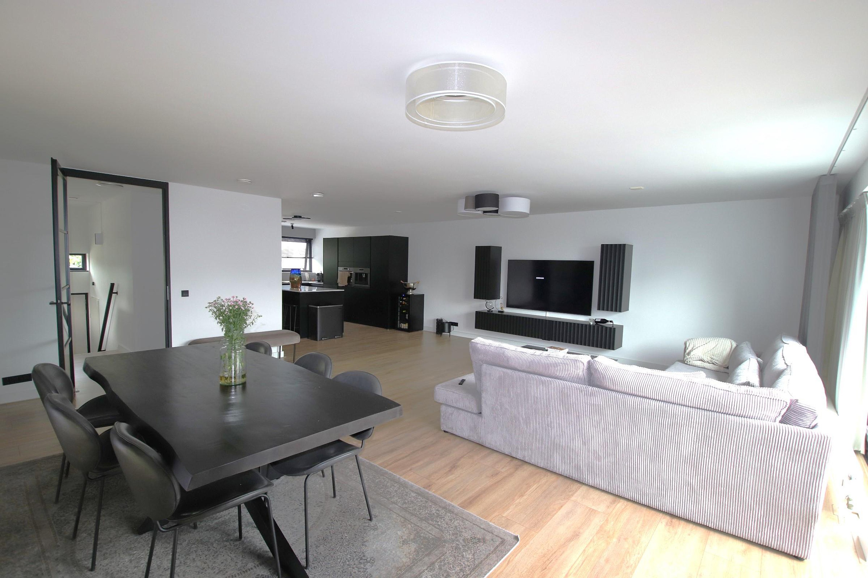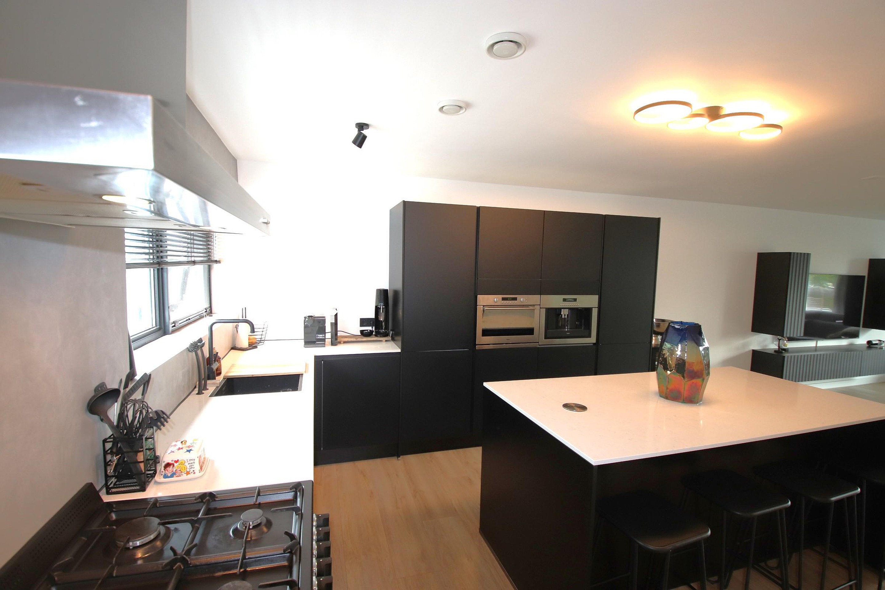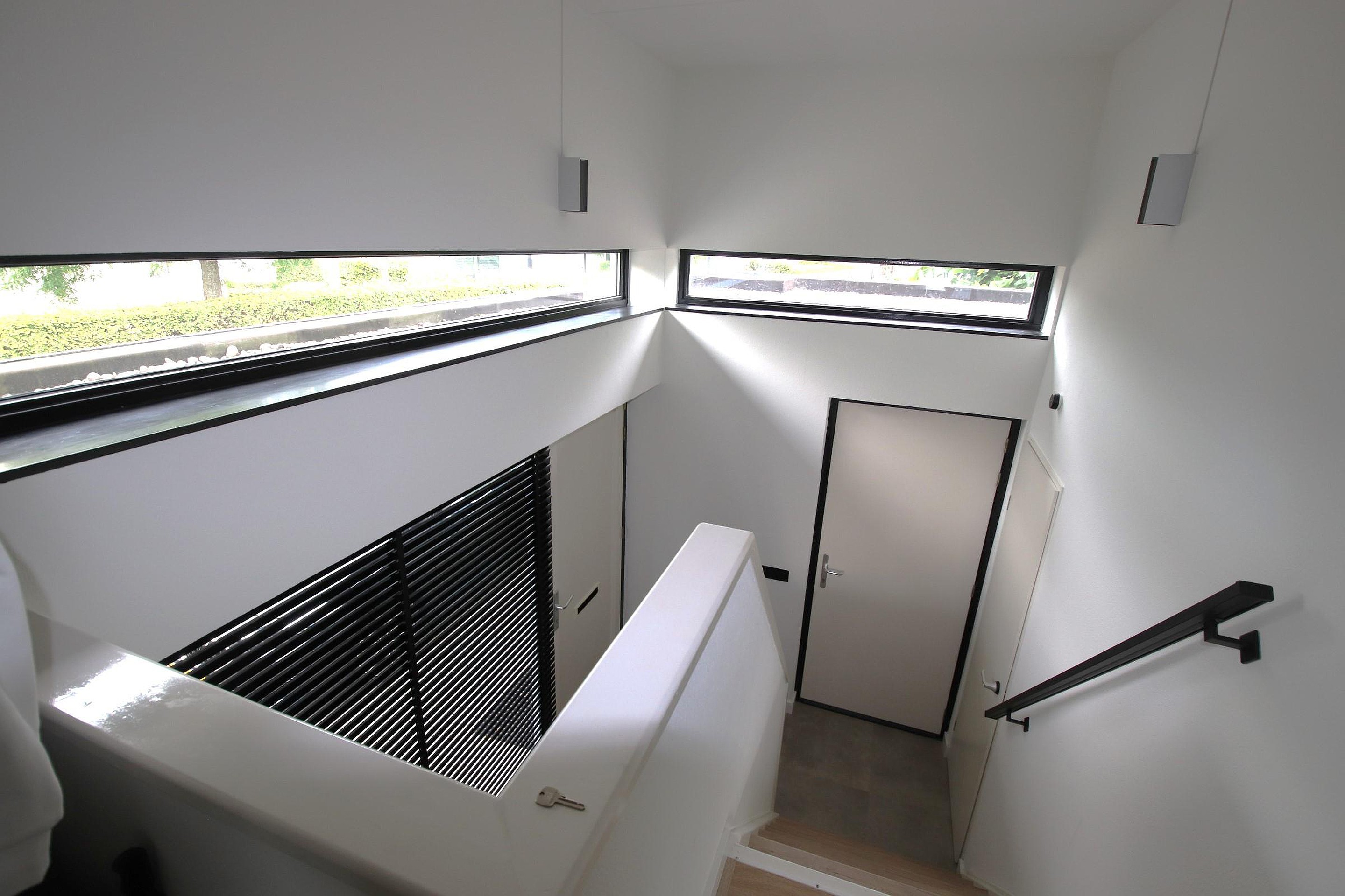 entree, centrale hal, deur naar garage, meterkast, trapopgang, 2e hal met 2e modern toilet met fonteintje, garderobe, royale L-vormige woonkamer met schuifpui, open keuken met keukeneiland en inbouwapparatuur, cv-/bergkast, balkon, trapneergang naar beschutte moderne nieuw aangelegde binnentuin, vrij achterom, geïsoleerde garage met elektrische bedienbare geïsoleerde deur, uitstortgootsteen, waterontharder en kleine patio.