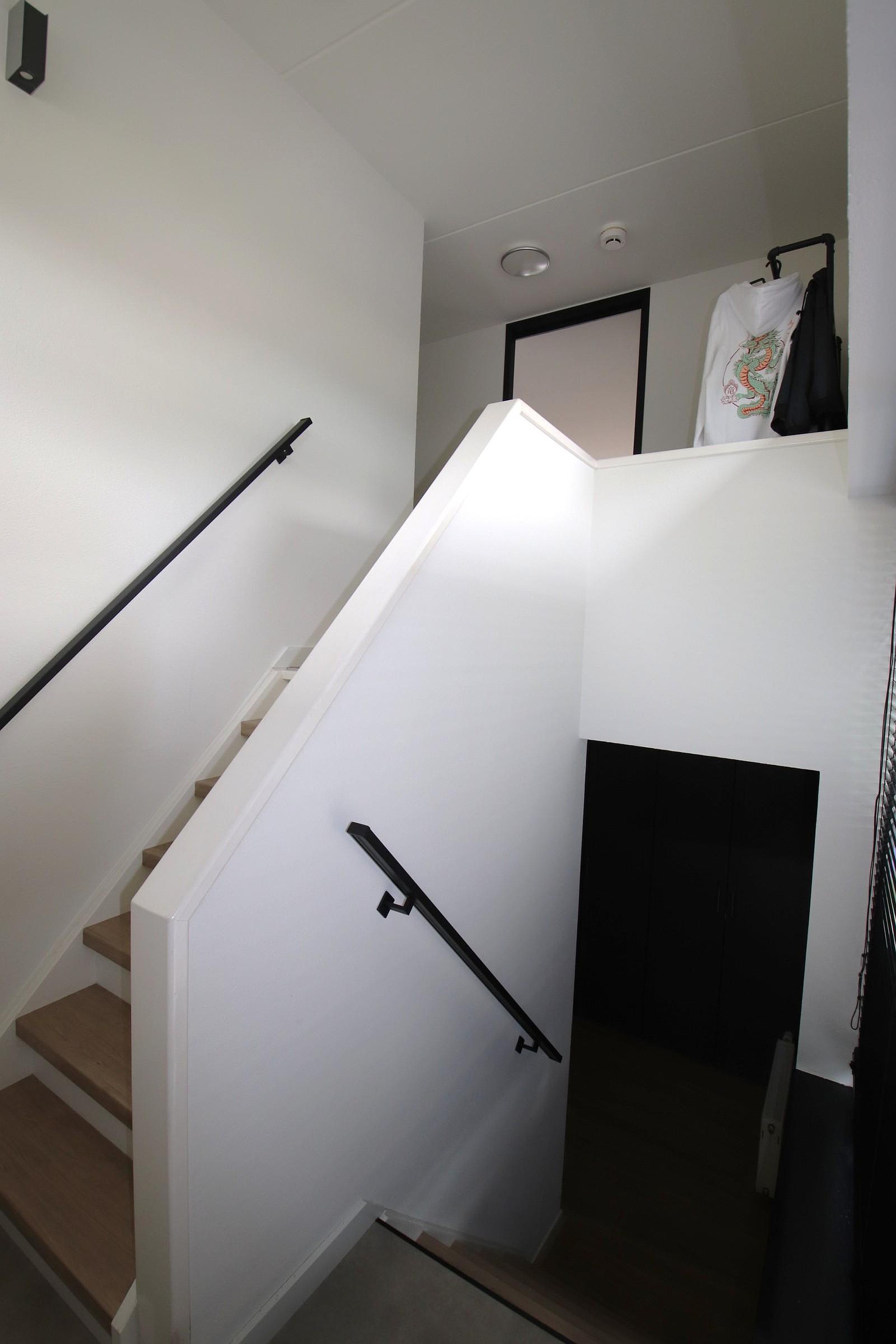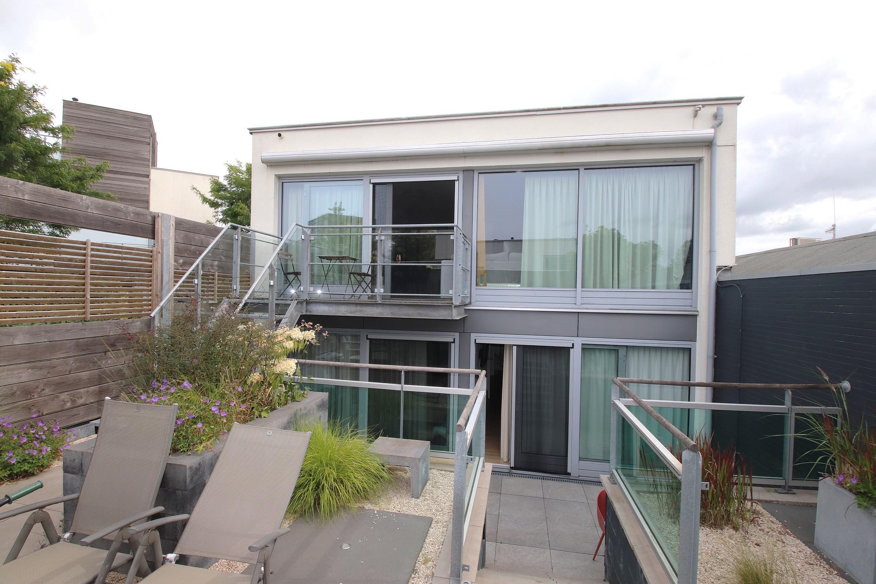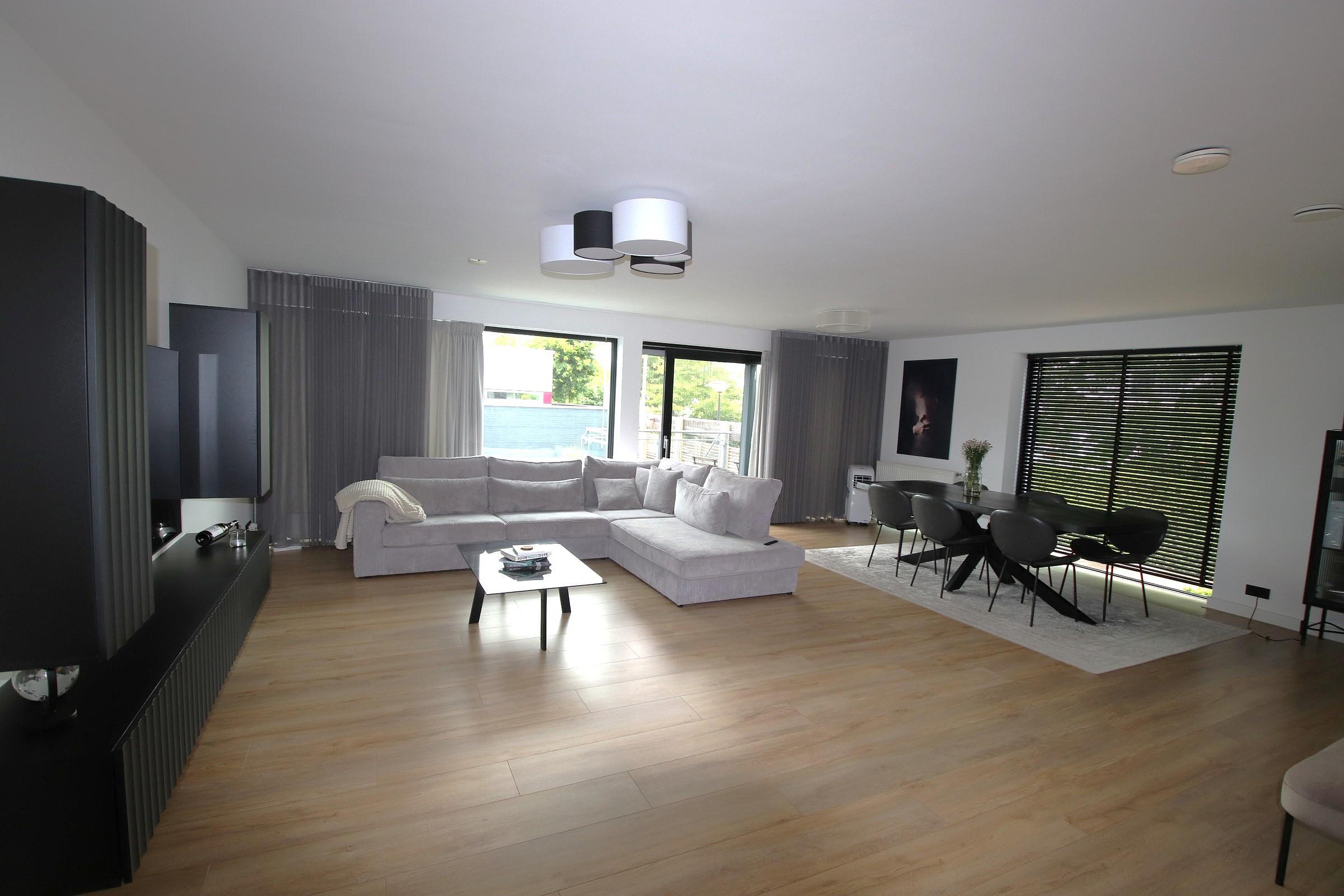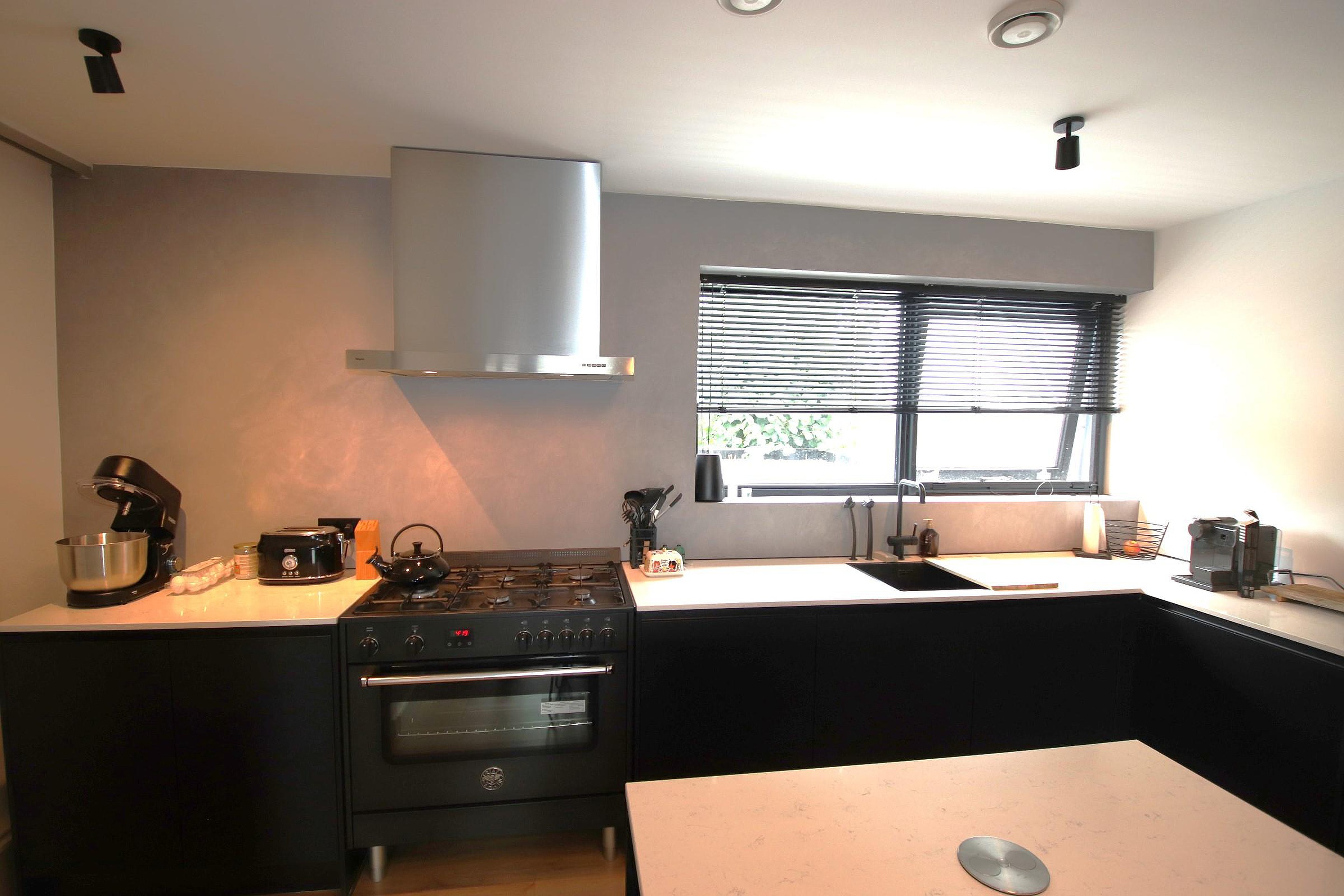 entree, centrale hal, deur naar garage, meterkast, trapopgang, 2e hal met 2e modern toilet met fonteintje, garderobe, royale L-vormige woonkamer met schuifpui, open keuken met keukeneiland en inbouwapparatuur, cv-/bergkast, balkon, trapneergang naar beschutte moderne nieuw aangelegde binnentuin, vrij achterom, geïsoleerde garage met elektrische bedienbare geïsoleerde deur, uitstortgootsteen, waterontharder en kleine patio.