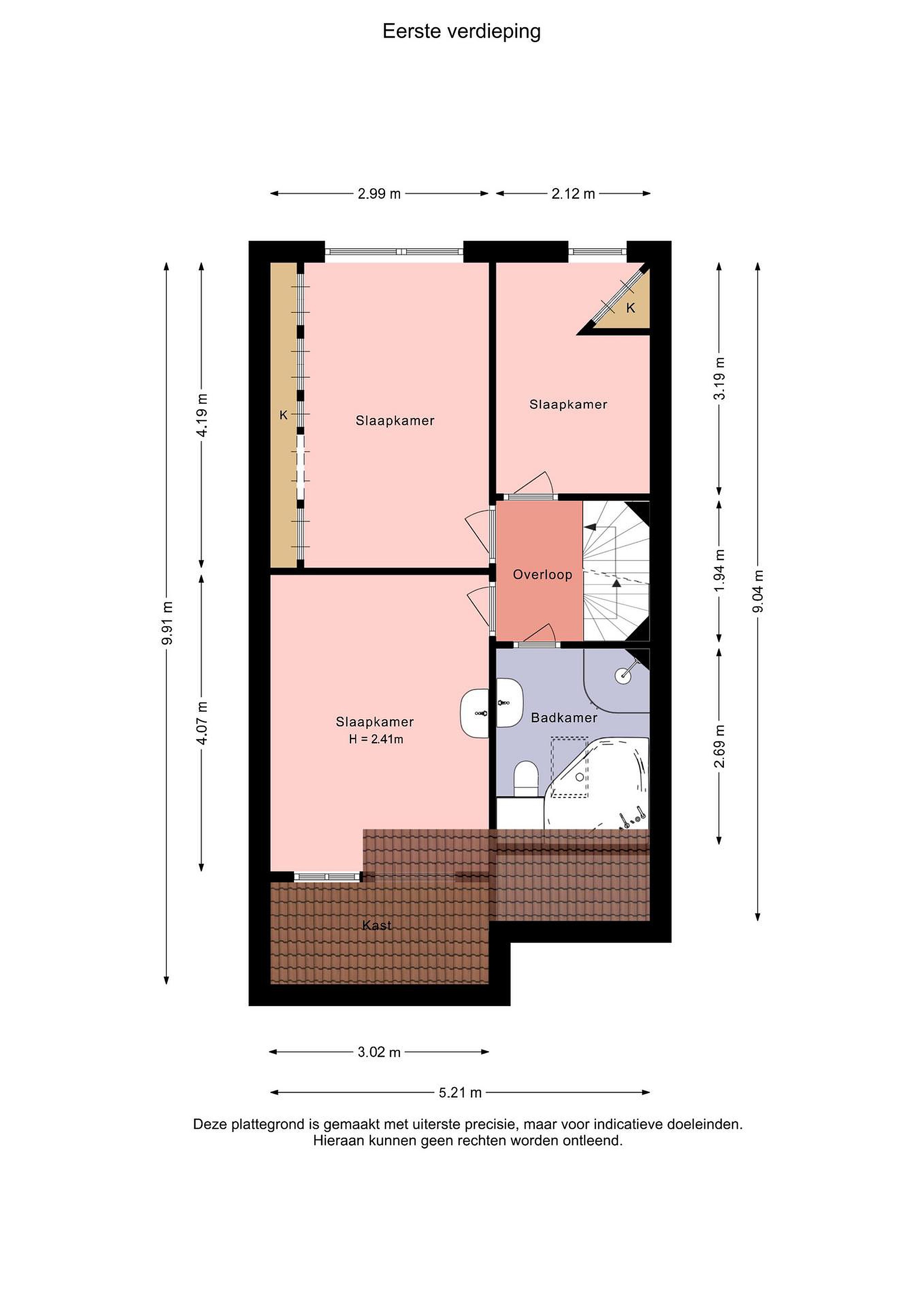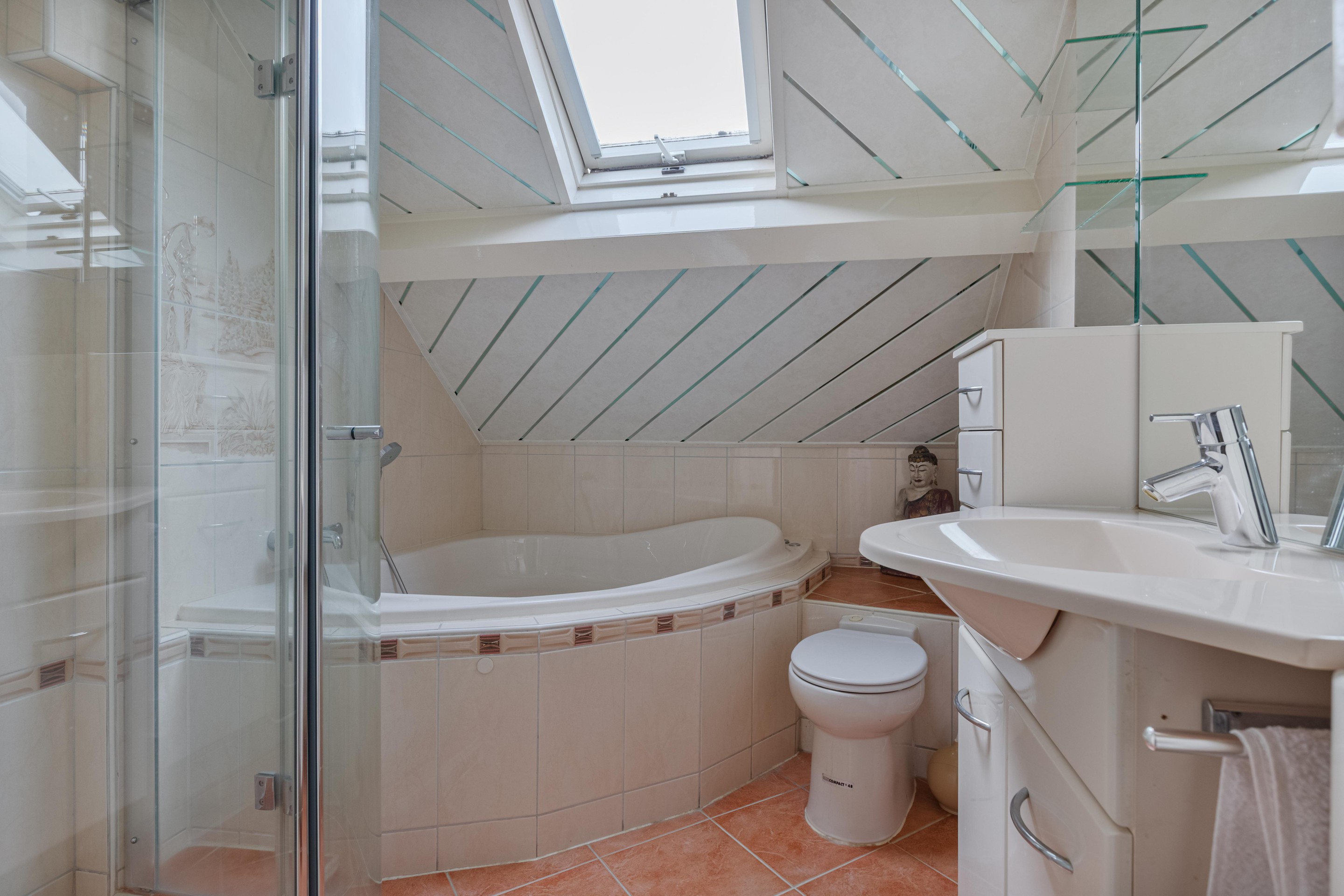 Eerste verdieping overloop, 3 slaapkamers en badkamer voorzien van wastafelmeubel, toilet, ligbad en douchecabine.