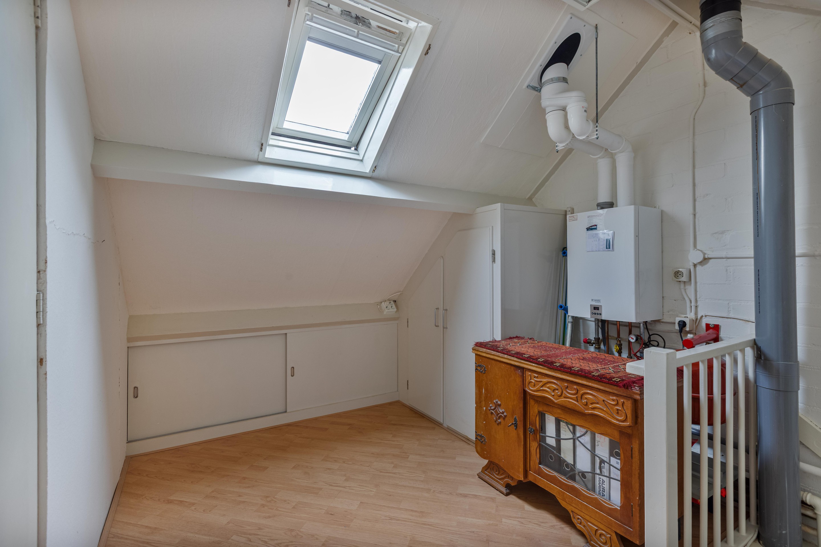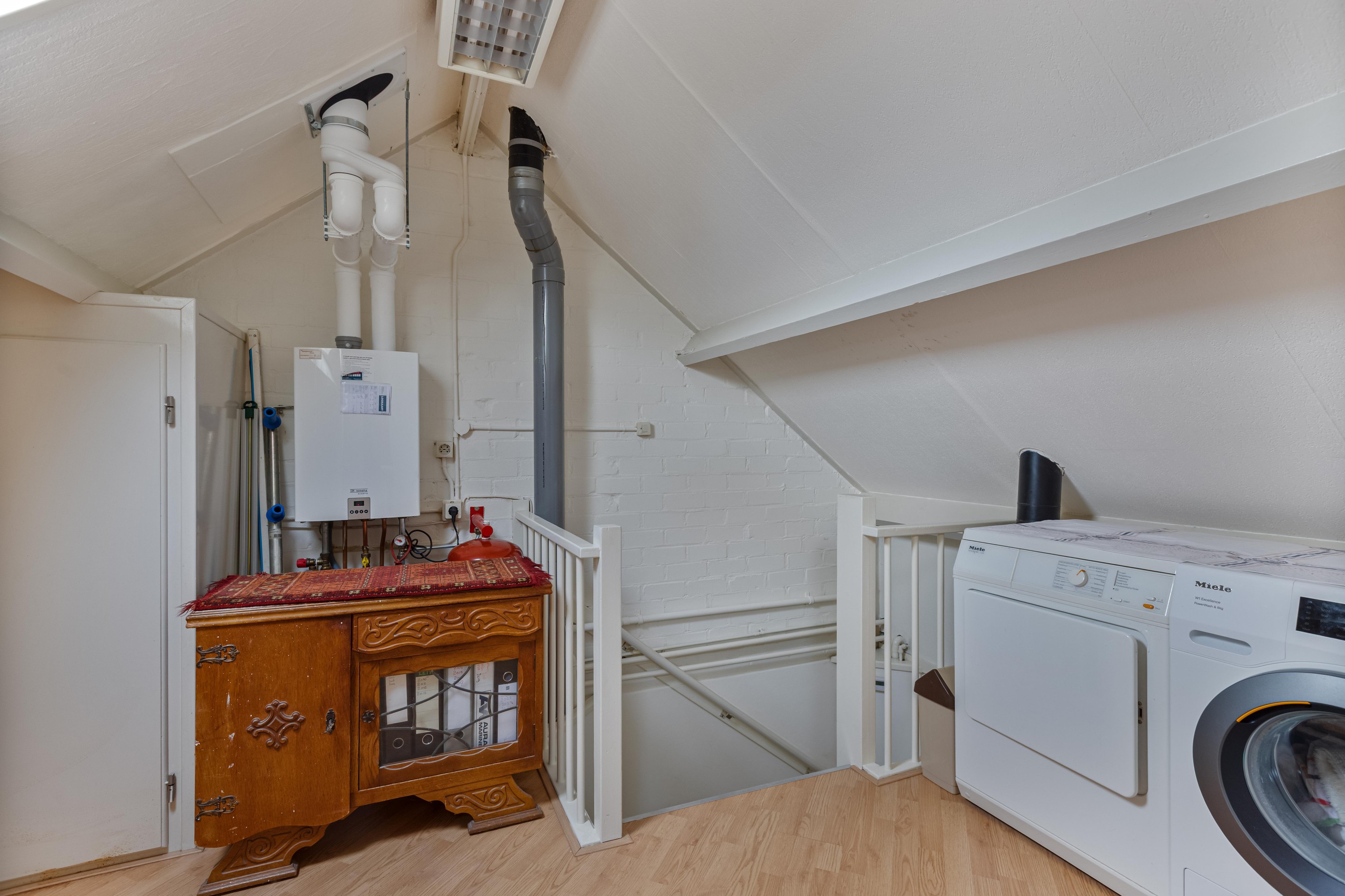 Tweede verdieping overloop met cv-opstelling en witgoedaansluiting, slaapkamer.