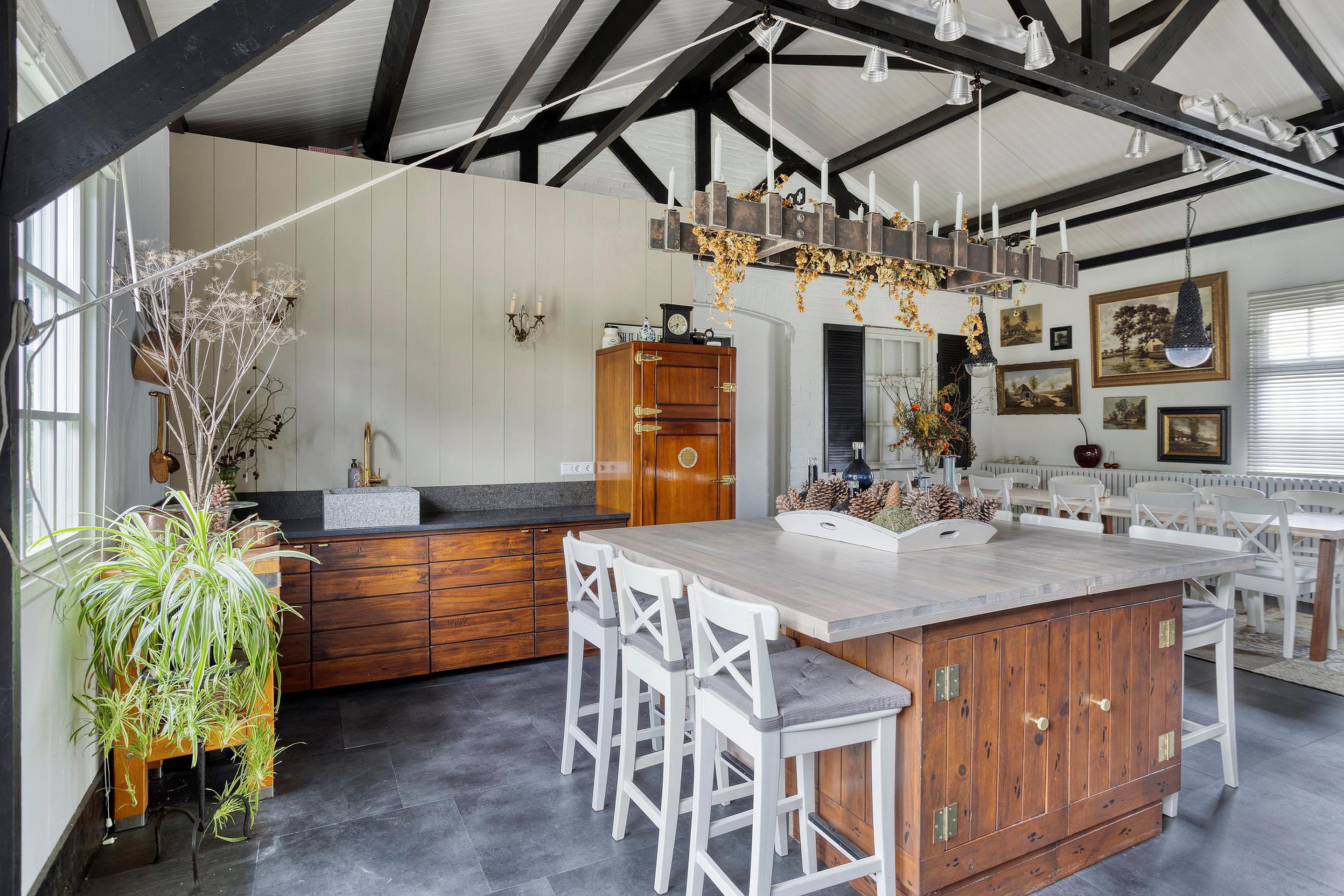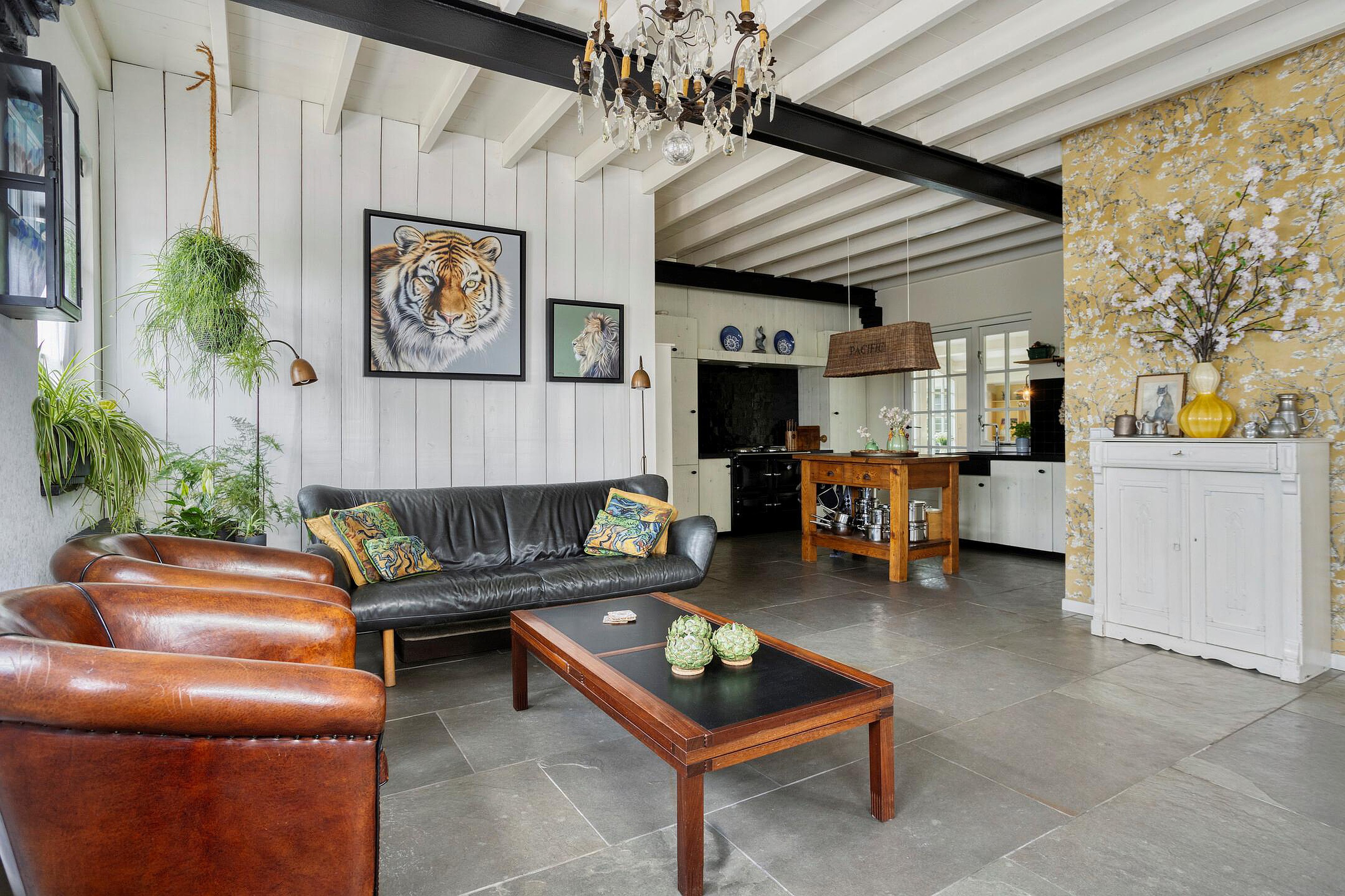 Een van de meest bijzondere ruimtes is de voormalige showroom van 45 m2, die zich uitstekend leent als werkruimte, atelier of speelkamer. Deze lichte, open ruimte met zichtbare balken en openslaande deuren naar de tuin biedt eindeloze mogelijkheden.