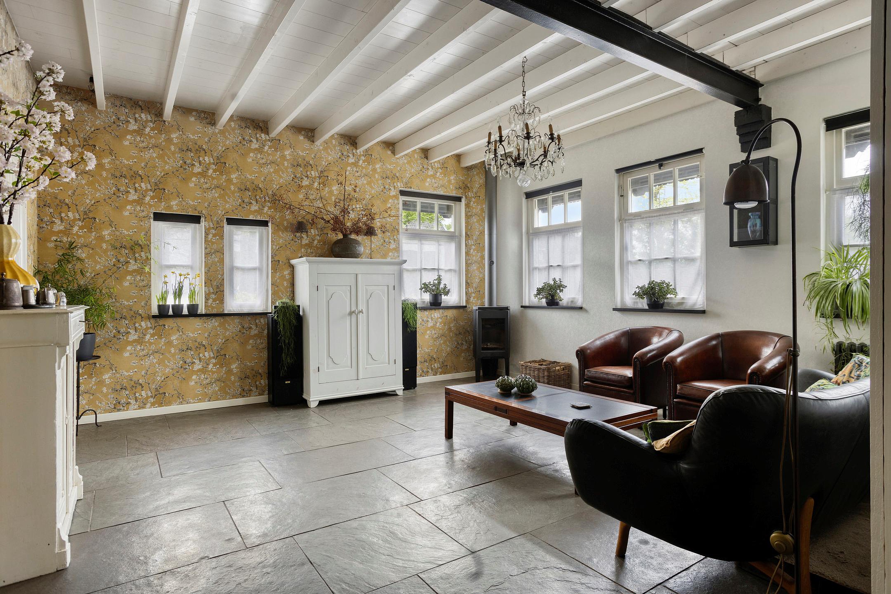 Bij binnenkomst betreedt u een hal die toegang geeft tot de woonkamer en de trap naar boven. De woonkamer valt direct op door de warme houten balken aan het plafond en de prachtige leistenen vloer met vloerverwarming. Hier staat ook een gezellige houtkachel voor sfeervolle avonden.