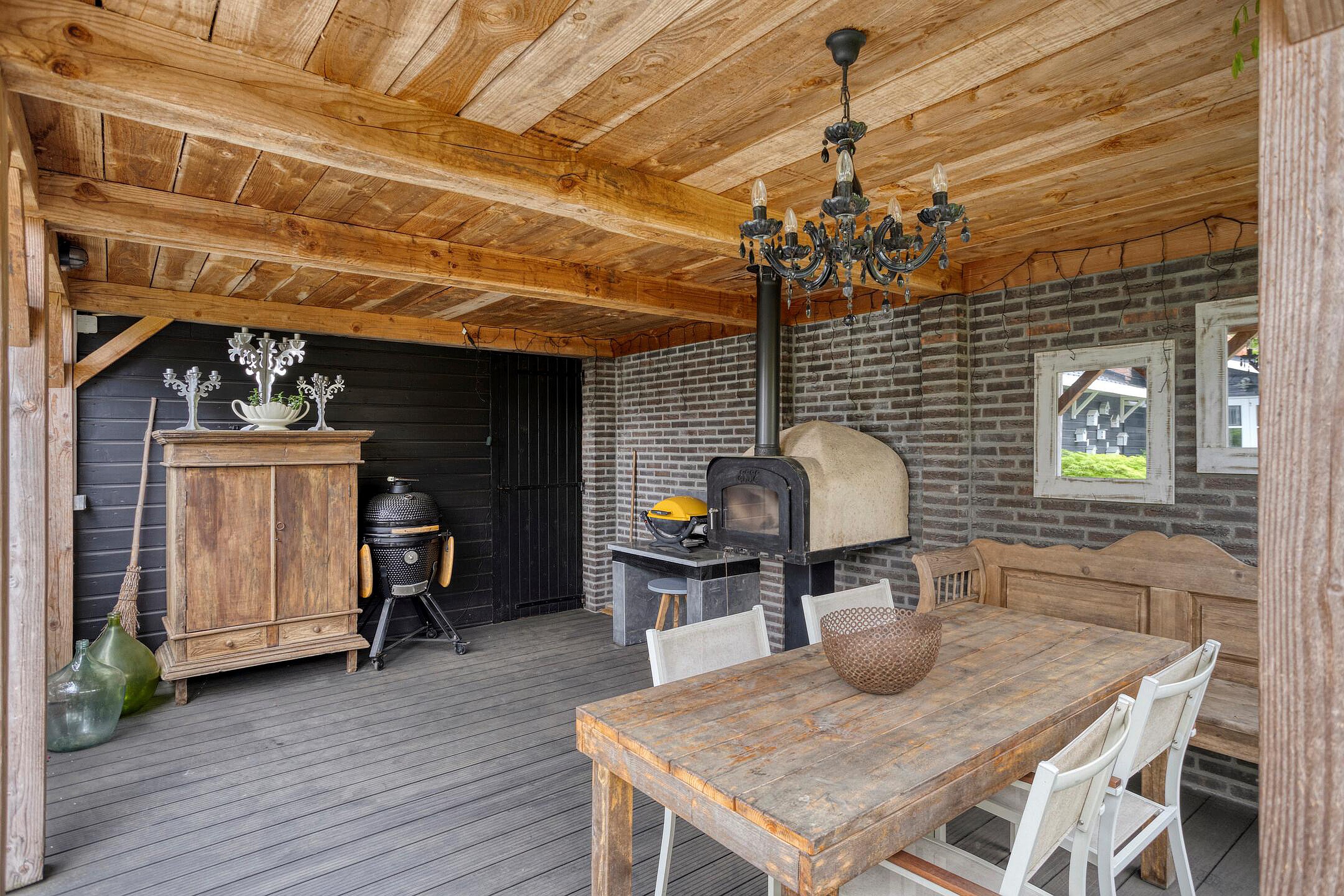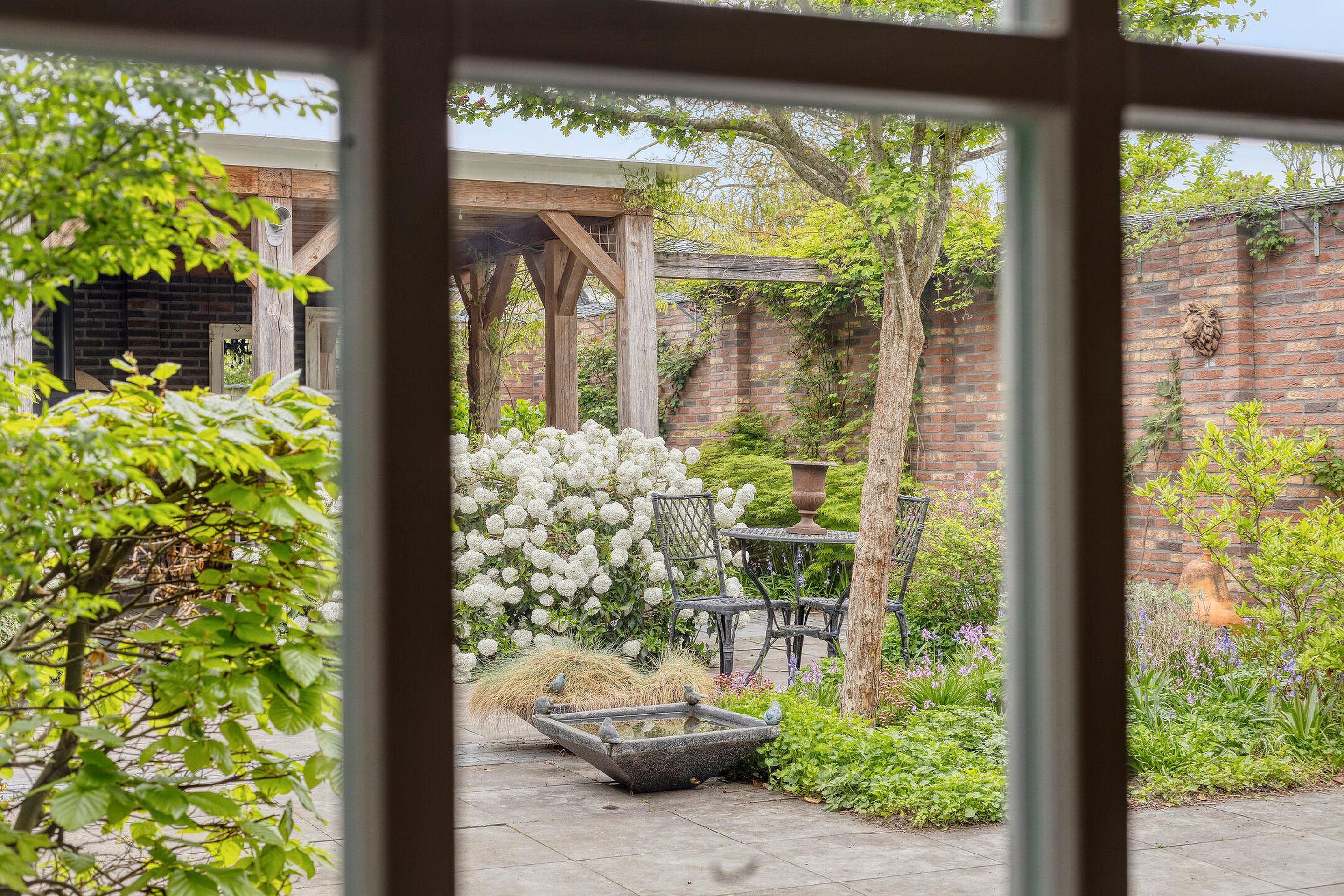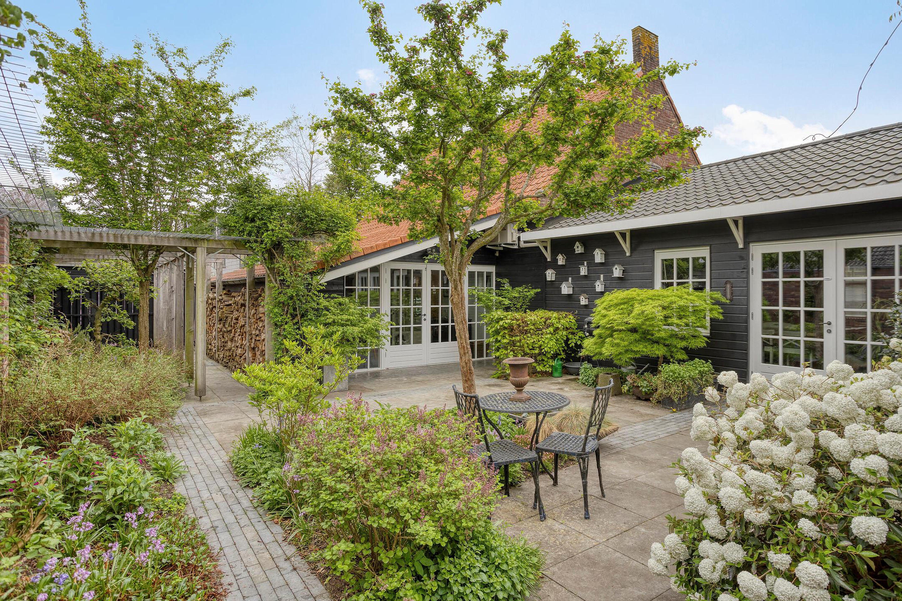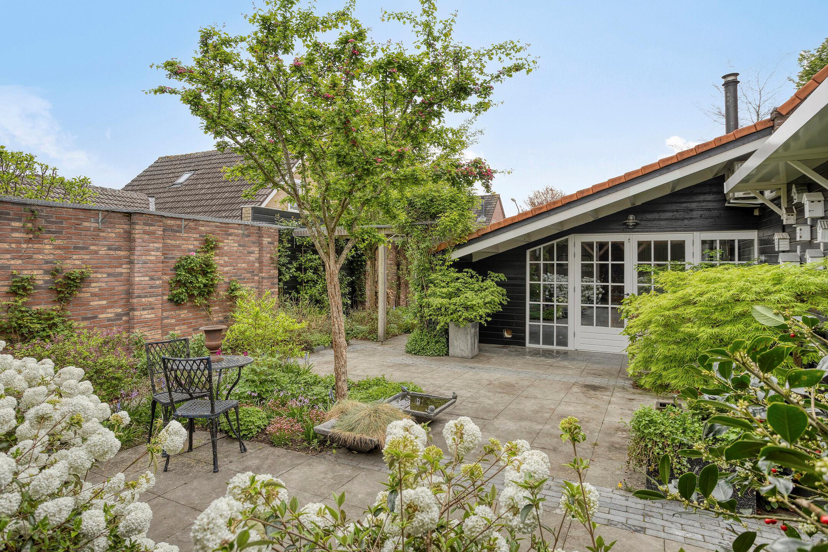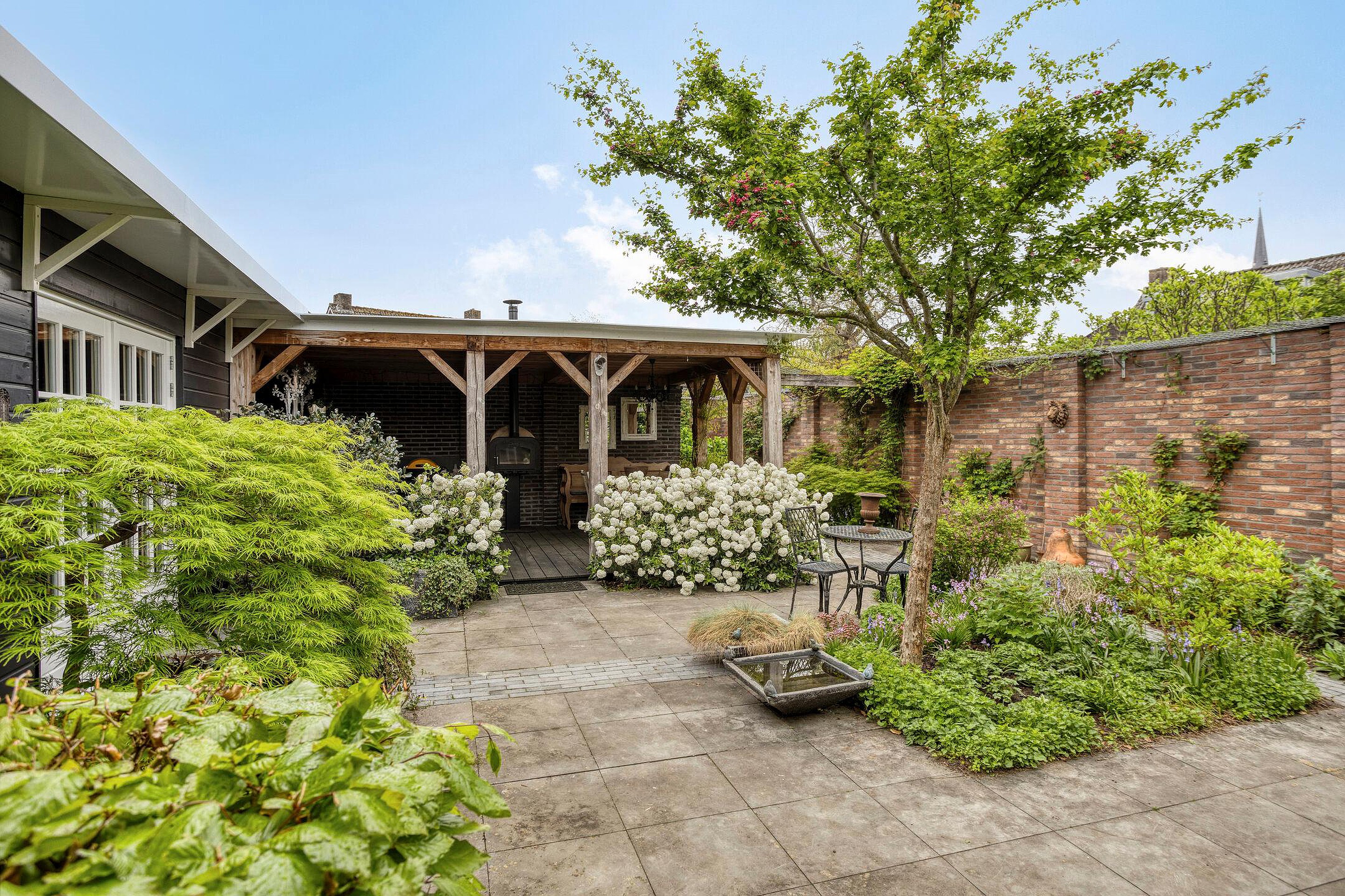 De woning heeft een prachtig aangelegde tuin met een overdekt terras, een pizzaoven en een houten vlonder. Het is een heerlijke plek om te ontspannen, omringd door borders en groen.