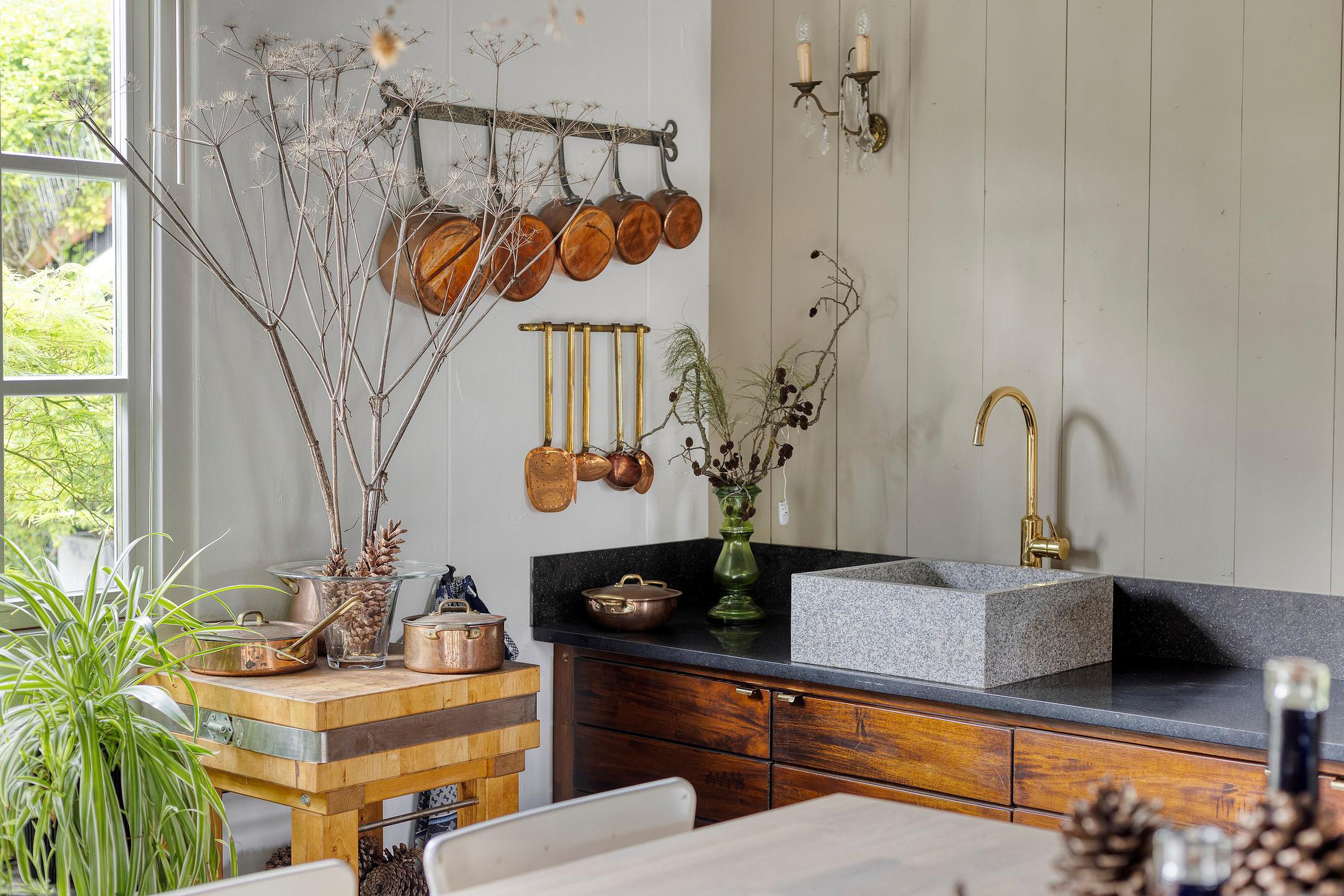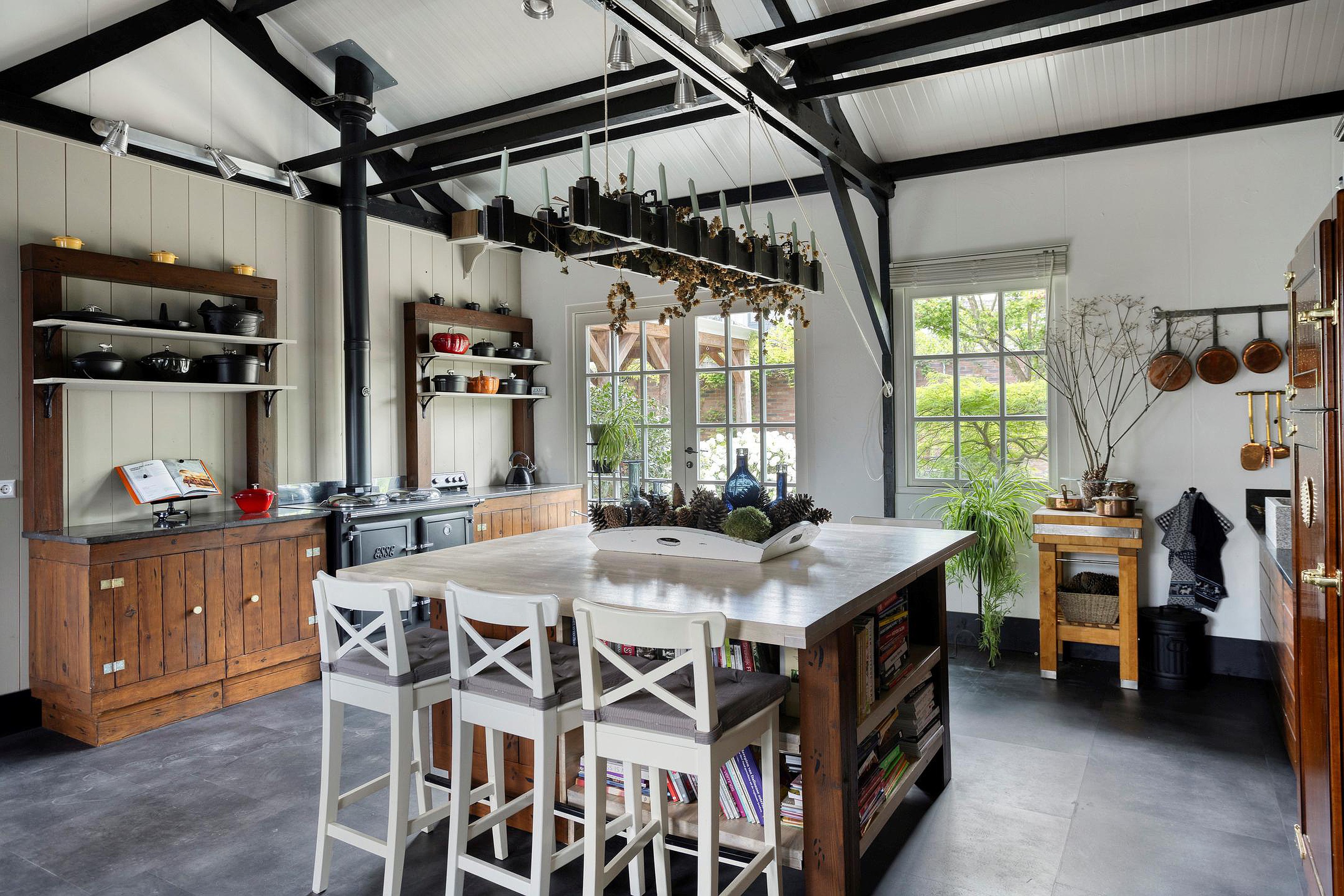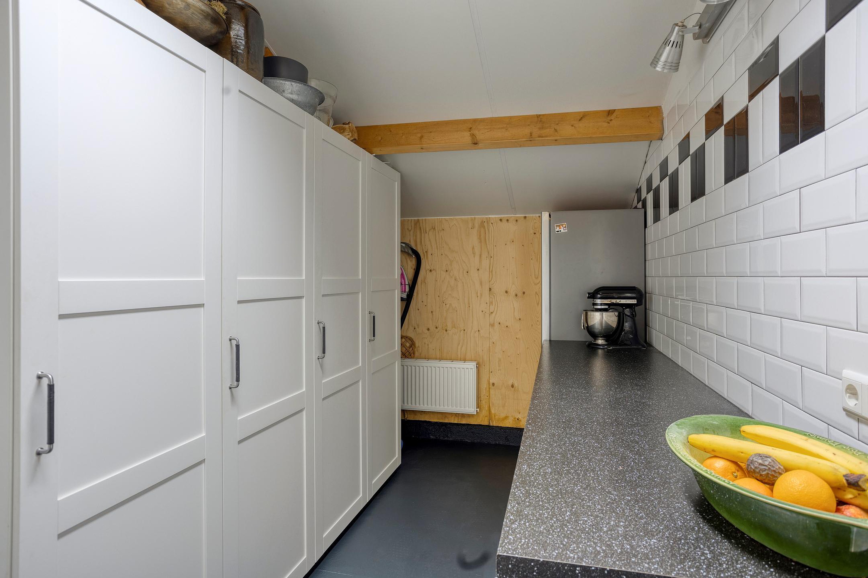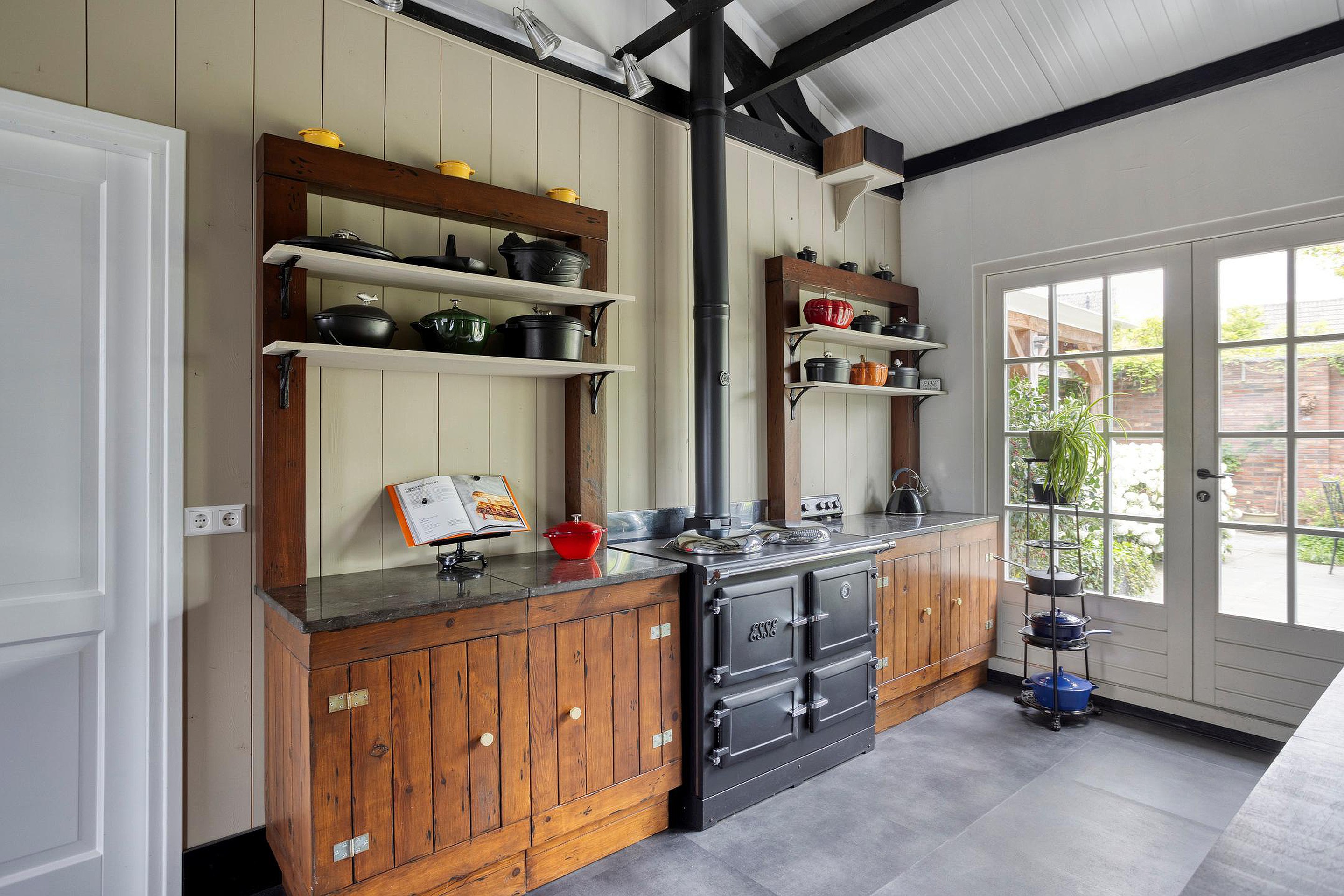 De keuken, in landelijke stijl, is voorzien van een Esse-fornuis, een Quooker en een granieten werkblad. Via de keuken komt u in de lichte eetkamer, die met openslaande deuren uitkomt op de tuin. In de bijkeuken vindt u praktische voorzieningen zoals wasmachine-aansluitingen en extra bergruimte.