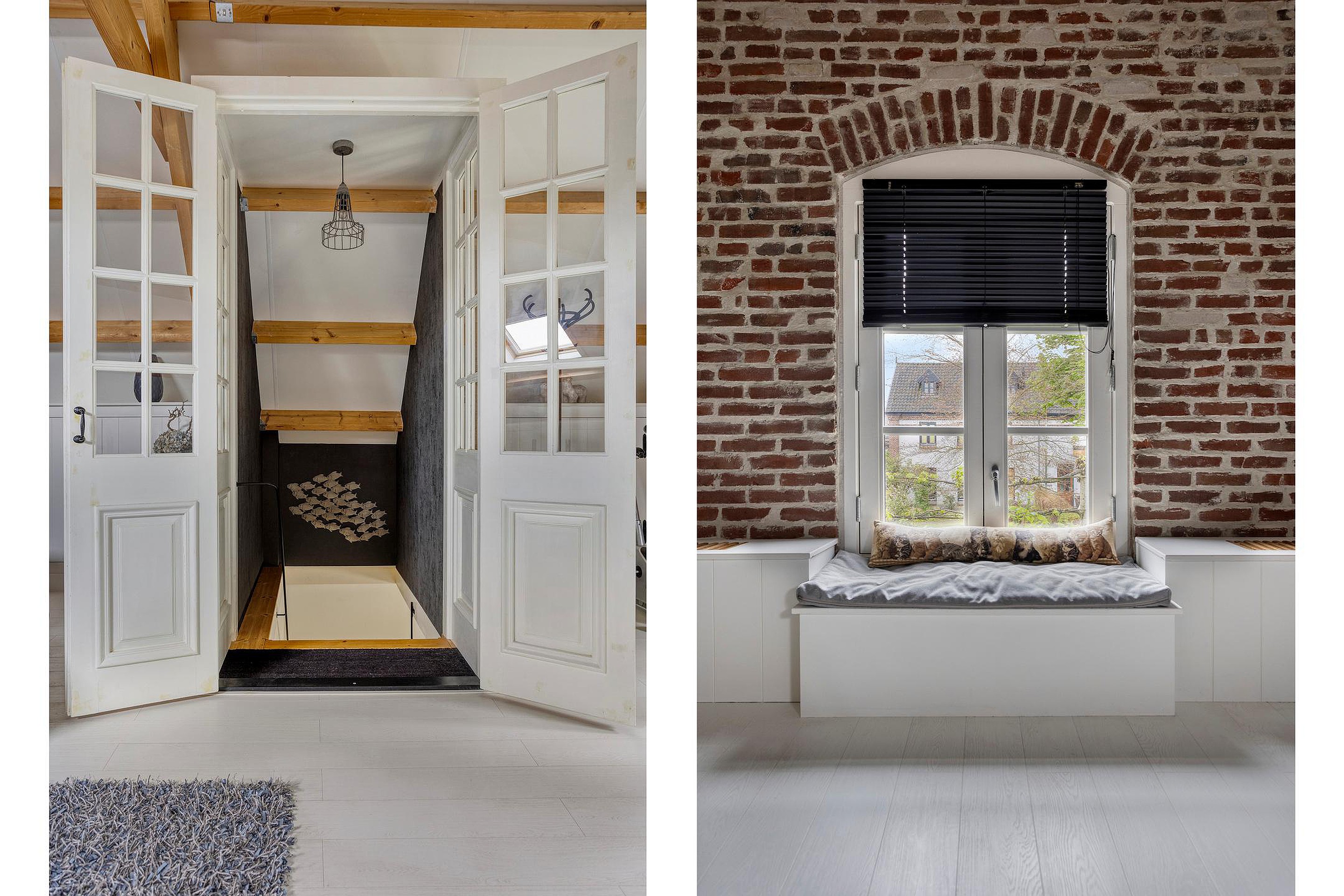 Op de begane grond bevindt zich ook een ruime slaapkamer en een moderne badkamer met inloopdouche. De voormalige showroom van 45 m2 is een echte blikvanger, met hoge plafonds, zichtbare balken en openslaande deuren naar buiten.