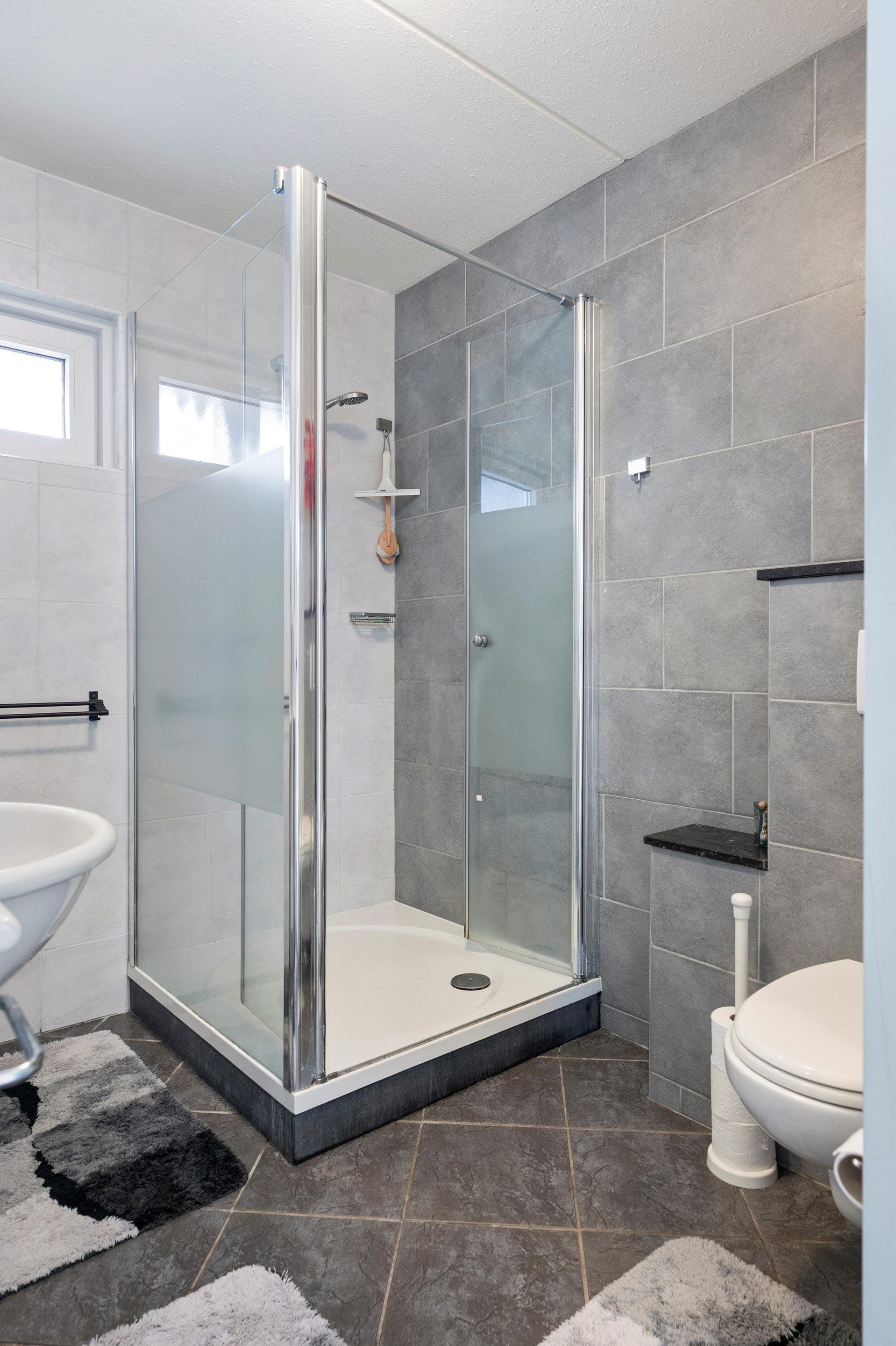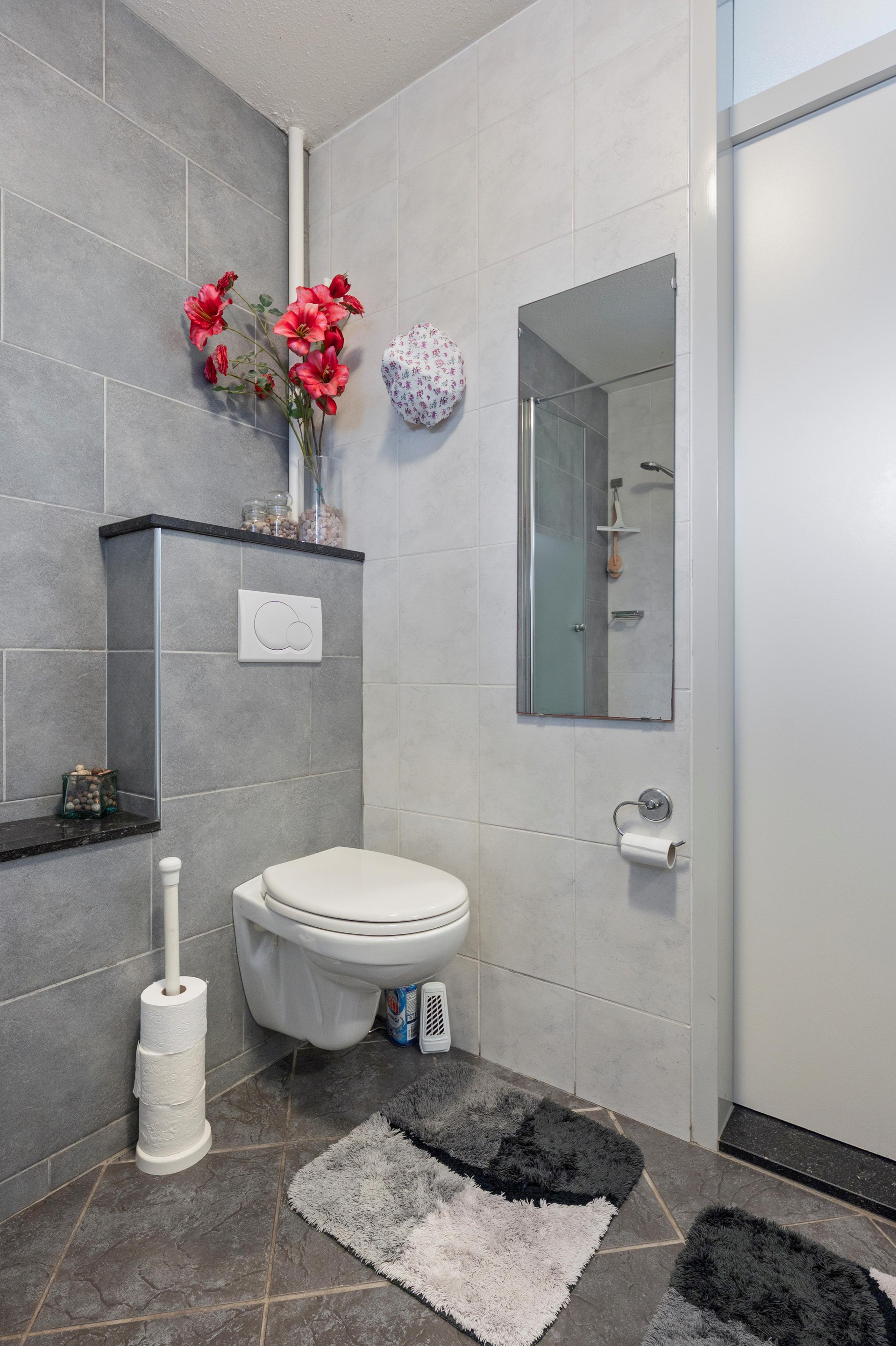 De moderne badkamer is voorzien van een douchecabine , twee wastafels met opbergmeubel en een toilet. Op 2 slaapkamers en de badkamer bevinden zich elektrische panelen.
