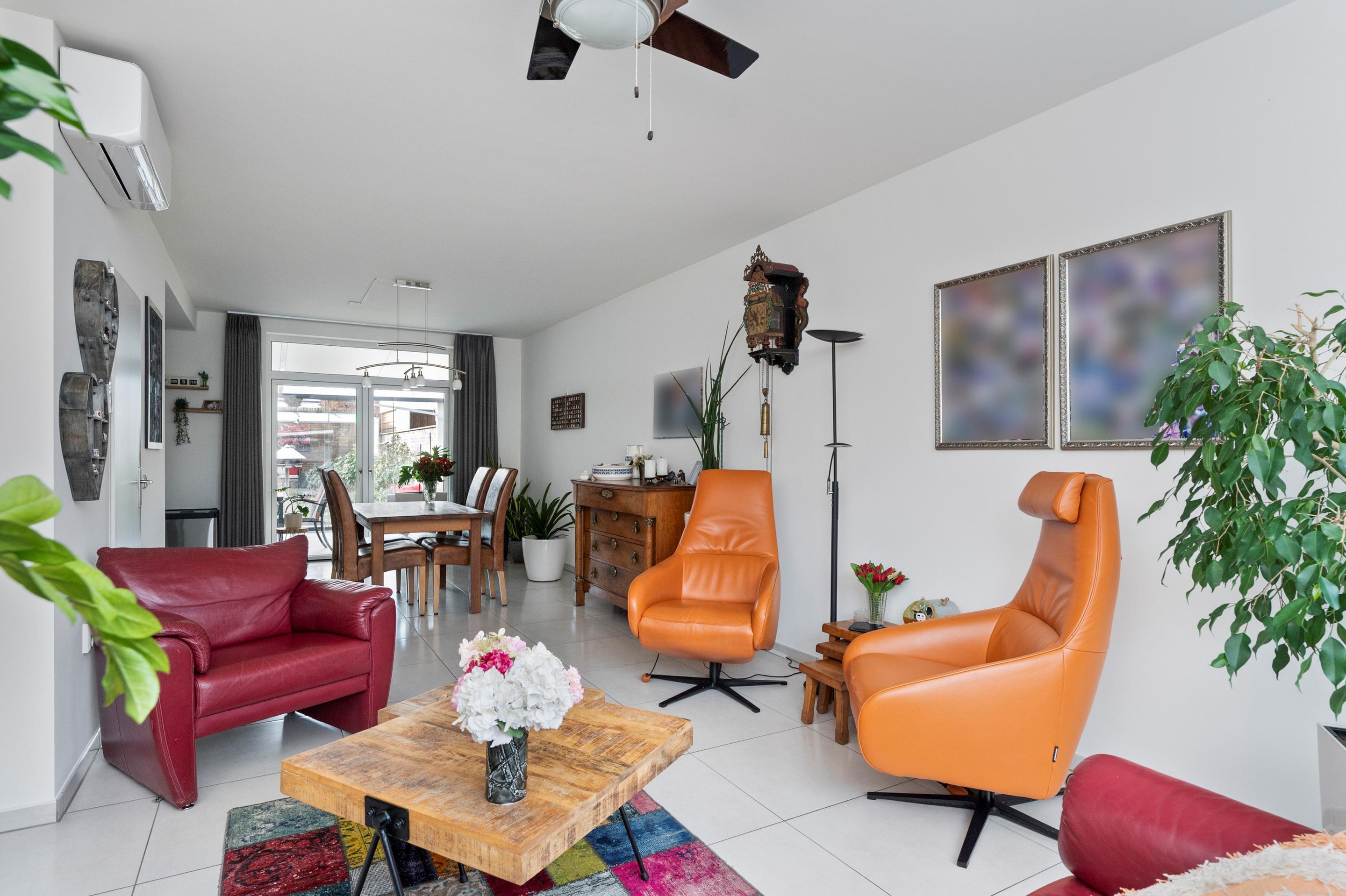 Lichte woon-eetkamer voorzien van een tegelvloer. In de woonkamer bevindt zich een airco-unit.