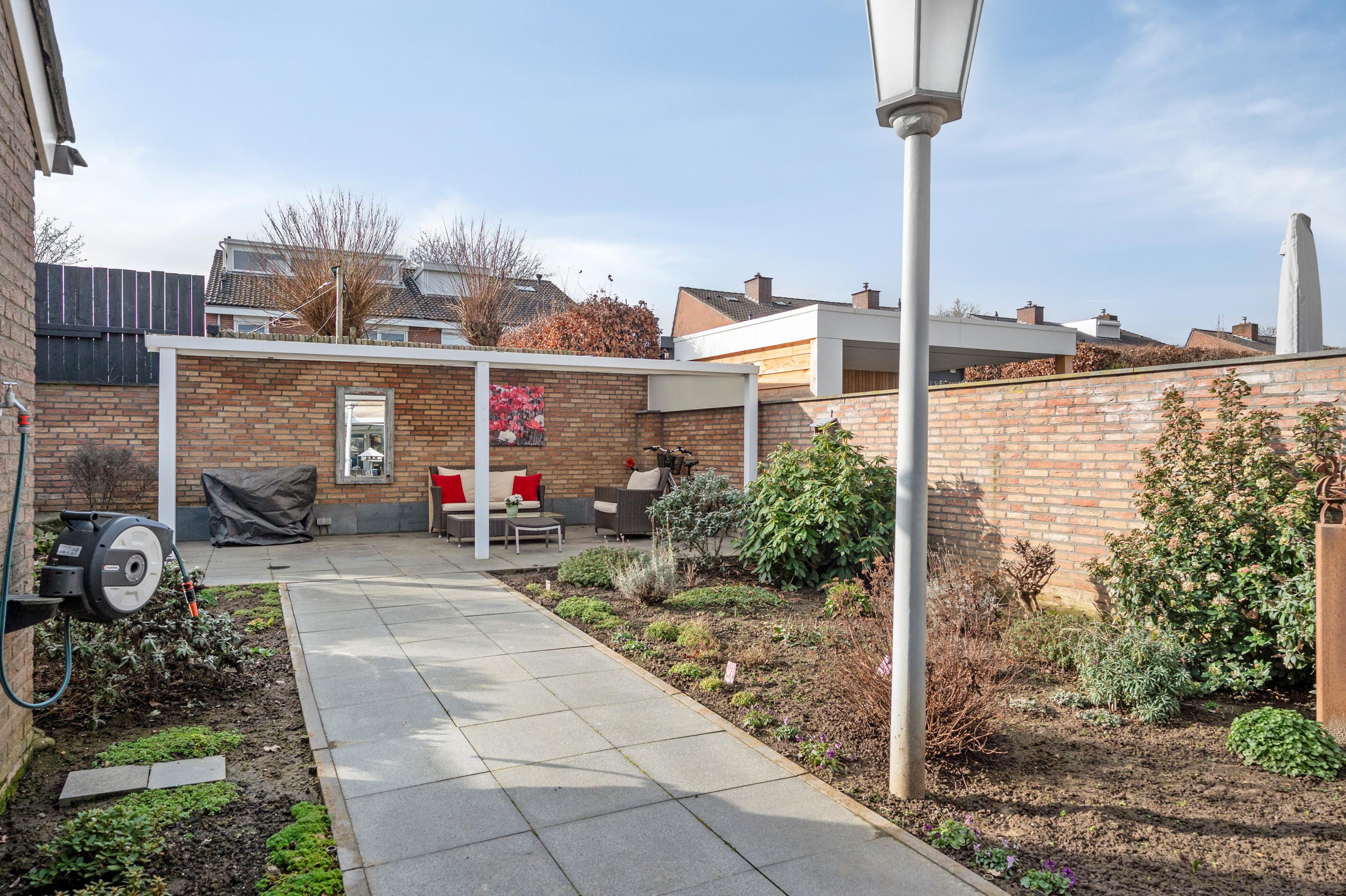 De volledig ommuurde tuin is keurig aangelegd en voorzien van een serre met glazen schuifwand. Achter in de tuin bevindt zich een terras met overkapping en aan beide zijden borders met beplanting.
