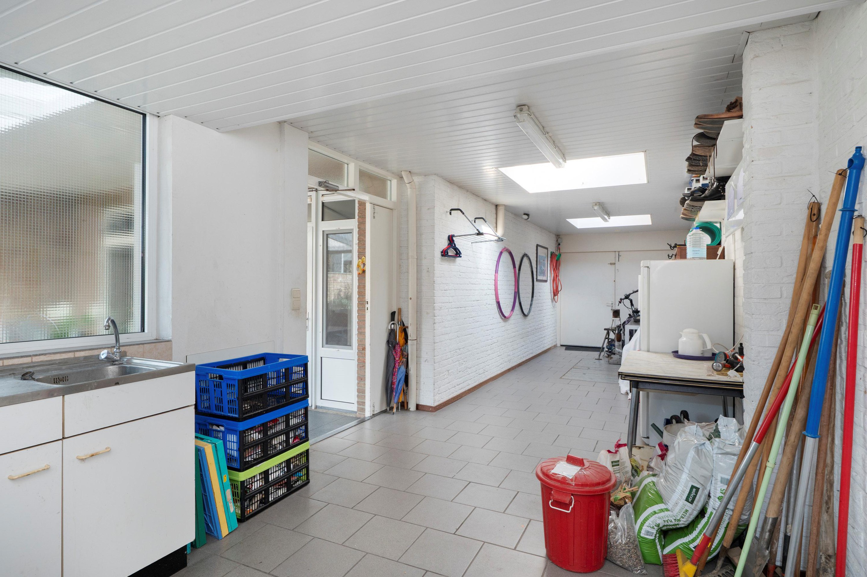 Vanuit de serre is de garage bereikbaar. Hier bevindt zich een eenvoudig keukenblok. Ook zijn hier de aansluitpunten voor de wasmachine/wasdroger. Middels een vlizotrap is de bovengelegen vliering toegankelijk. Aan de achterzijde bevindt zich nog een extra bergruimte.