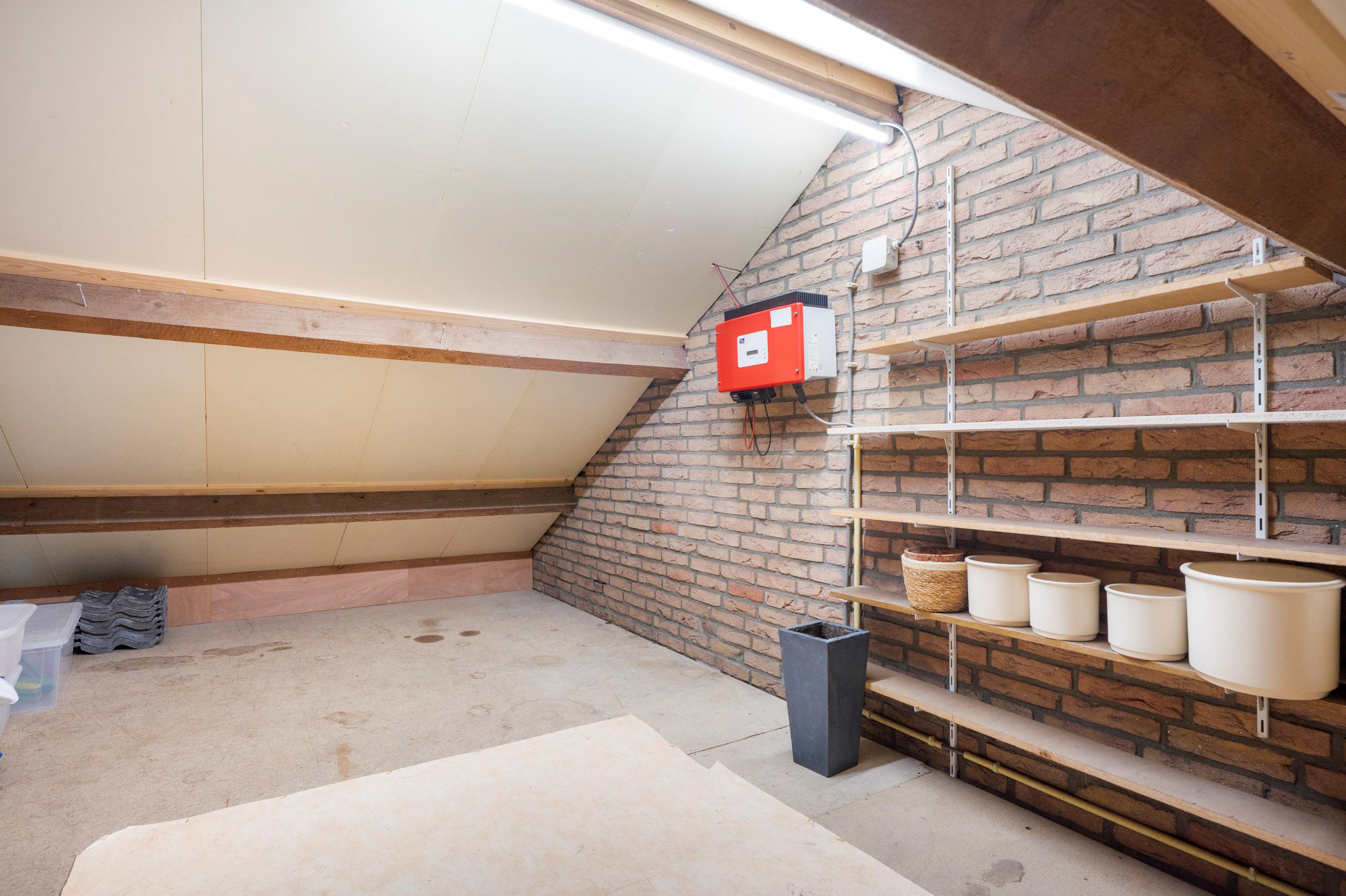 Middels een vaste trap is de zolder bereikbaar. De zolder is opgesplitst in 2 delen. Een deel bestaat uit 2 separate bergingen. Hier bevindt zich tevens de opstelplaats van de Cv-installatie. Middels een toegangsdeur is de ruime 4e slaapkamer bereikbaar. Deze kamer is voorzien van een dakraam.