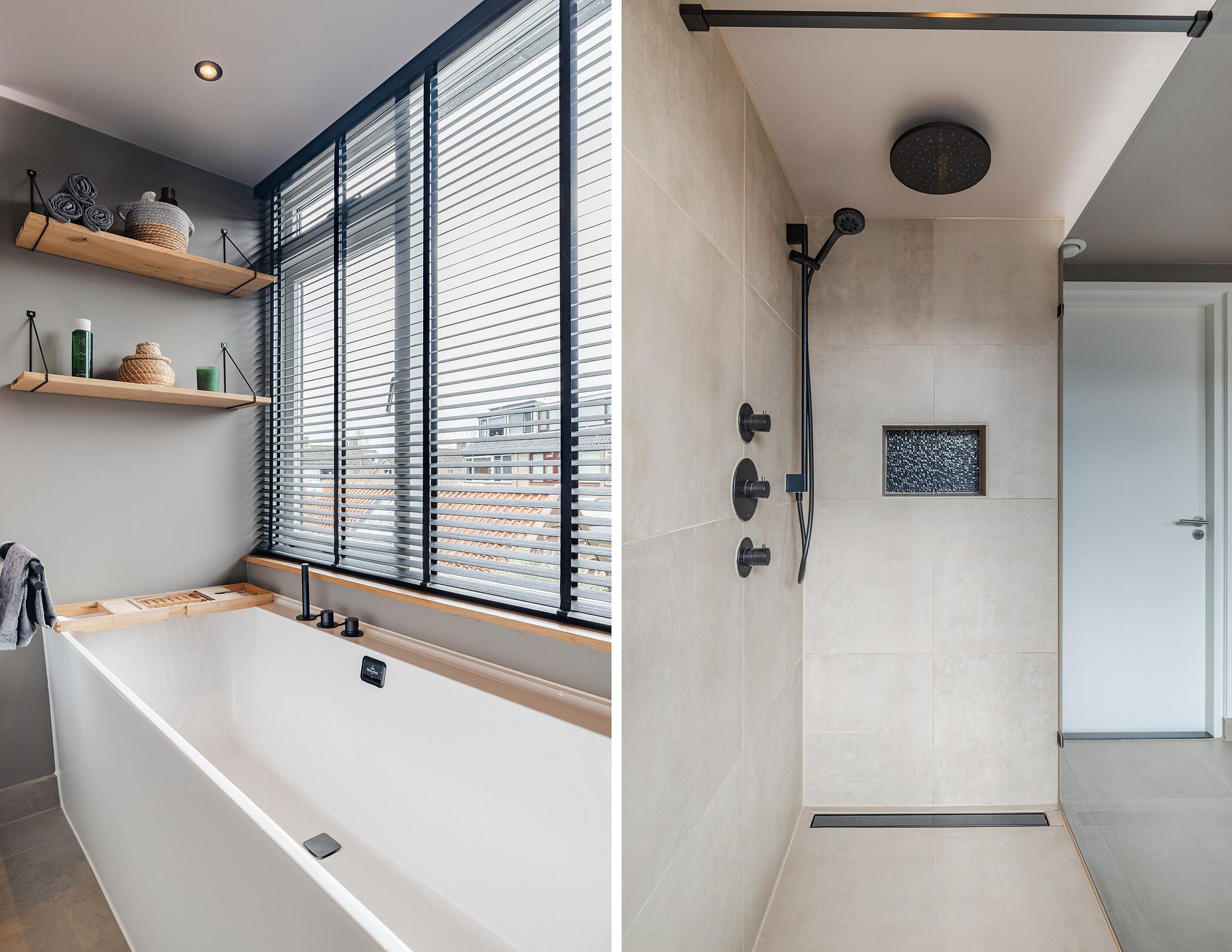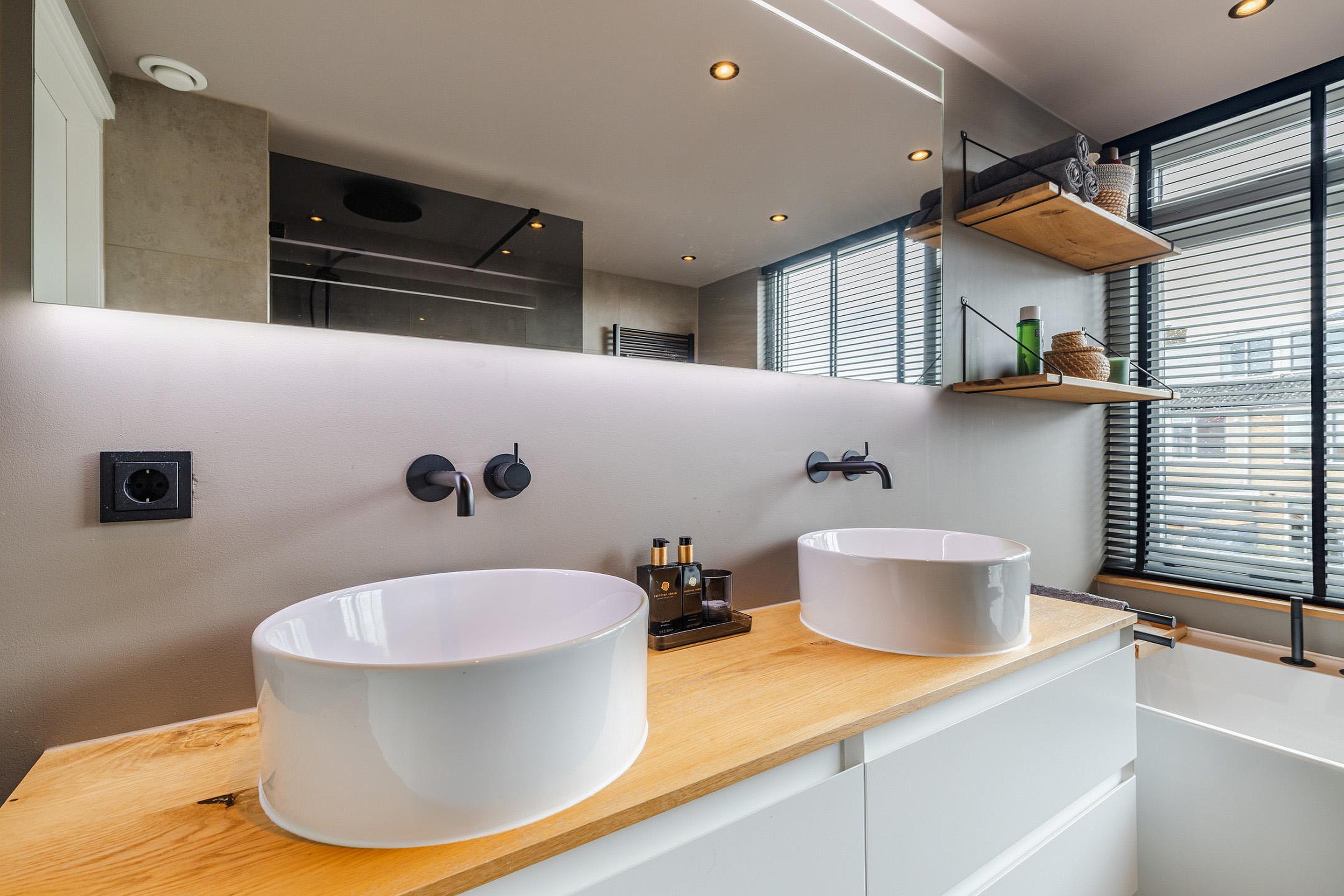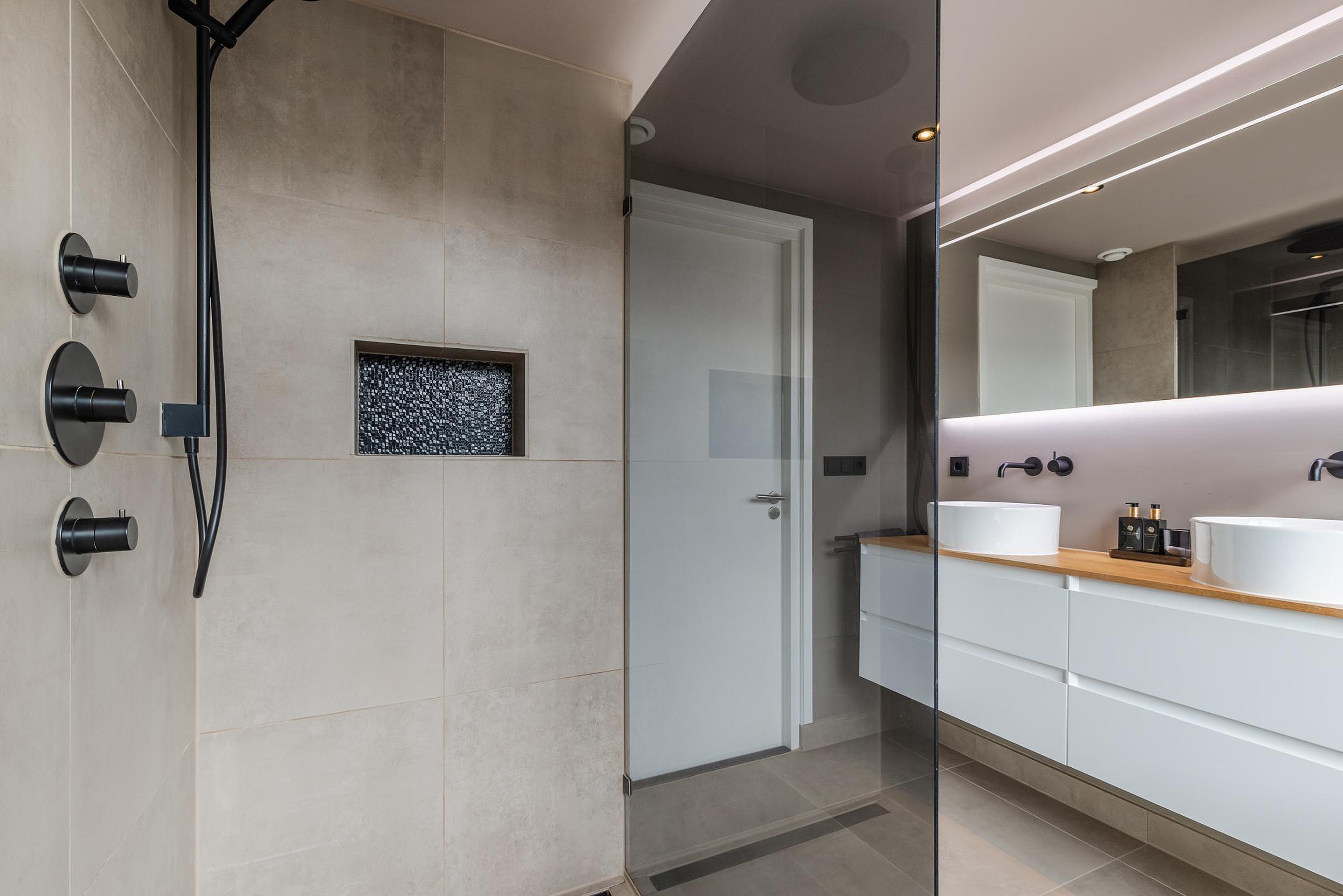Een moderne badkamer (2021) met ligbad, inloopdouche en een dubbel wastafelmeubel.