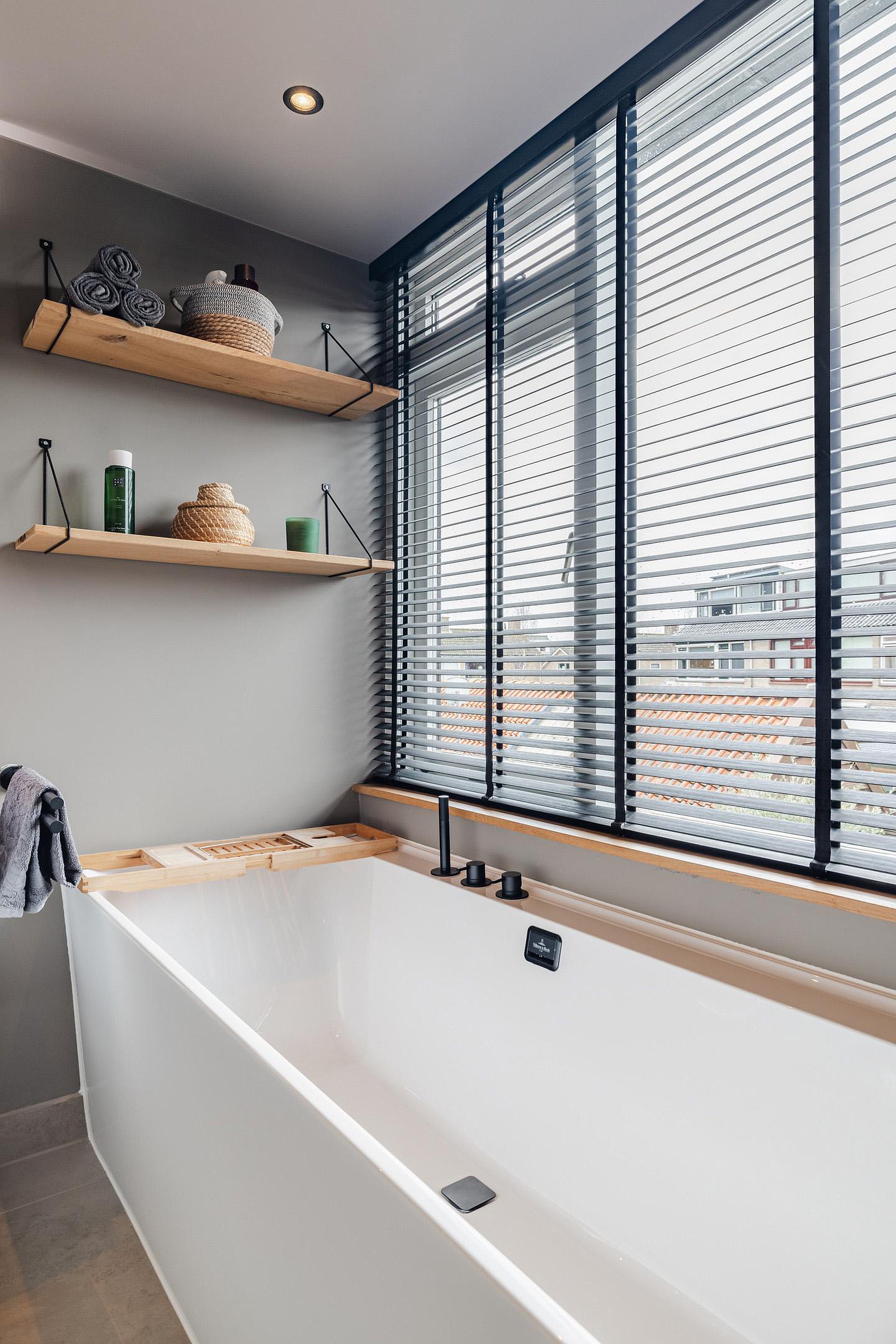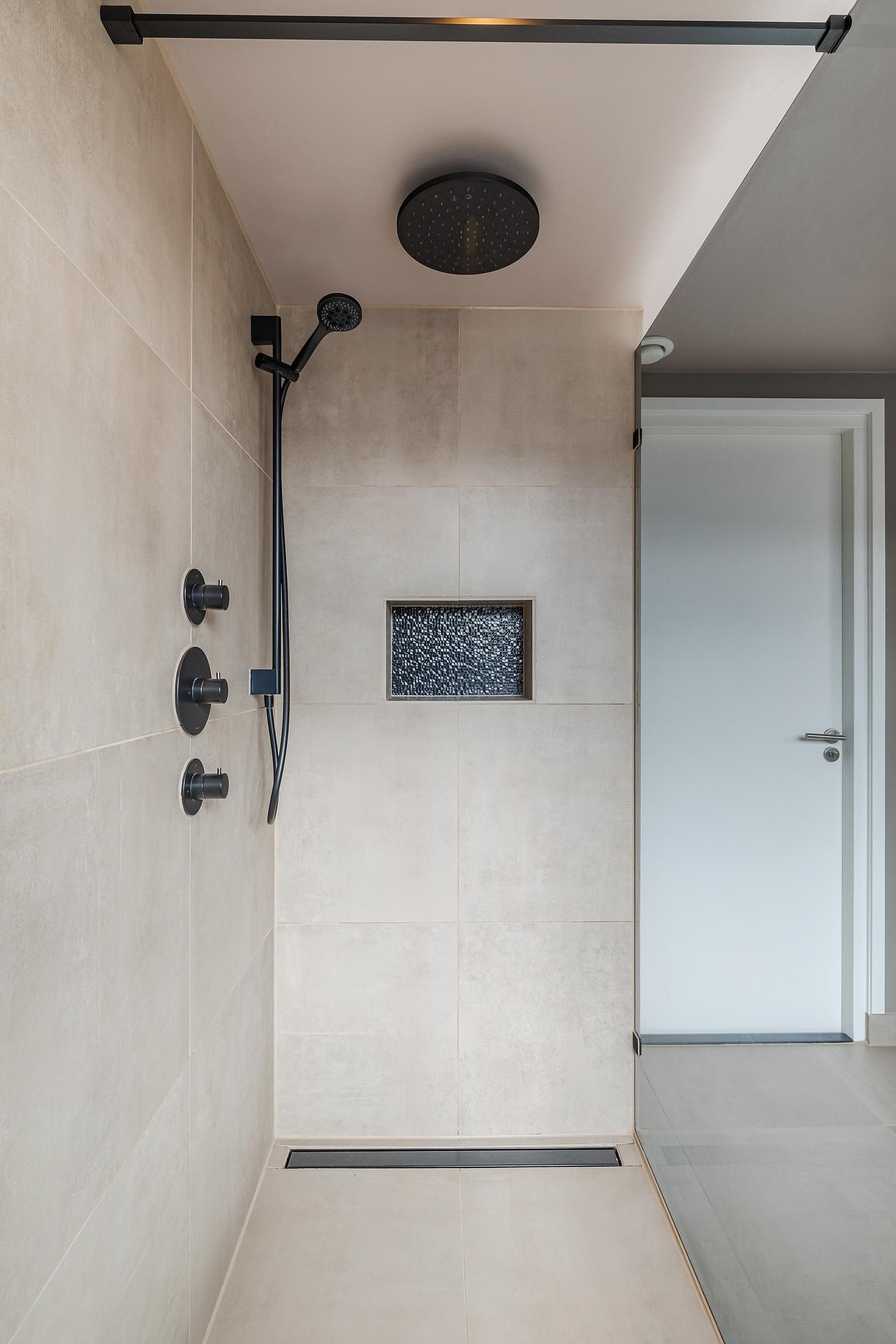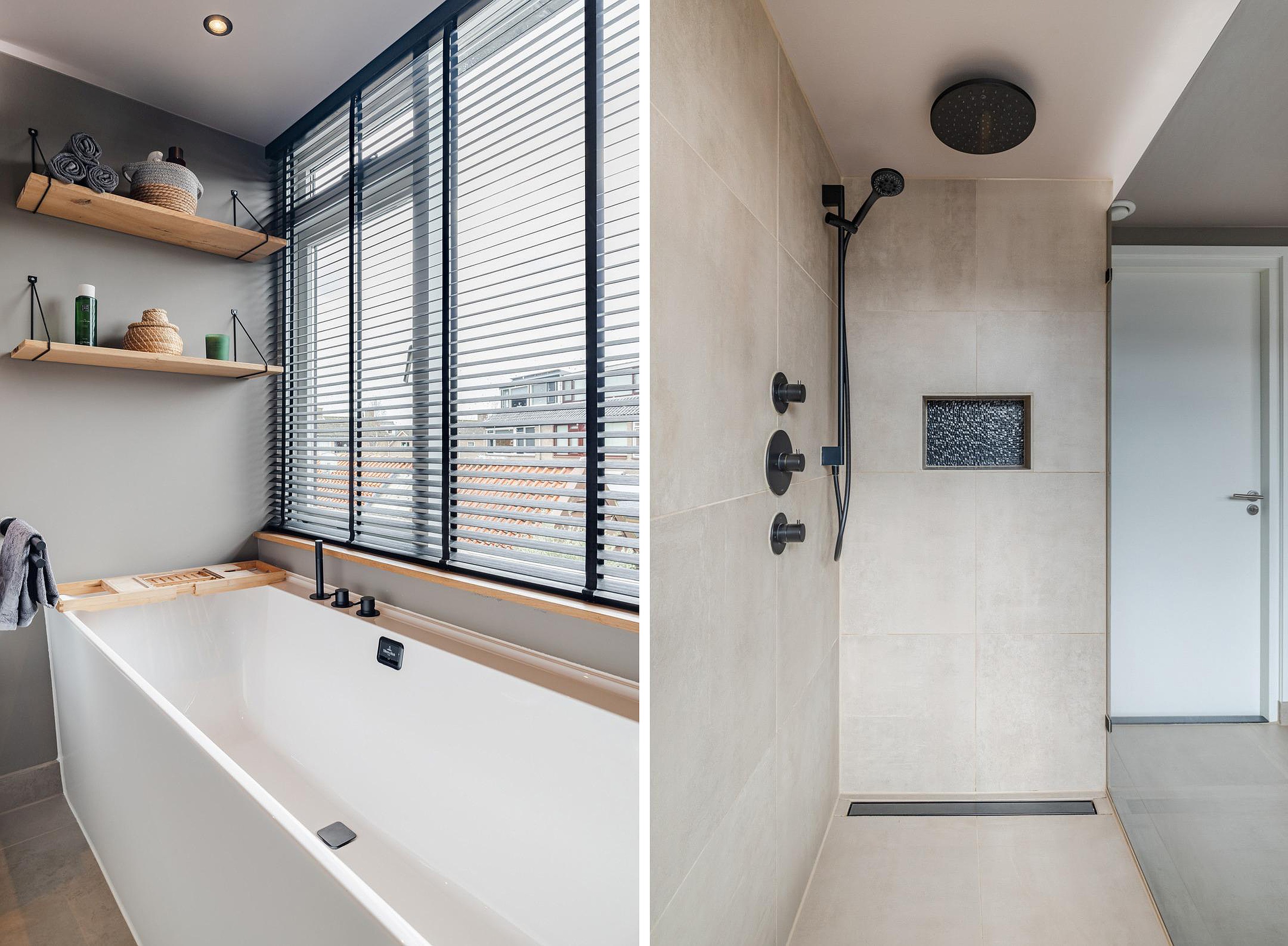 Een moderne badkamer (2021) met ligbad, inloopdouche en een dubbel wastafelmeubel.