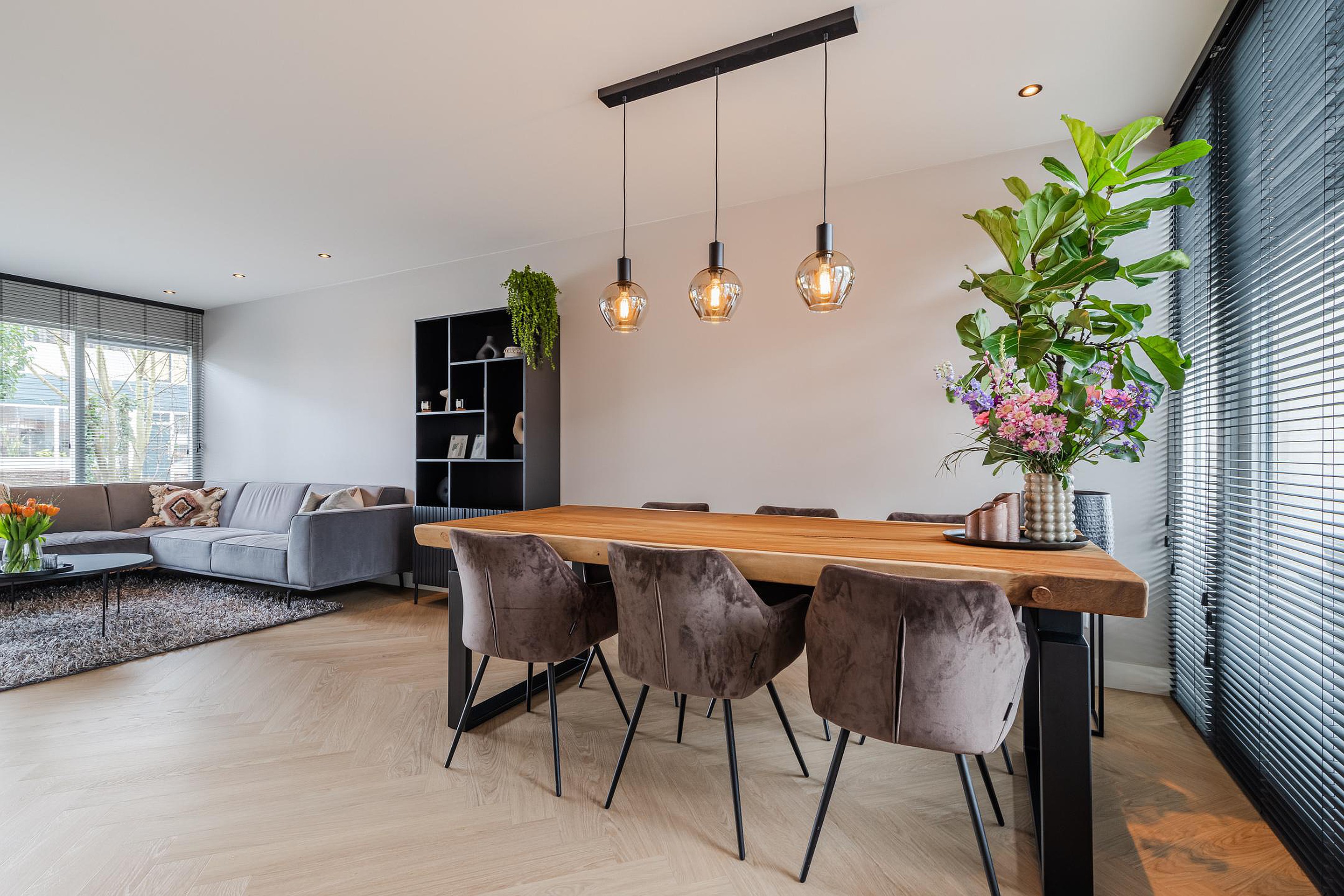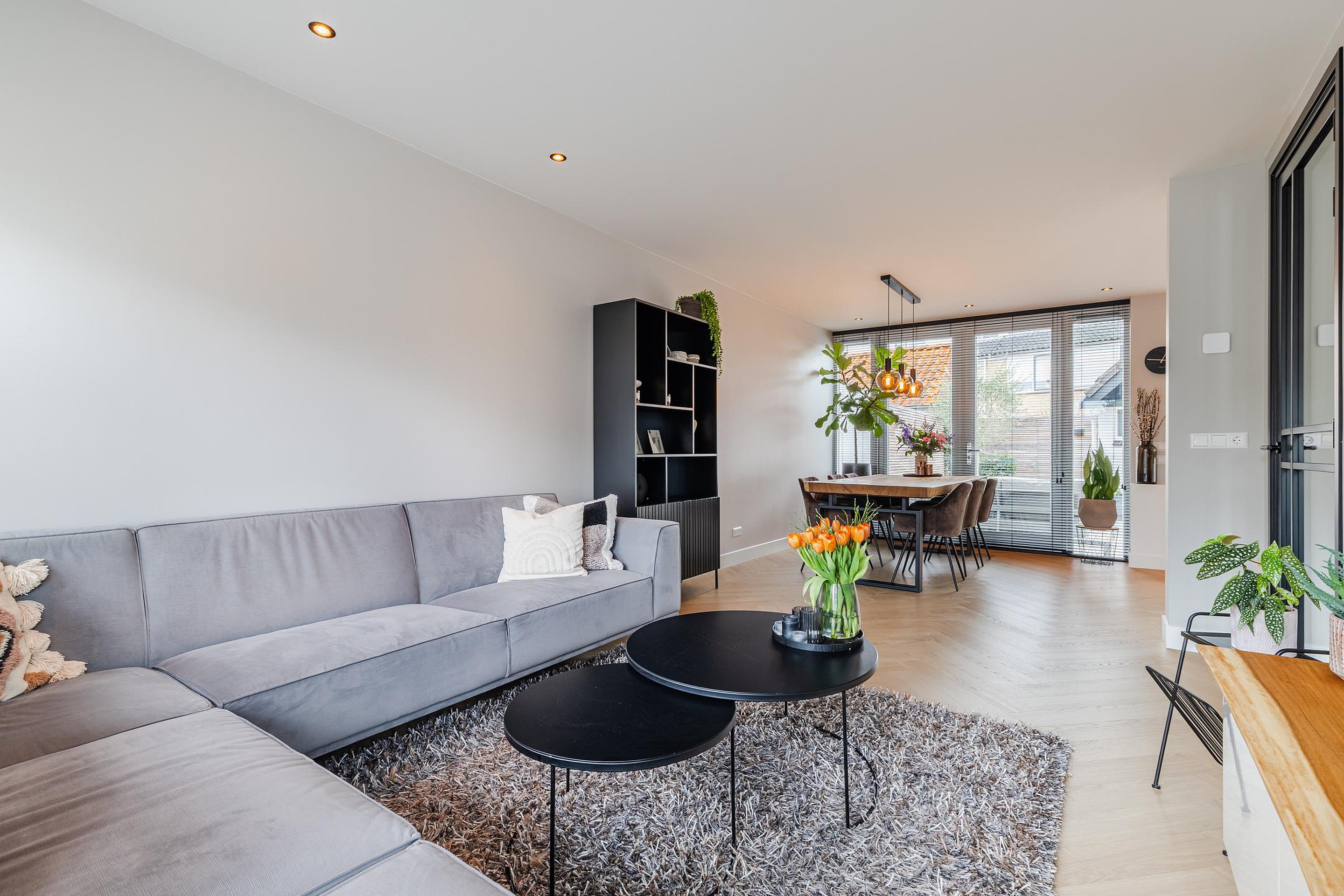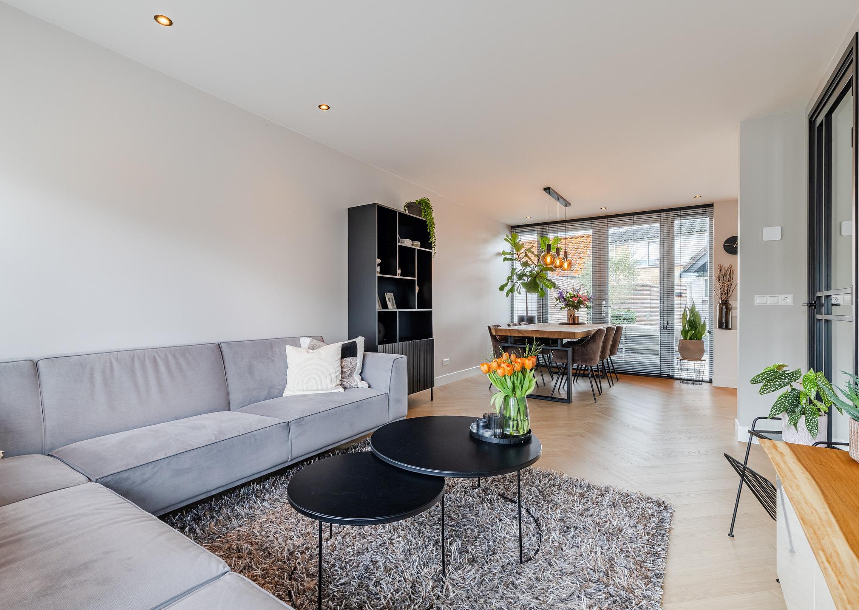 Lichte doorzon woonkamer met vloerwarming en openslaande deuren naar de tuin.