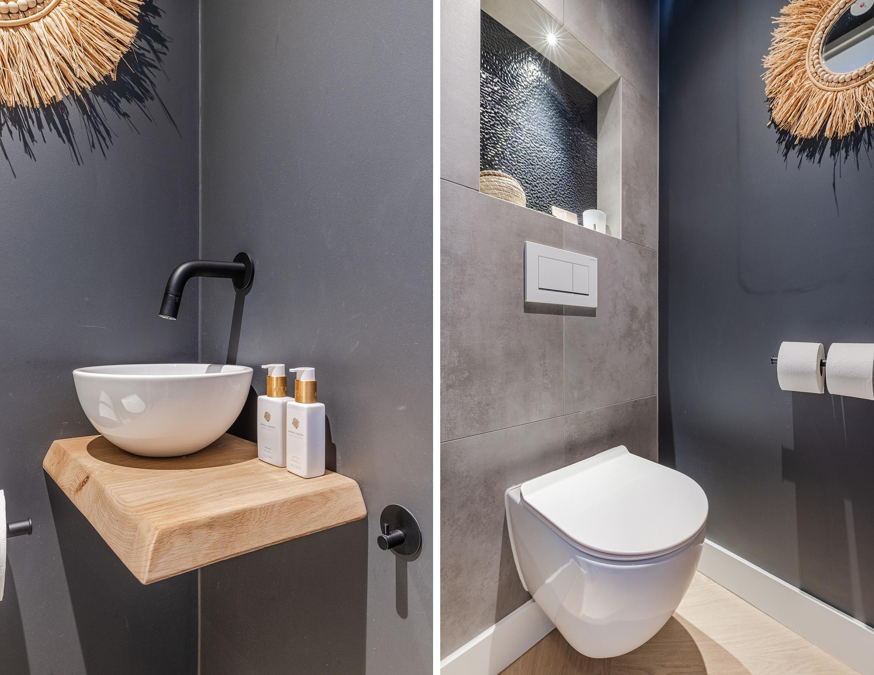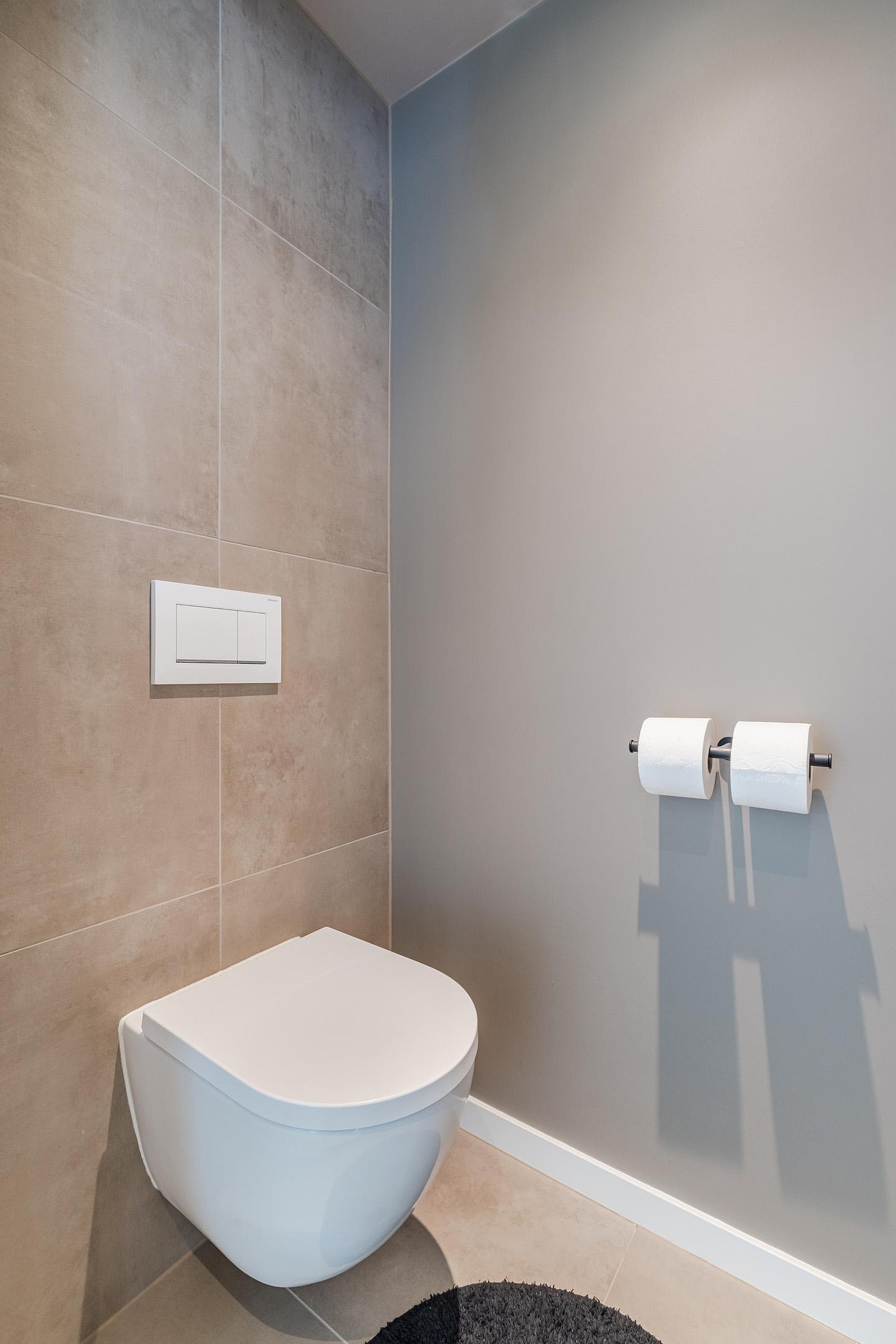 Een modern toilet (2021) met vrijdragend toilet en fontein.