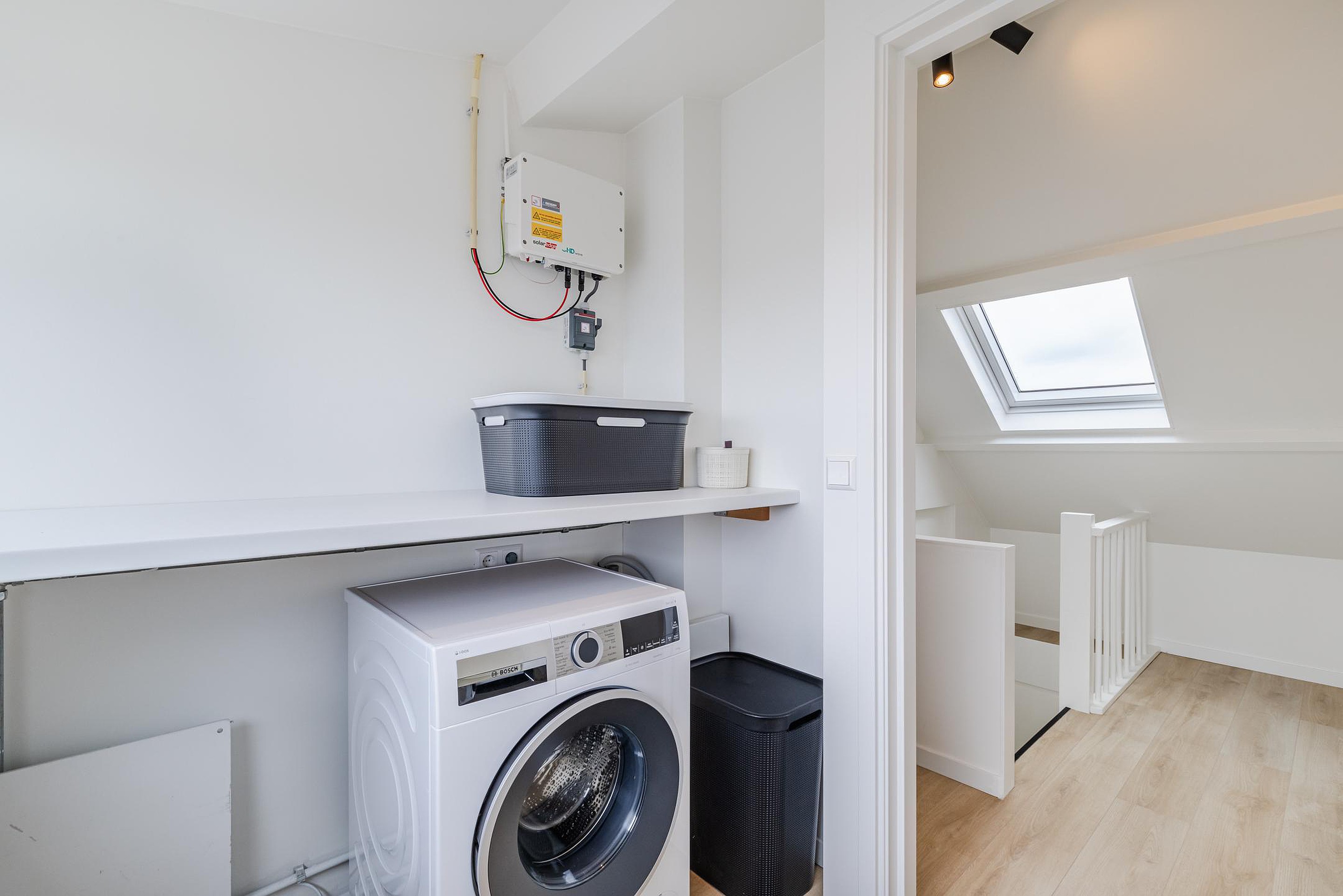 Via de entree van de woning komt u in de hal met meterkast, toiletruimte en vaste trap naar de 1e verdieping. Het moderne toilet is voorzien van een vrijdragend toilet en moderne wasbak en fontein. Via een mooie industriële glazen deur komt u in de lichte doorzon woonkamer met behaaglijke vloerverwarming. De openslaande deuren geven toegang tot de zonnige achtertuin. De luxe en moderne uitgebouwde keuken heeft mooie lichtinval door de lichtkoepel en de vele ramen en is voorzien van alle gemakken. U vindt hier een Quooker, inductiekookplaat, combioven, vaatwasser en een koel-vriescombinatie. Via een deur kunt u hier ook naar de tuin. De vaste trap in de hal brengt u naar de 1e verdieping met een overloop, 2 slaapkamers, een badkamer en een toiletruimte. De slaapkamer aan de voorzijde heeft een mooie inloopkast en een fijn dakterras. Aan de achterzijde is nog een ruime slaapkamer. De moderne badkamer heeft een ligbad, een heerlijke inloopdouche en een prachtig dubbel wastafelmeubel. De aparte toiletruimte heeft een vrijdragend toilet.