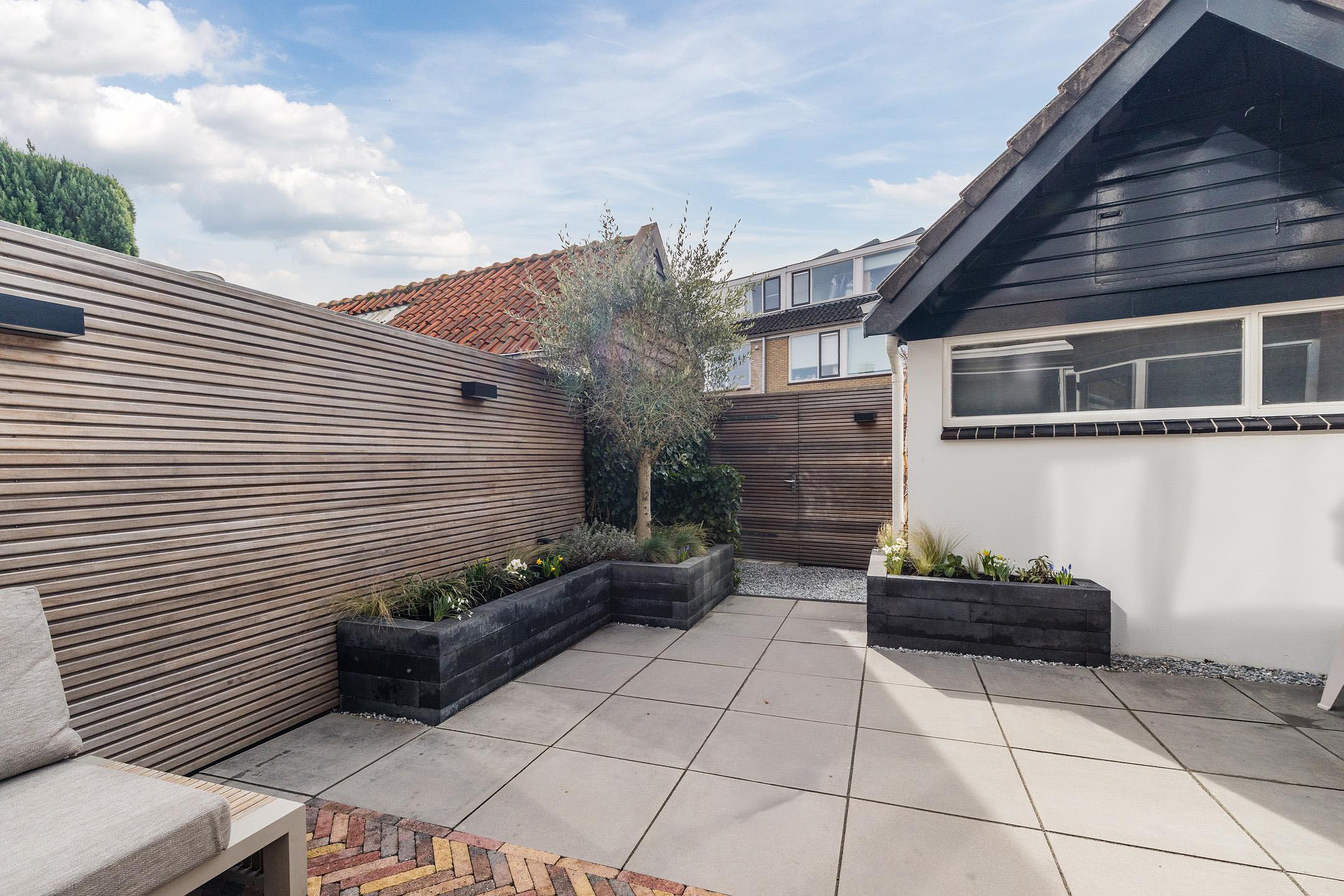De voortuin is mooi bestraat en heeft leuke bloembakken met boompjes en beplanting. De op het zuidwesten gelegen achtertuin is voorzien van mooie grote tegels, sierbestrating en bakken met groenbeplanting. Er is veel terrasruimte en u kunt hier heerlijk genieten van de zon. Achterin de tuin staat een vrijstaande ruime stenen berging en u heeft ook een achterom.