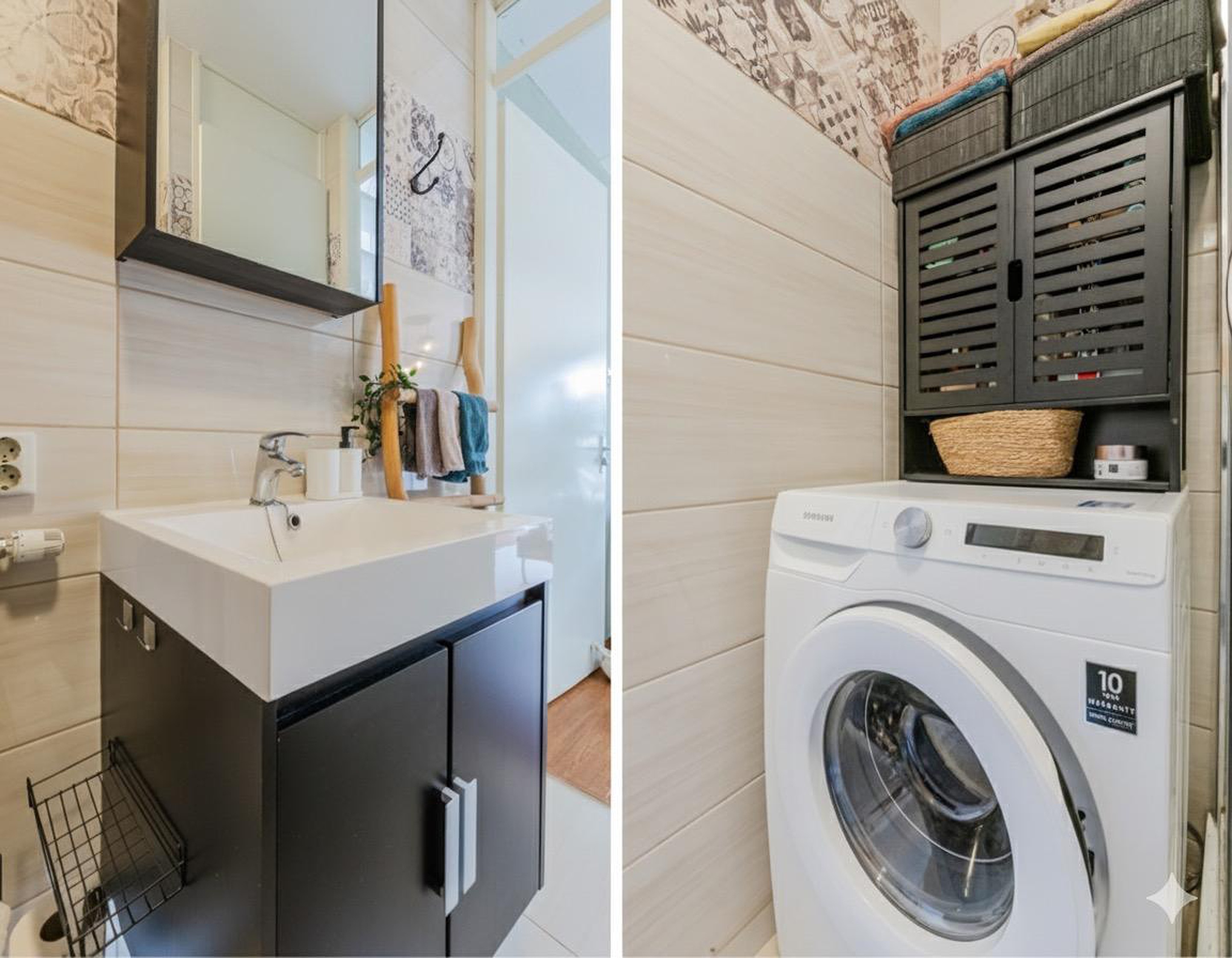 douche, hangend toilet en ruimte voor wasmachine/droger. Daarnaast vind je op de