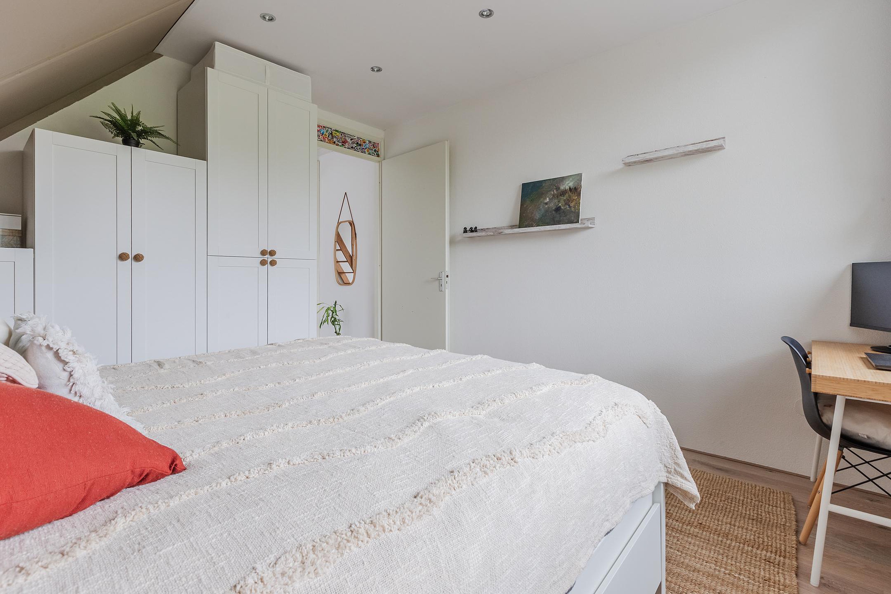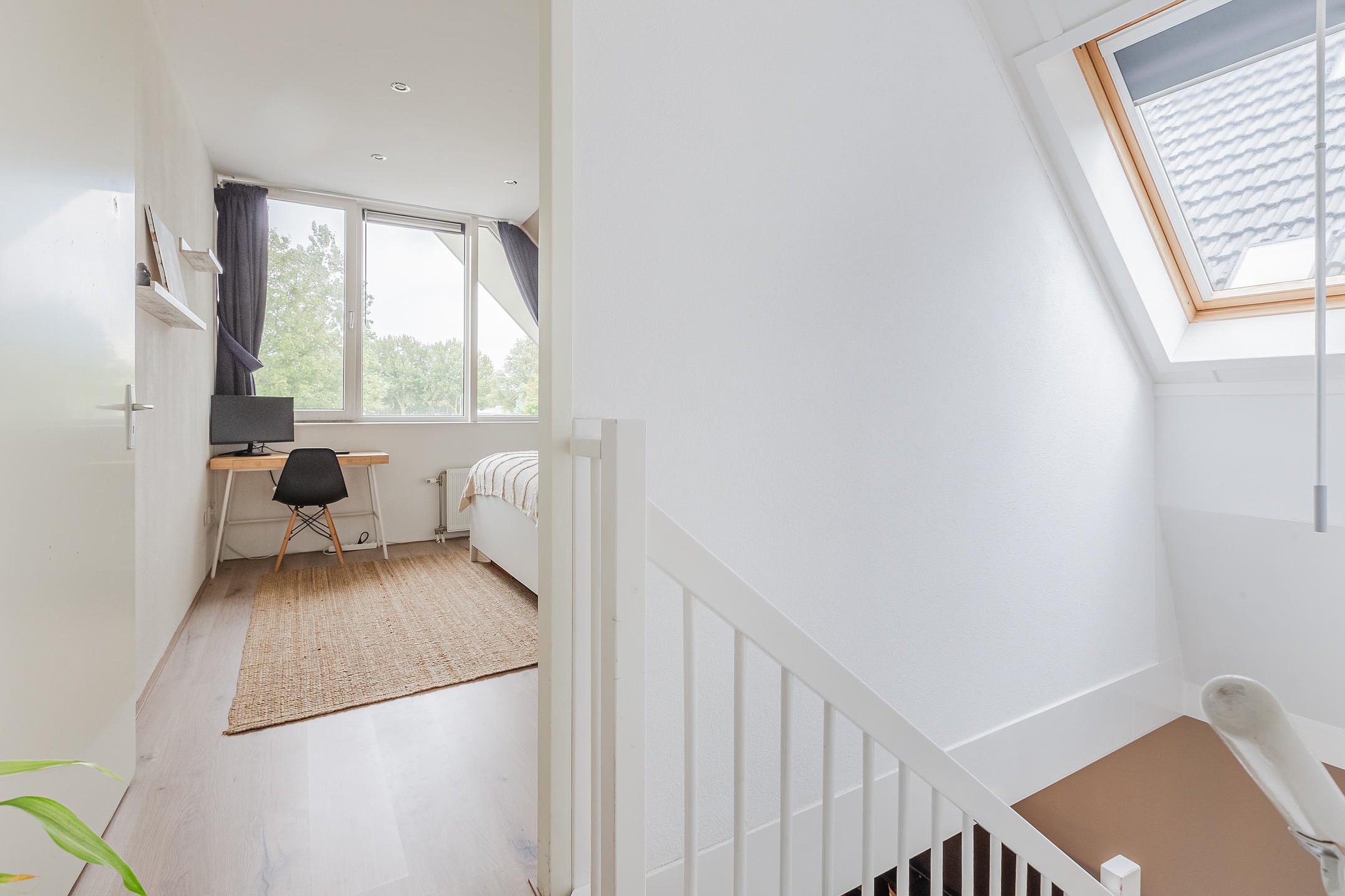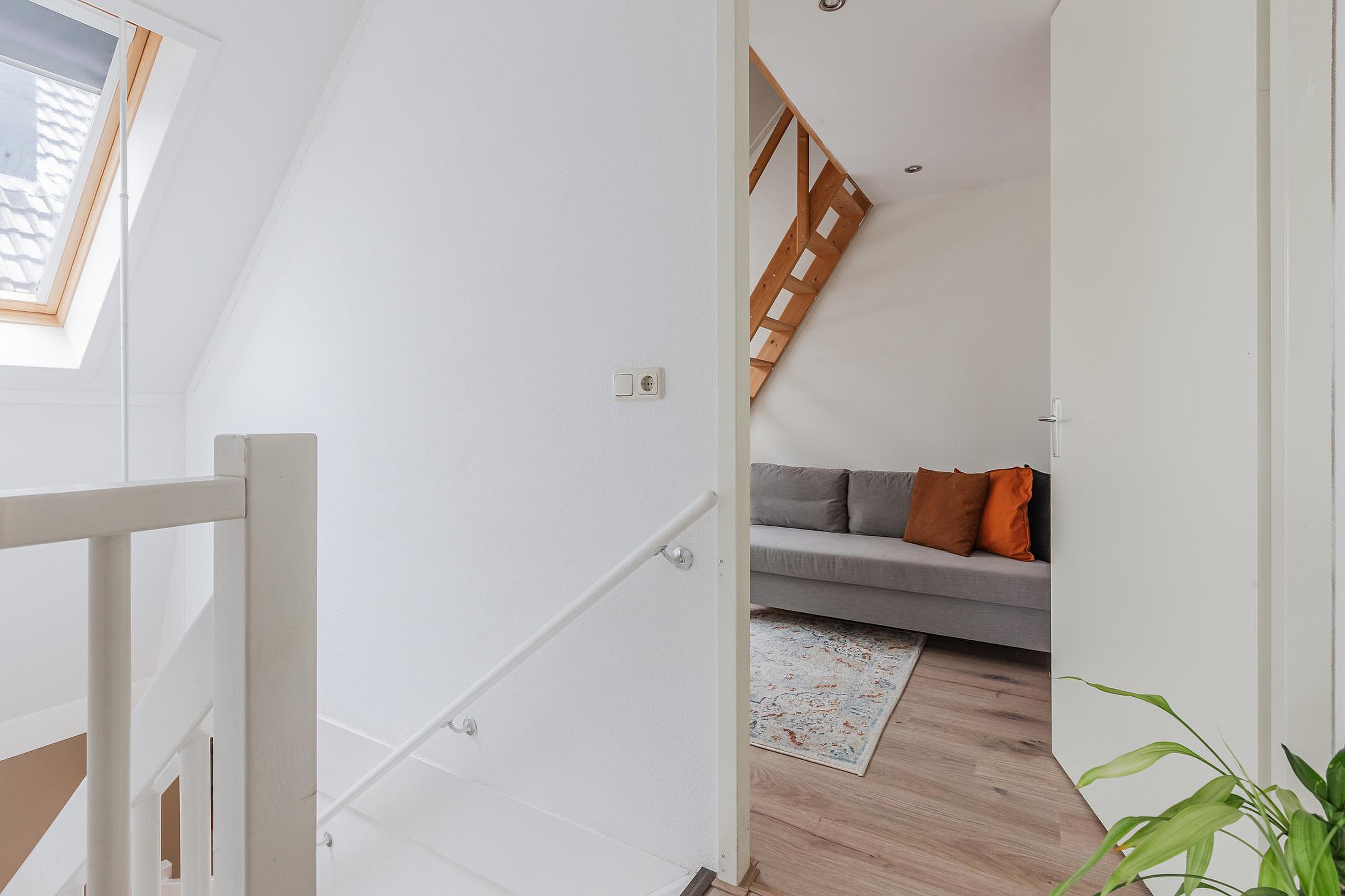 Via de trap bereik je de overloop met een groot Velux dakraam. De slaapkamer aan
