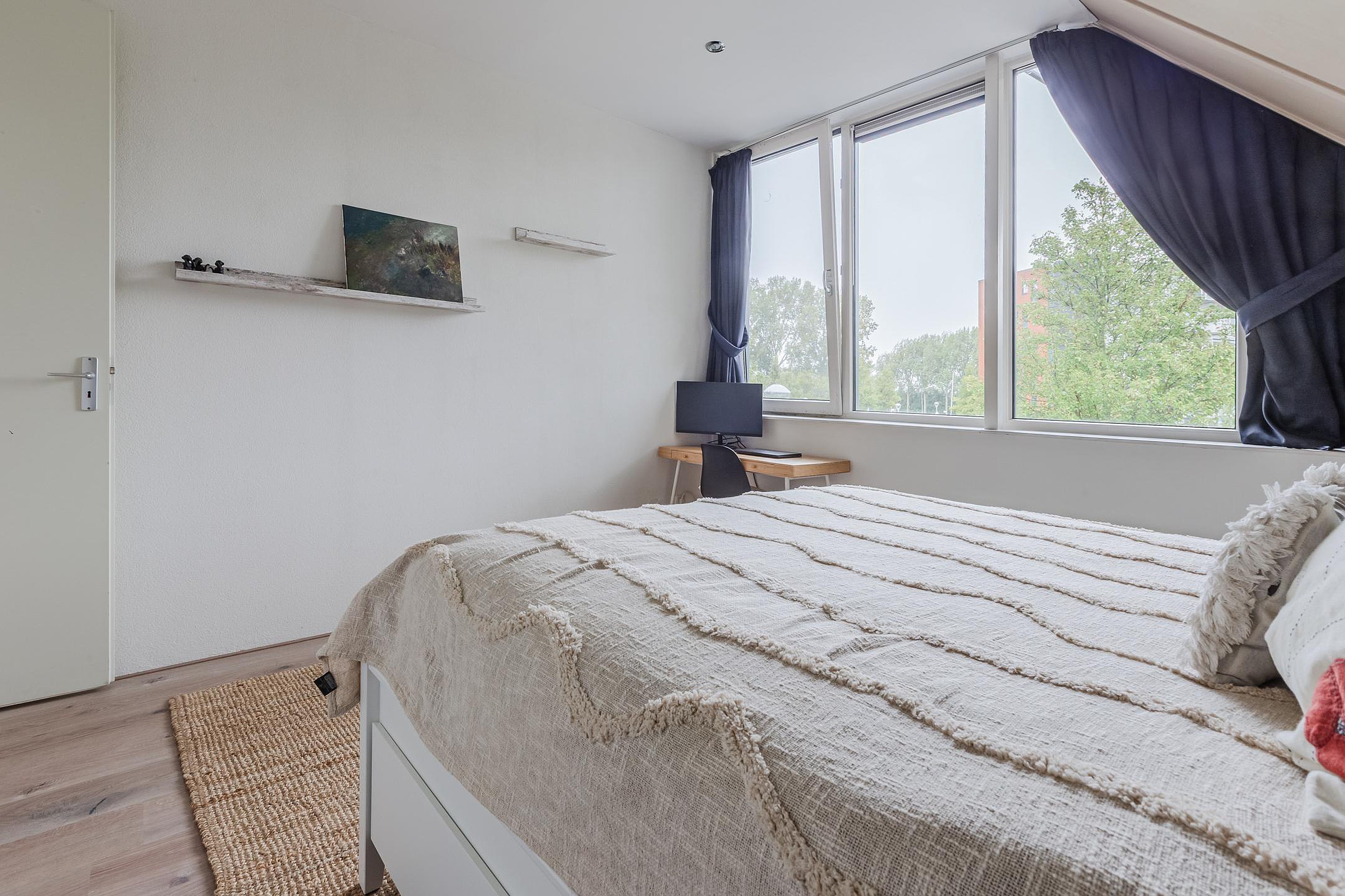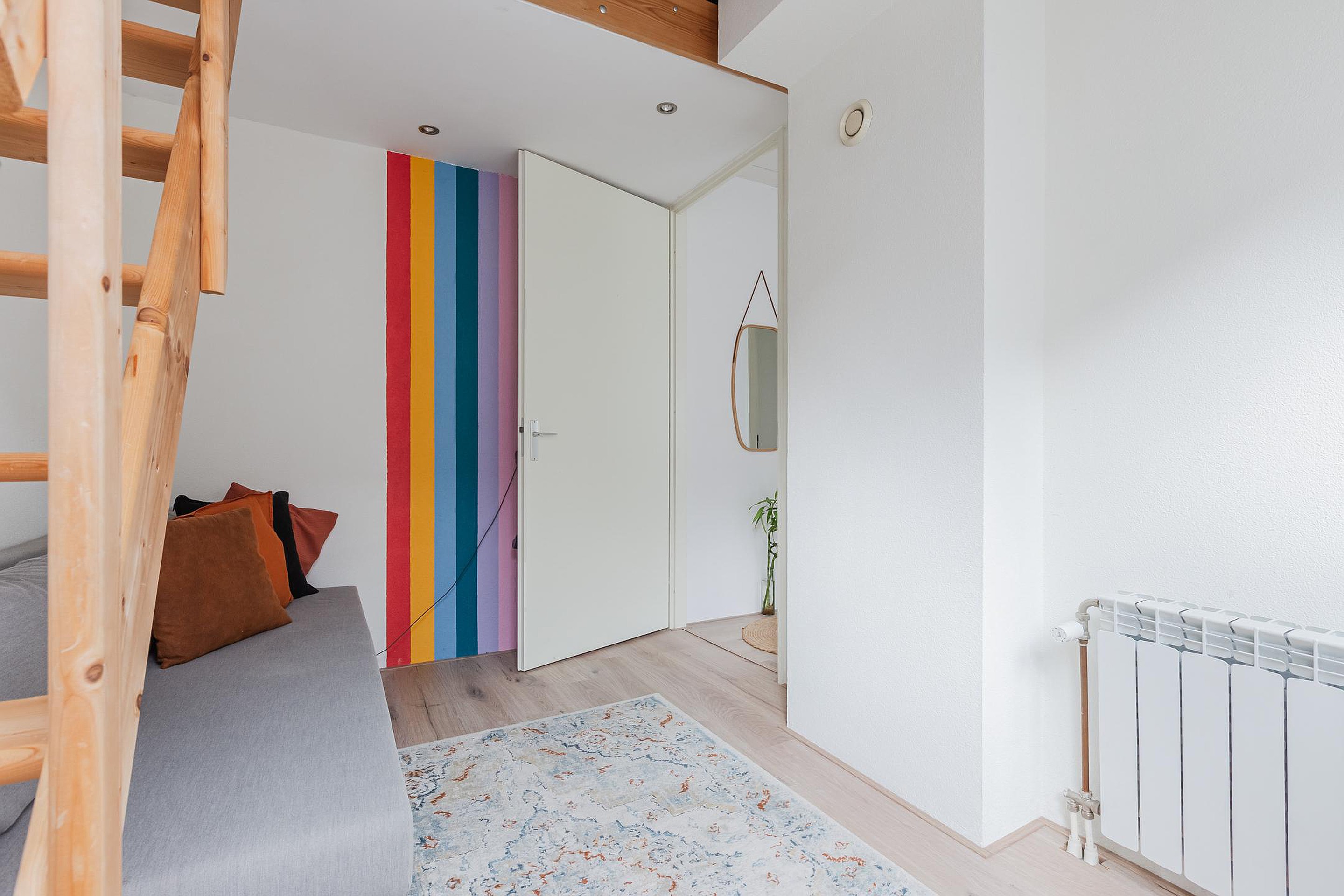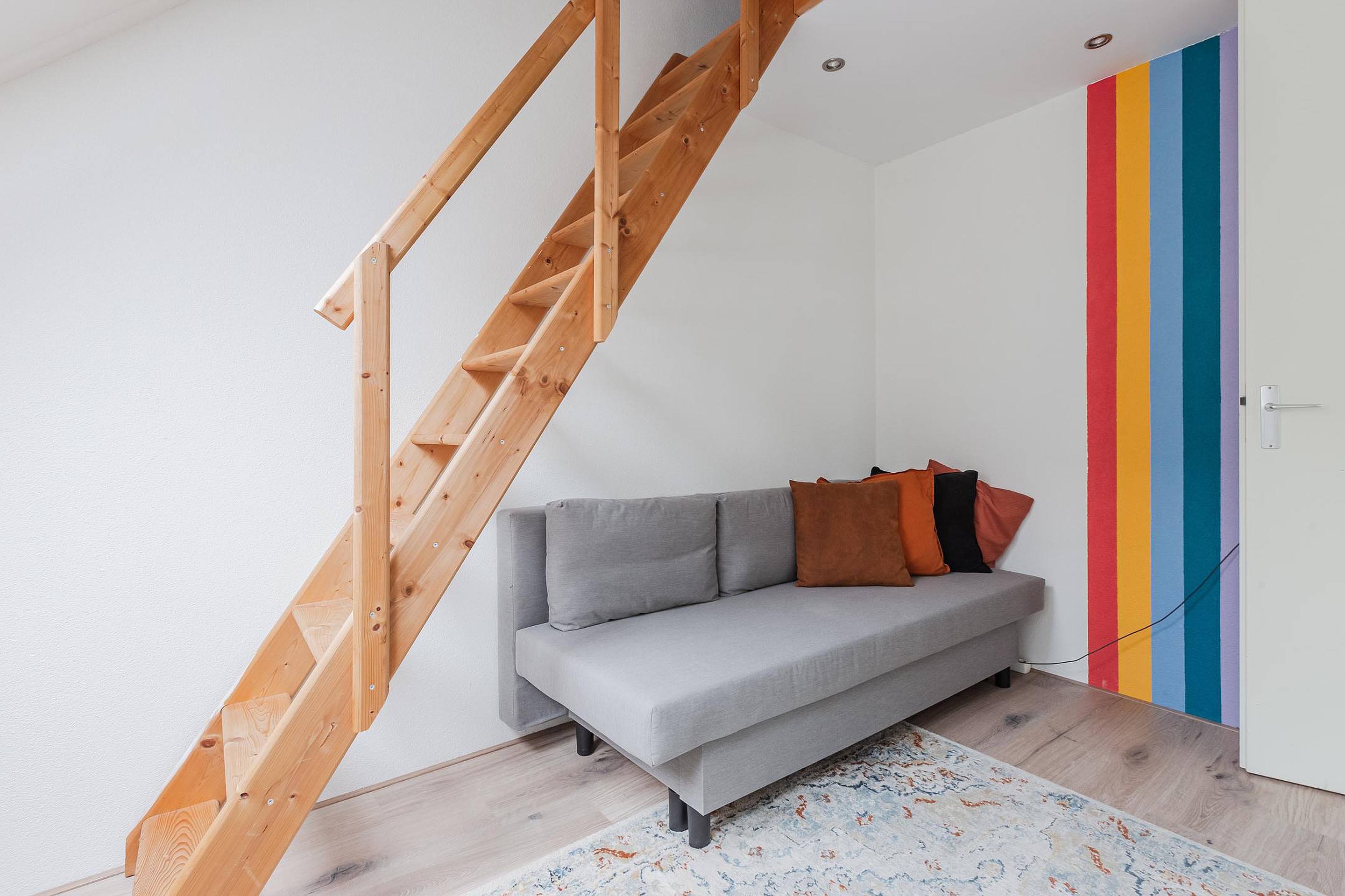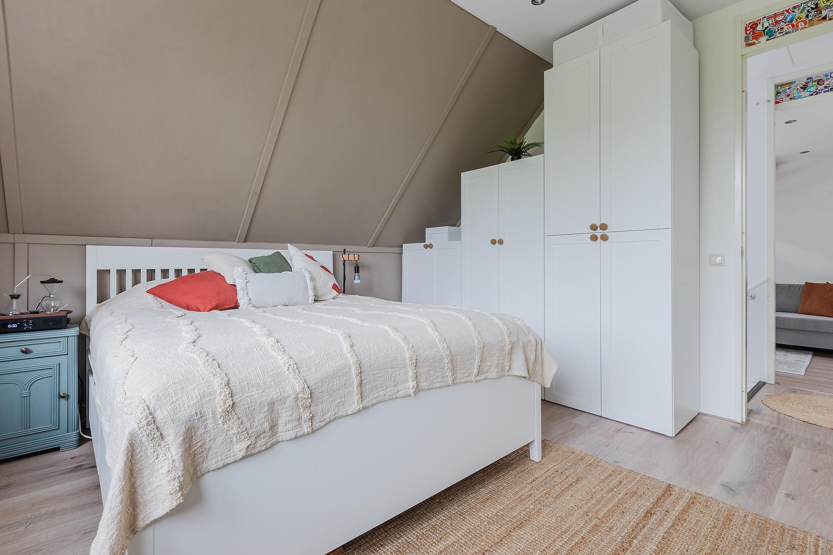 Via de trap bereik je de overloop met een groot Velux dakraam. De slaapkamer aan