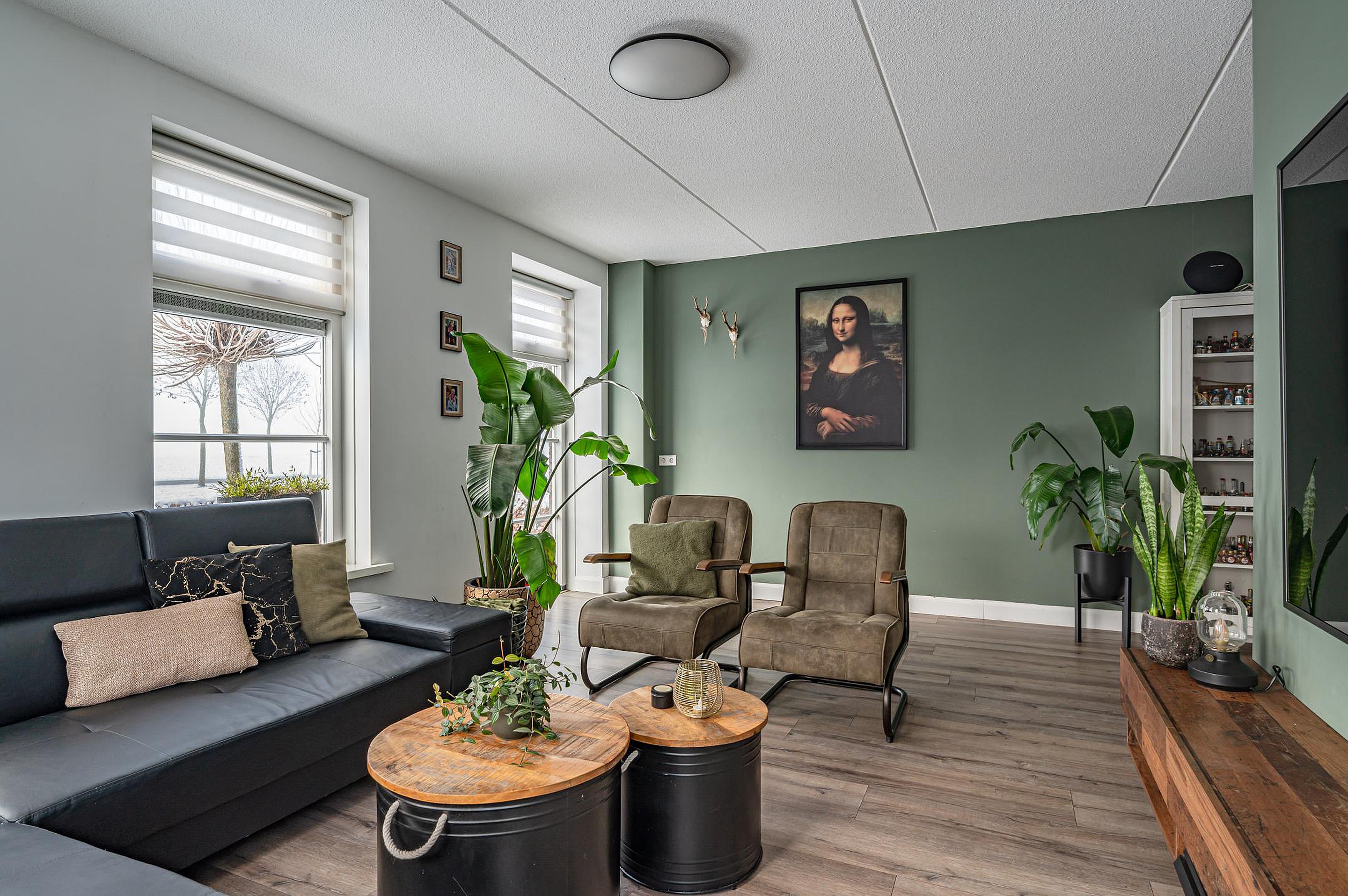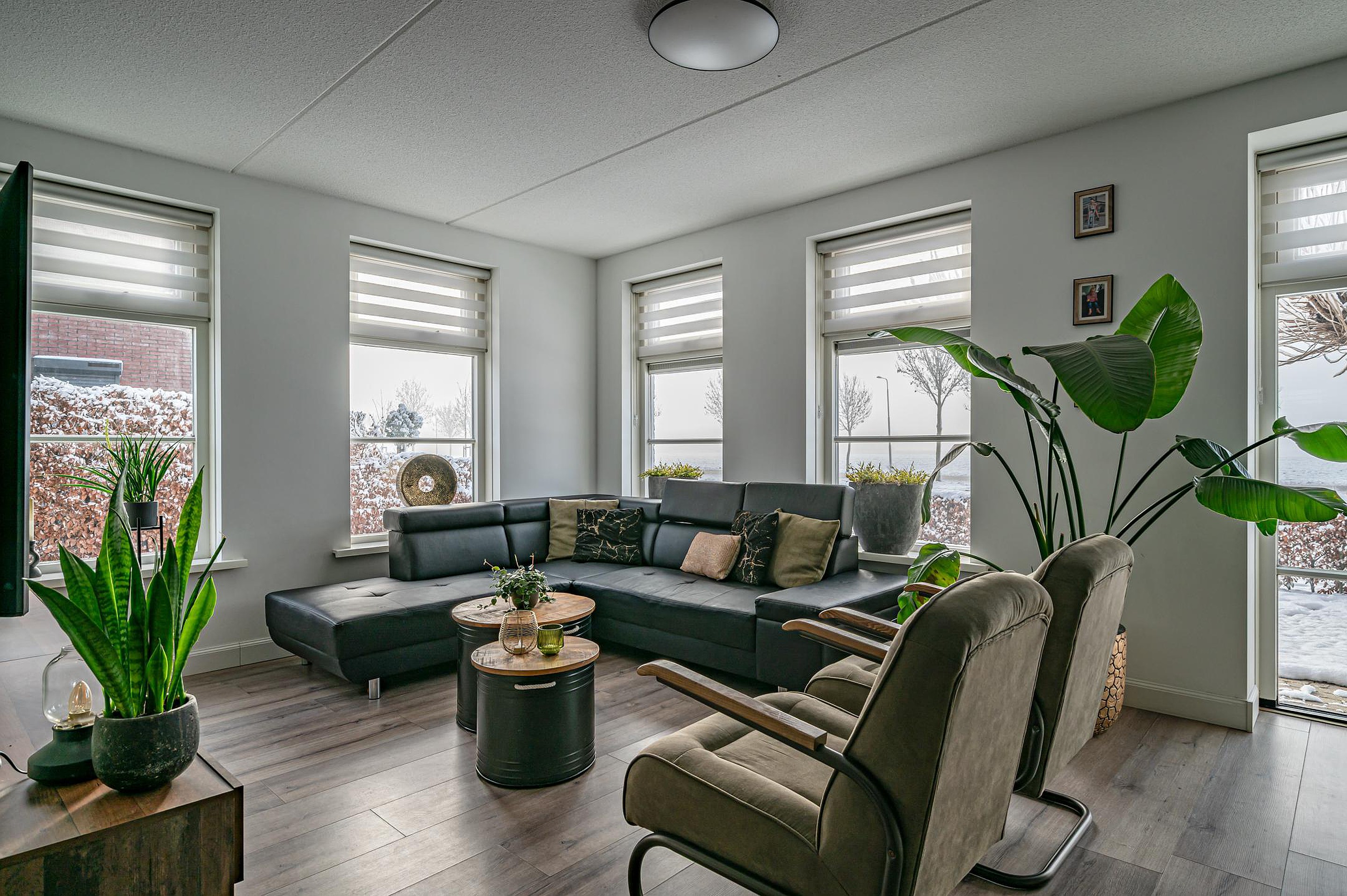 - Ruime L-vormige straatgerichte woonkamer met veel raampartijen, lichte laminaatvloer met vloerverwarming.