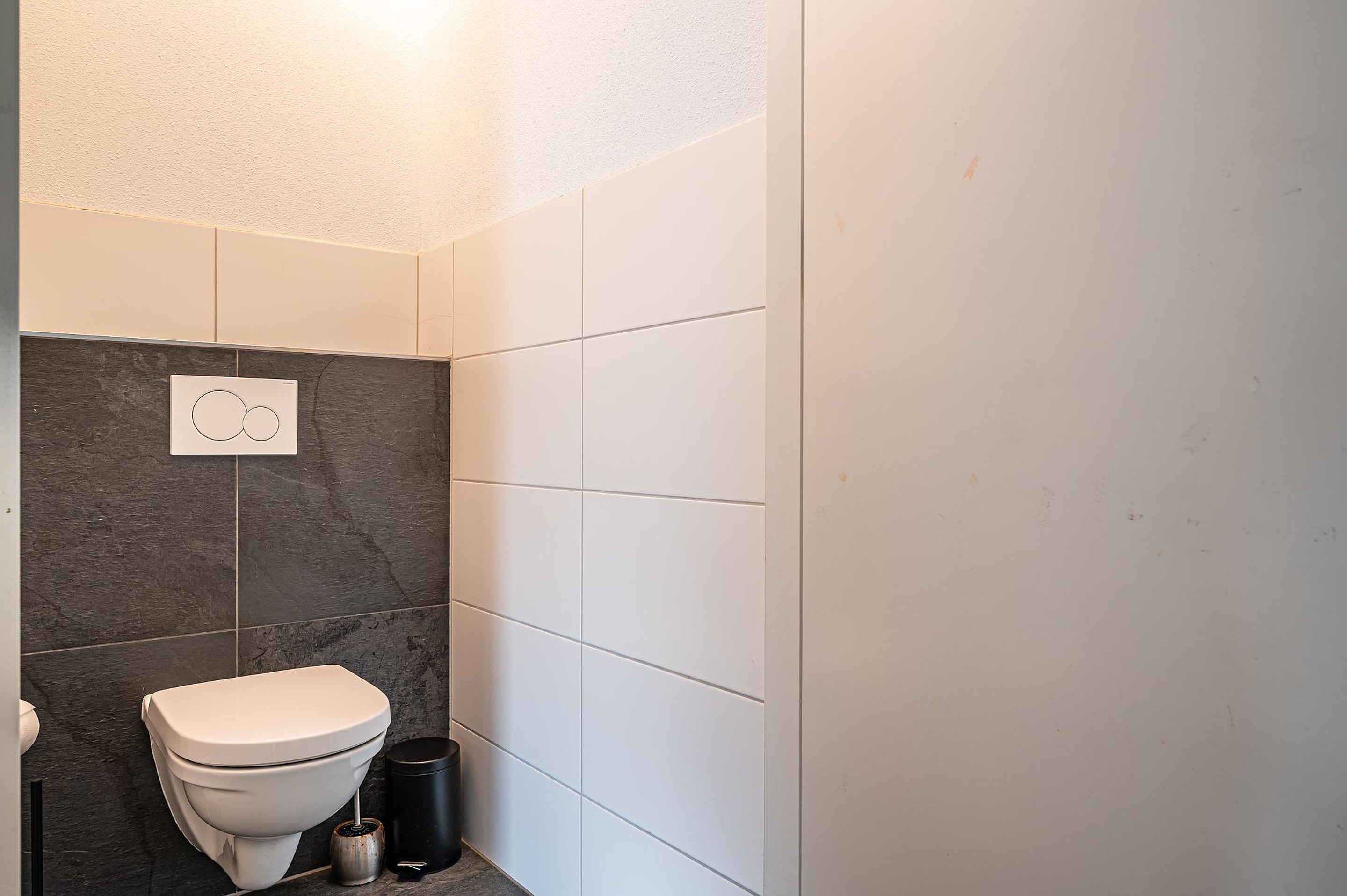 - Praktische bijkeuken met witgoedaansluitingen en kast met schuifdeuren. Hier is het toilet welke gedeeltelijk is betegeld. Deur naar de overkapping en achtertuin.