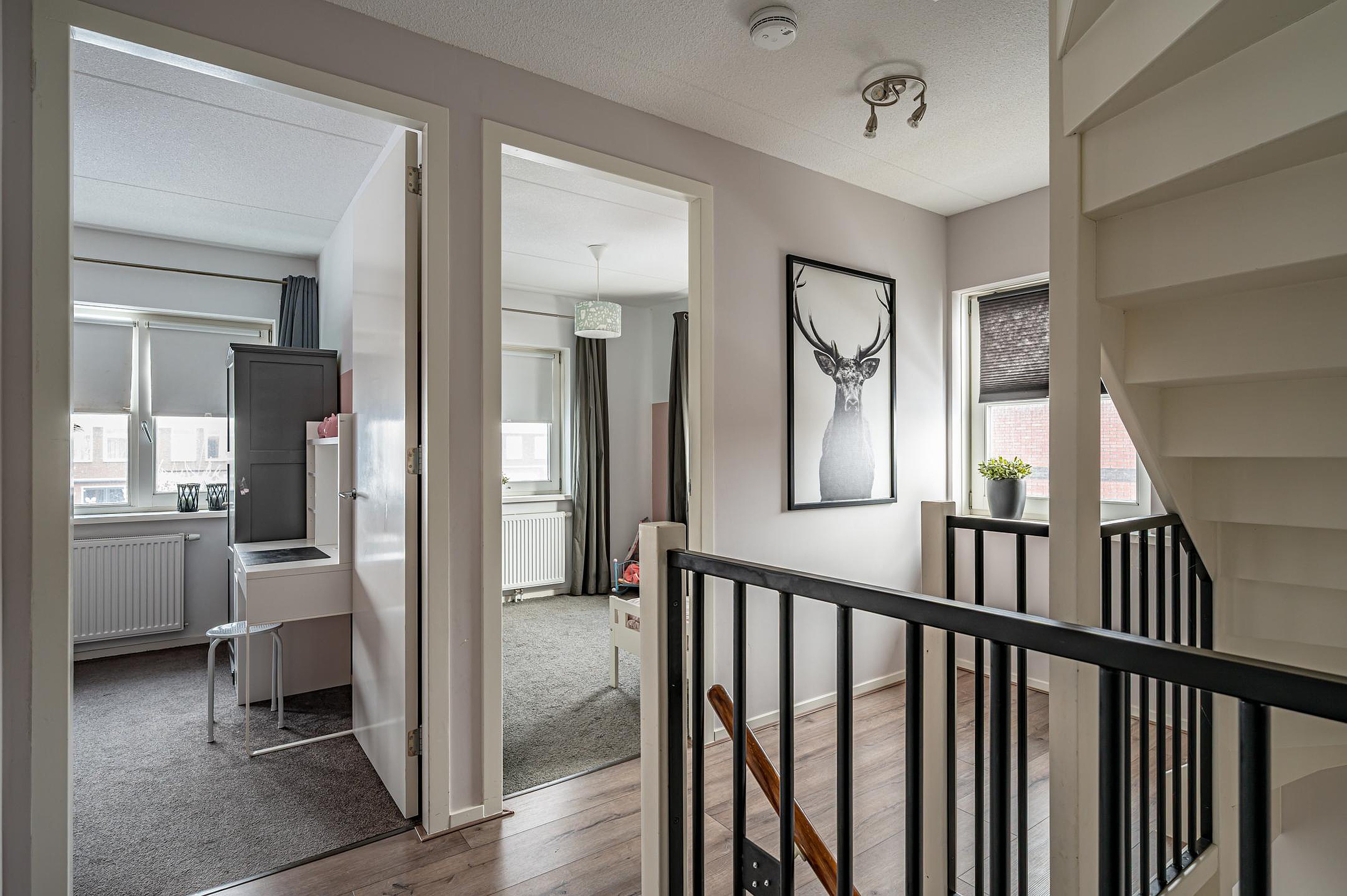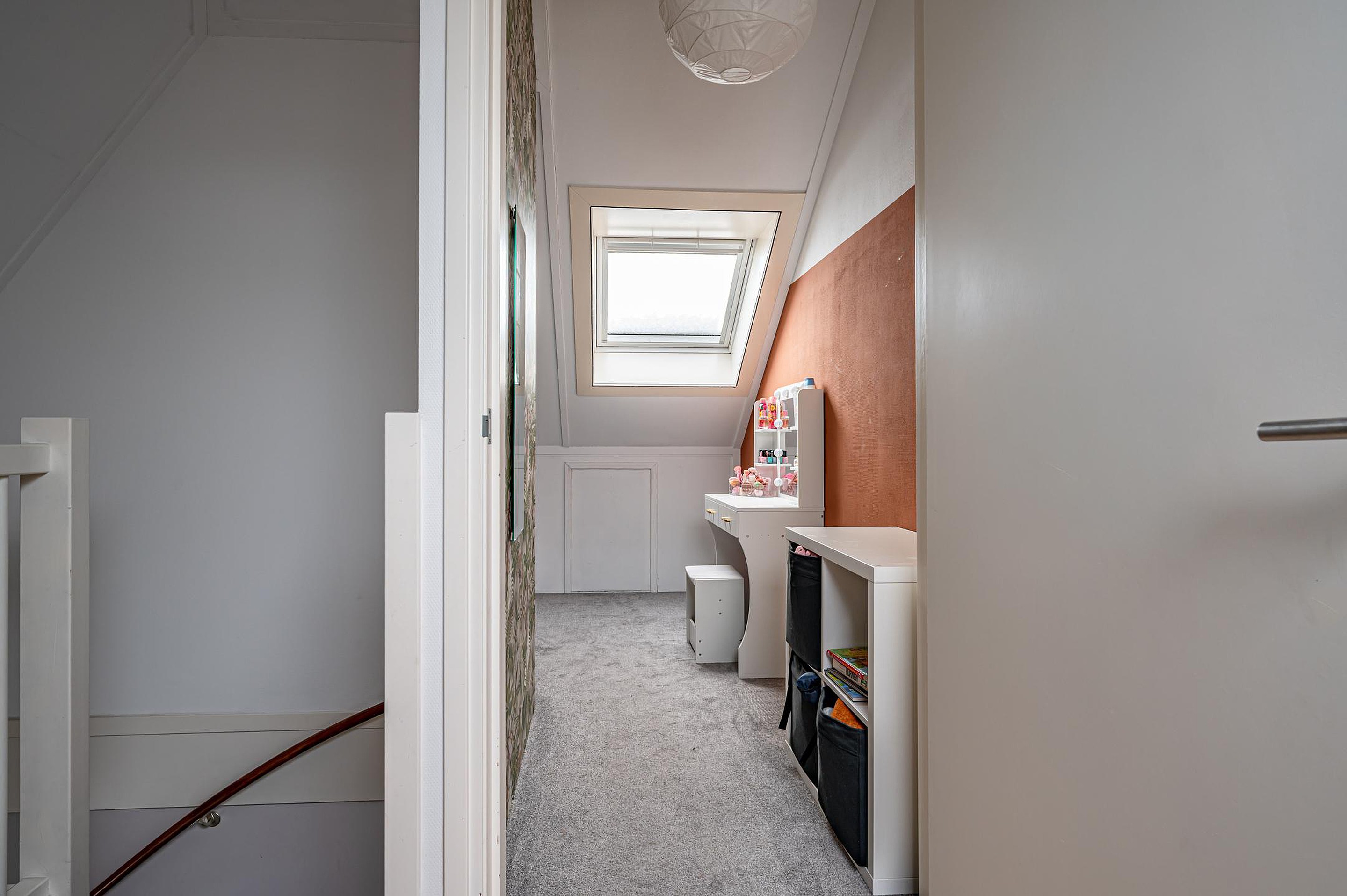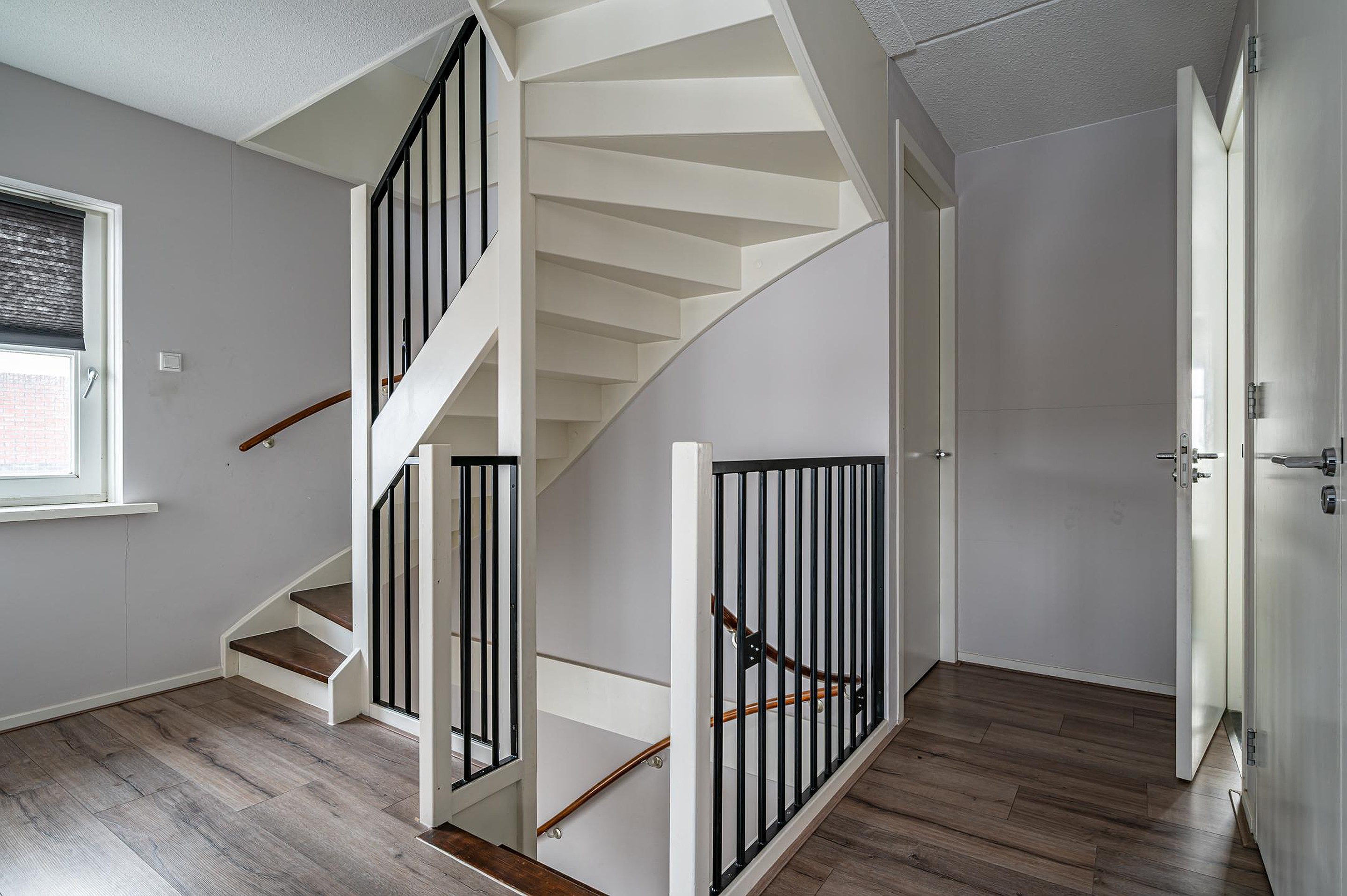 - Overloop met laminaatvloer, vaste trap naar de tweede verdieping en een inloopkast.