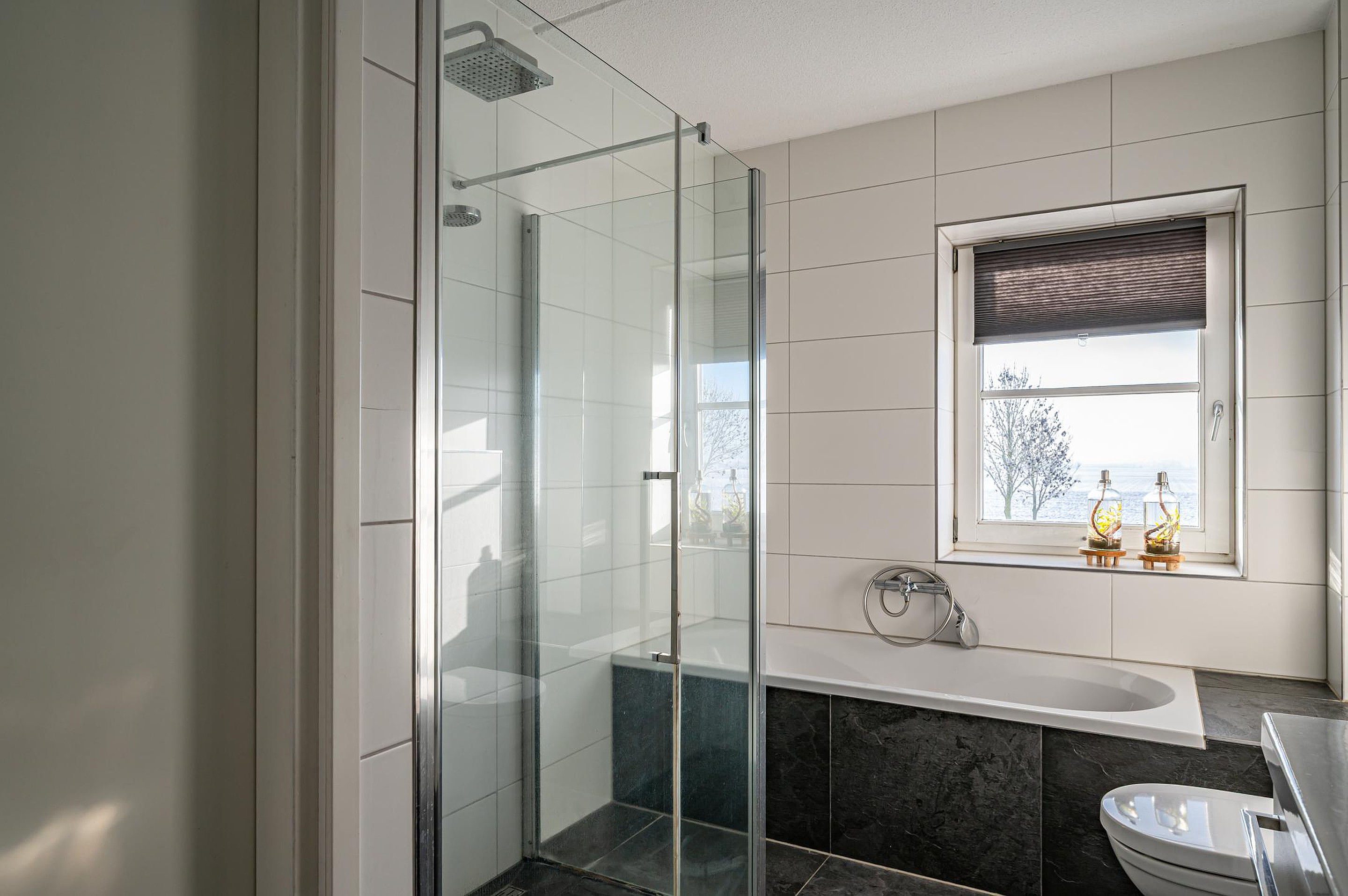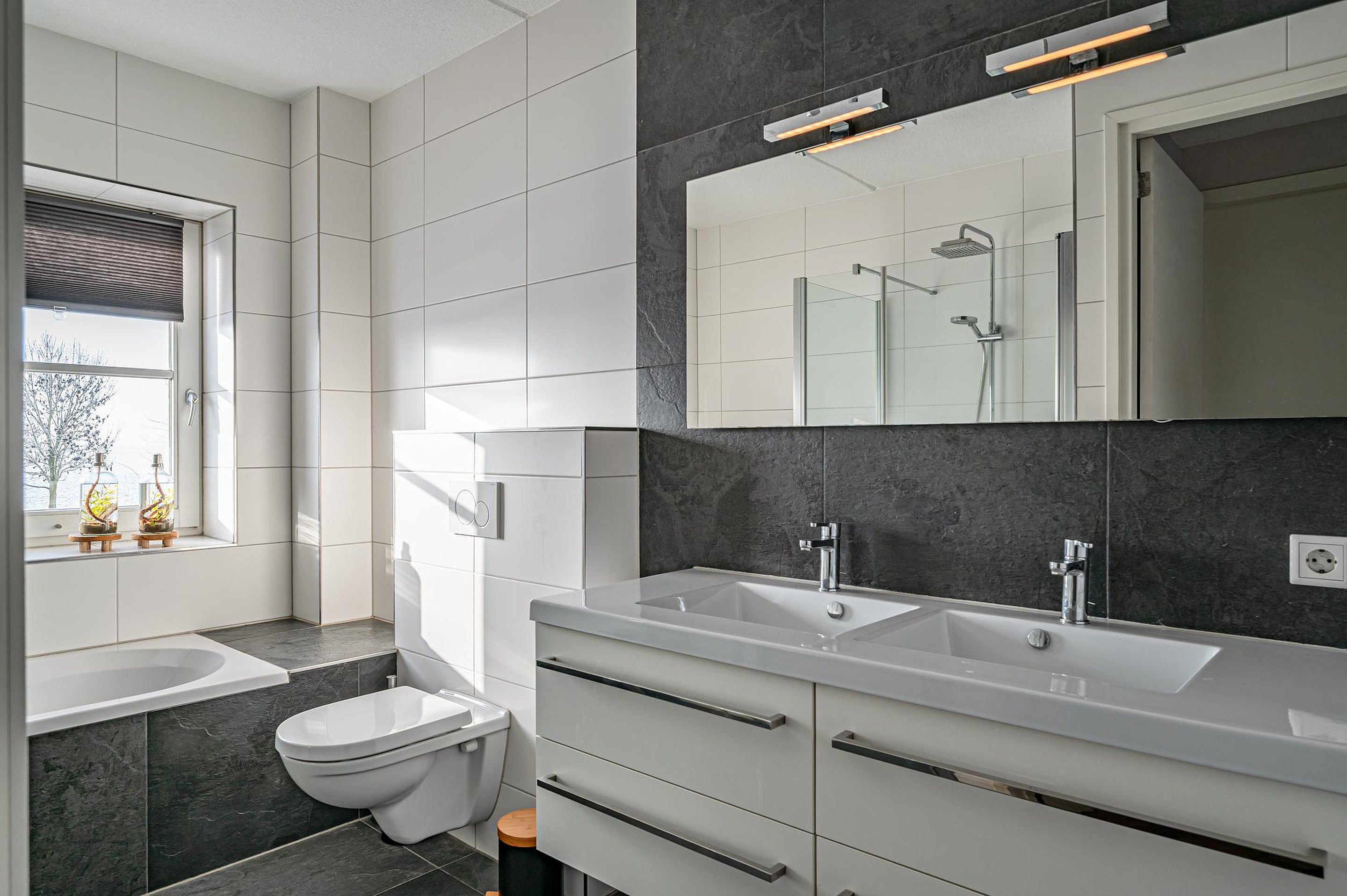 - Luxe, volledig betegelde badkamer met ligbad, inloopdouche, dubbele wastafelmeubel, toilet en mechanische ventilatie.