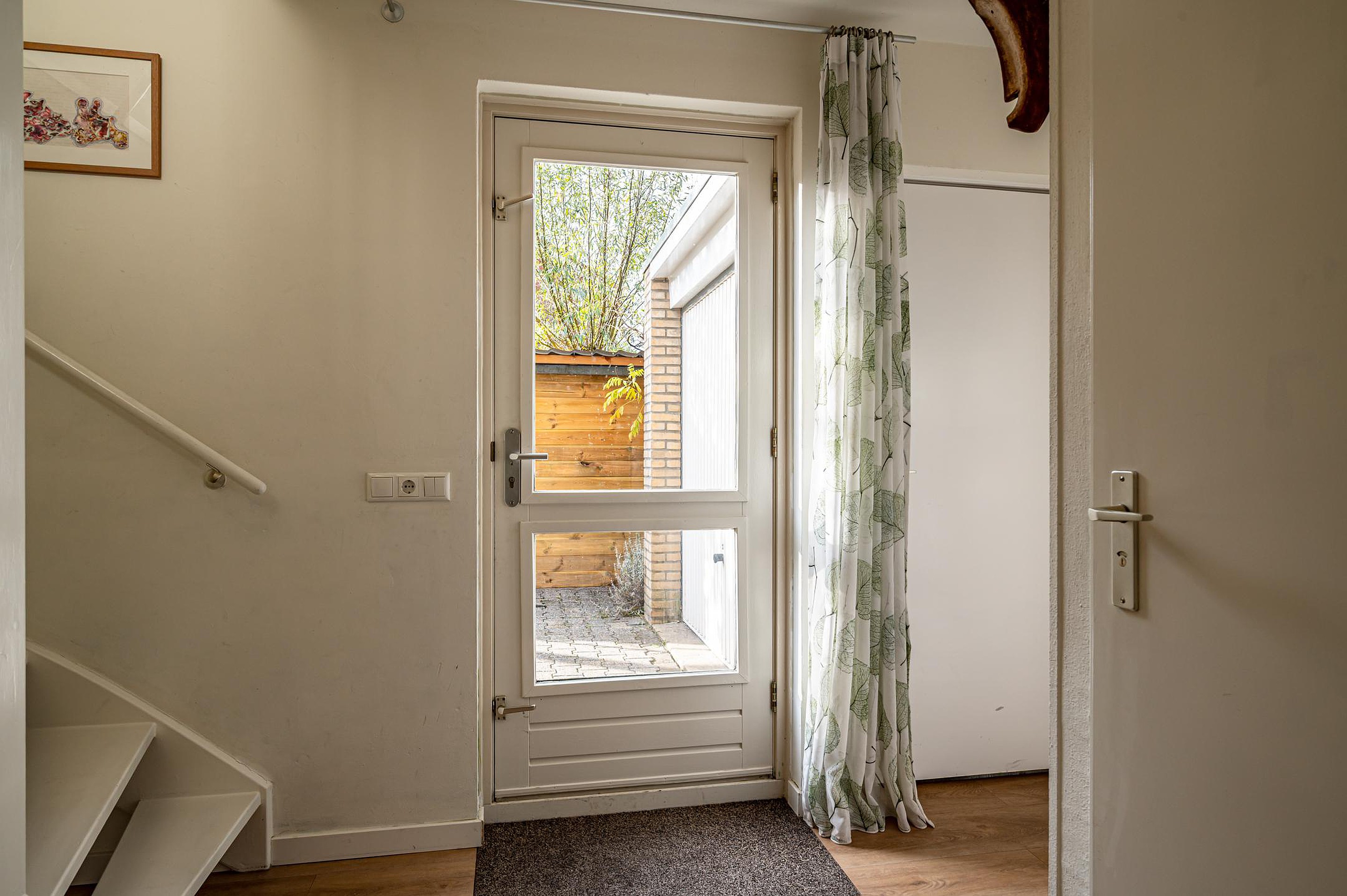 - Entree met hal, meterkast, modern toilet, trapopgang en deuren naar garage en woonkamer.
