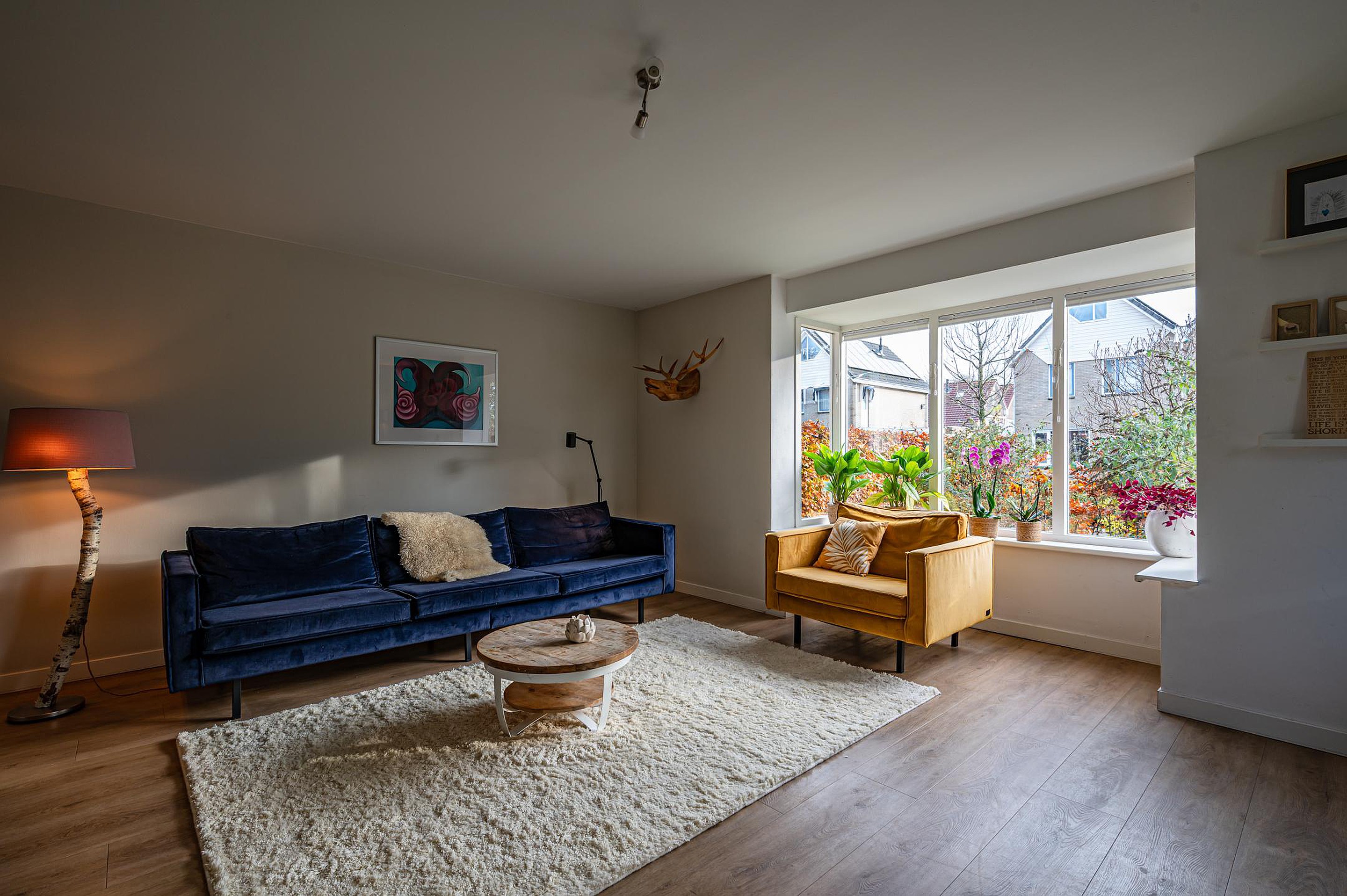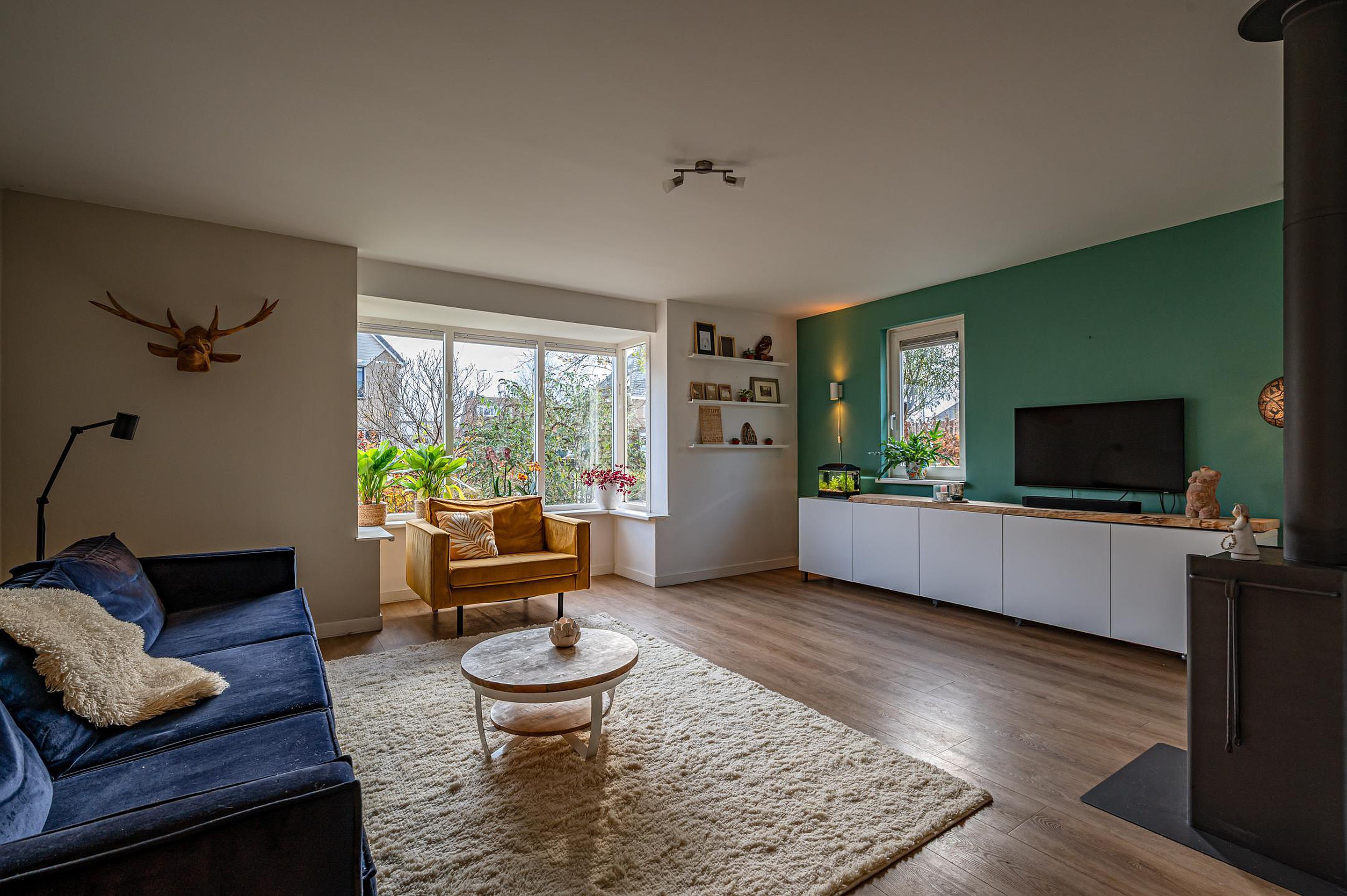 - Zeer ruime L-vormige woonkamer met erker, lichte PVC-vloer met vloerverwarming en een rookkanaal (houtkachel blijft niet achter).
