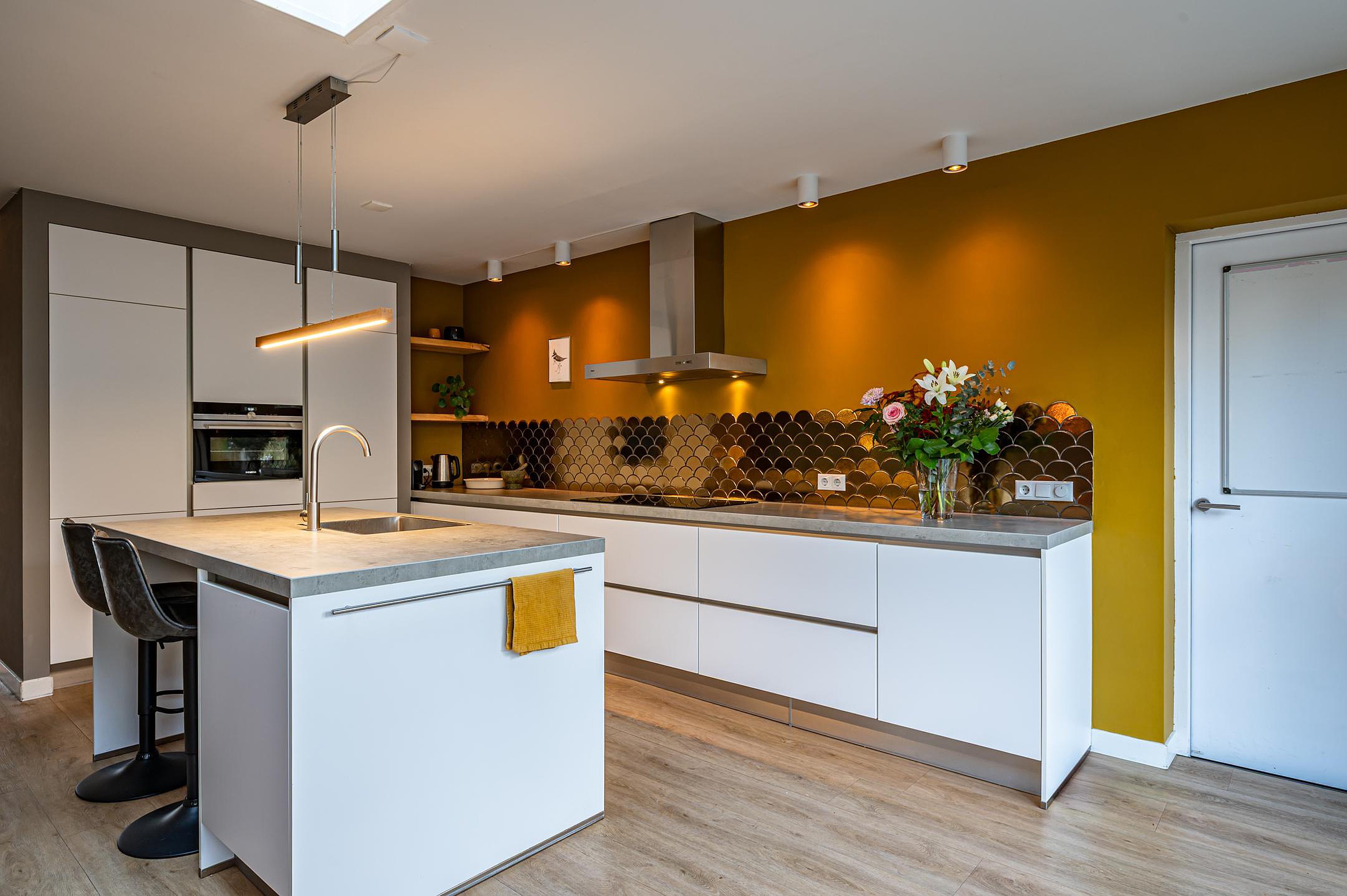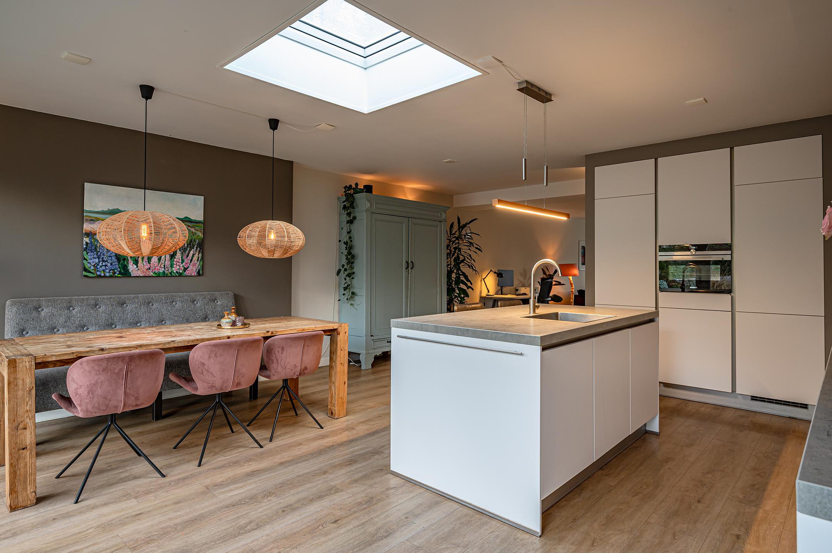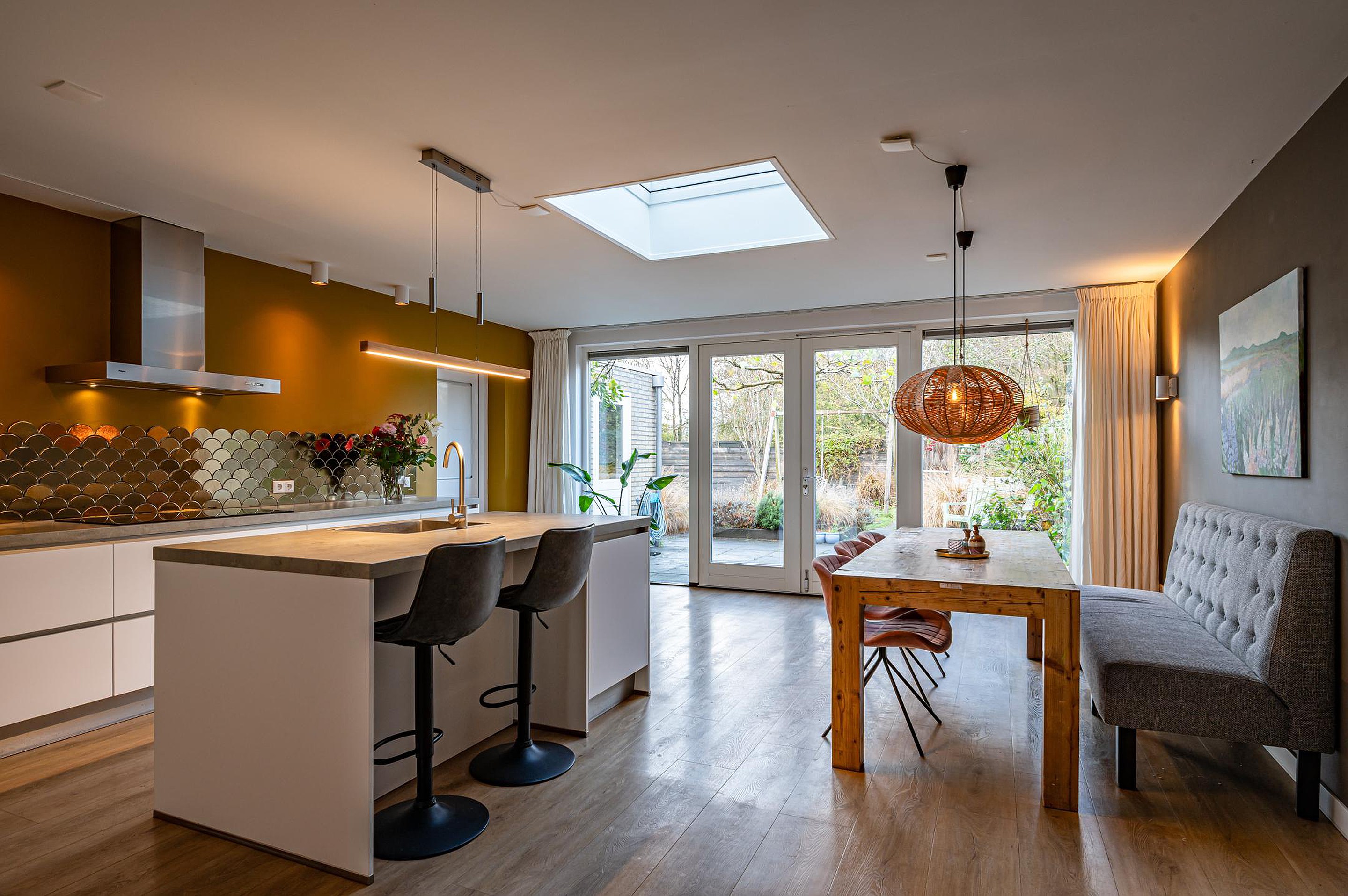 - Luxe uitgebouwde woonkeuken met keukenkeiland, lichtkoepel, vloerverwarming en openslaande tuindeuren. Voorzien van moderne inbouwapparatuur: koelkast, oven, vaatwasser, 5-pits inductiekookplaat en rvs-afzuigkap.