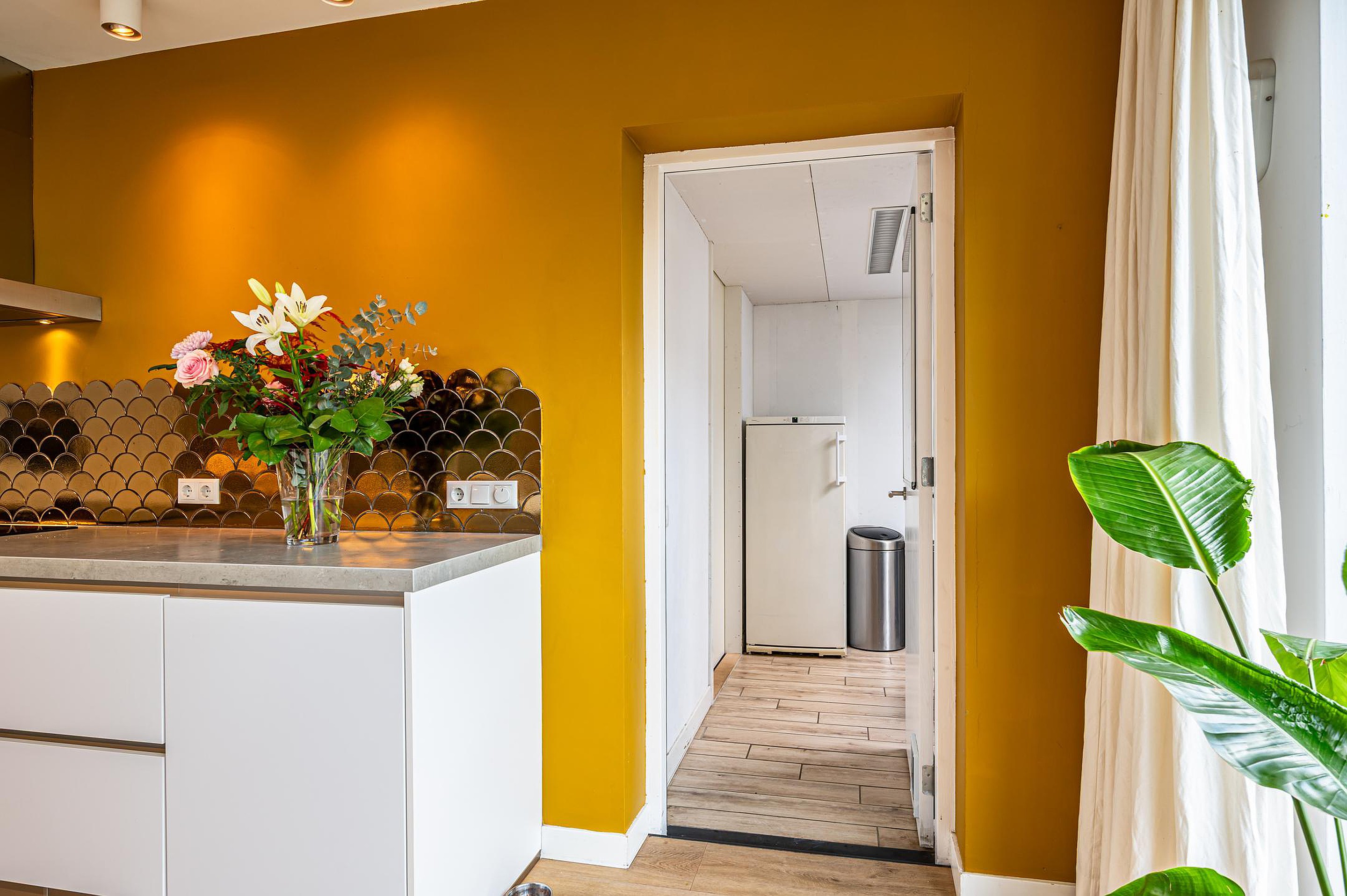 - Praktische bijkeuken met witgoedaansluitingen, lameltegelvloer met elektrische vloerverwarming en extra keukenblok met koud water. Natuurlijke lichtinval door de grote lichtkoepel. Deur naar de tuin.