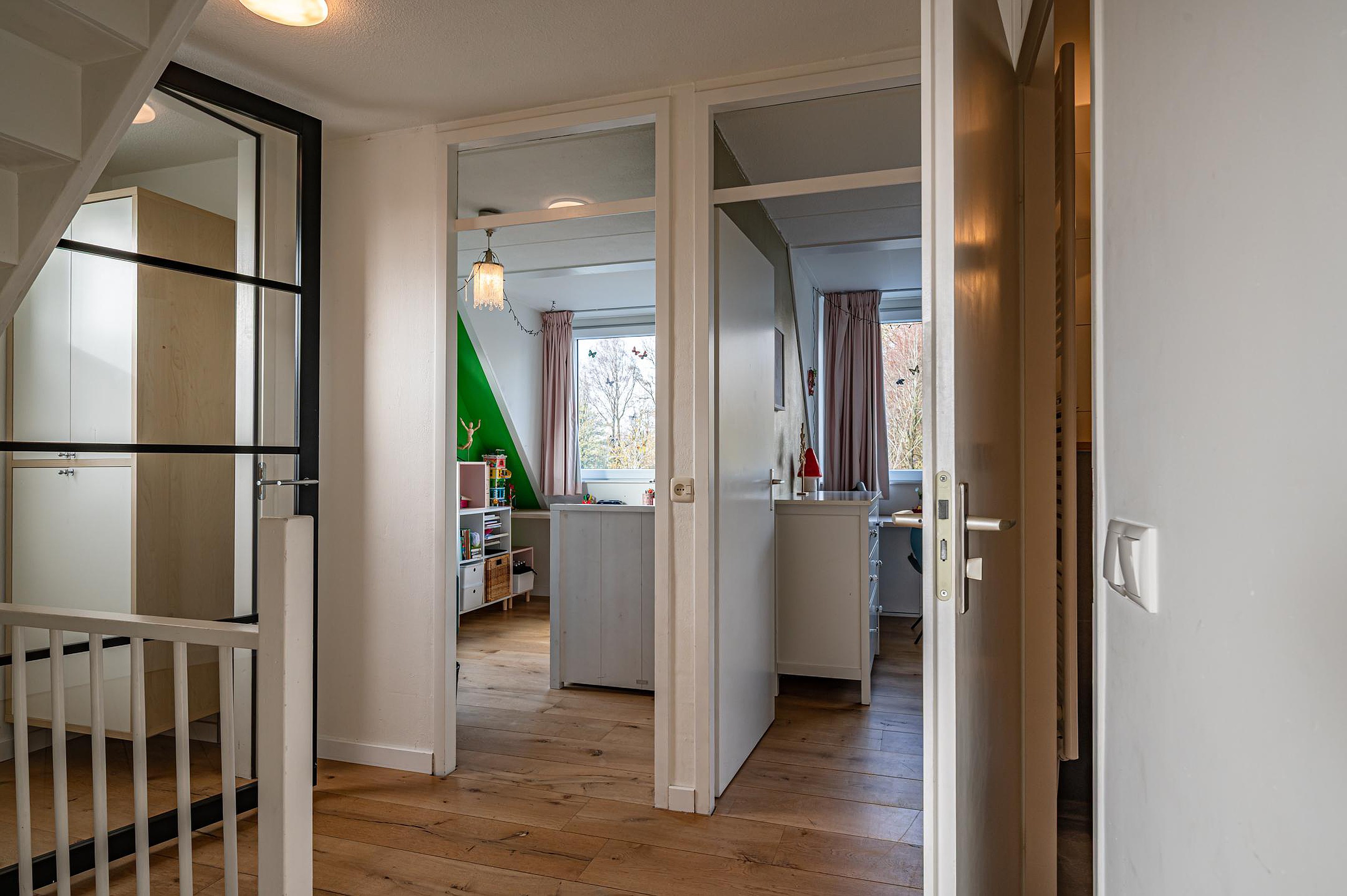 - Overloop met vaste trap naar de zolder, afsluitbaar met een glazen deur.