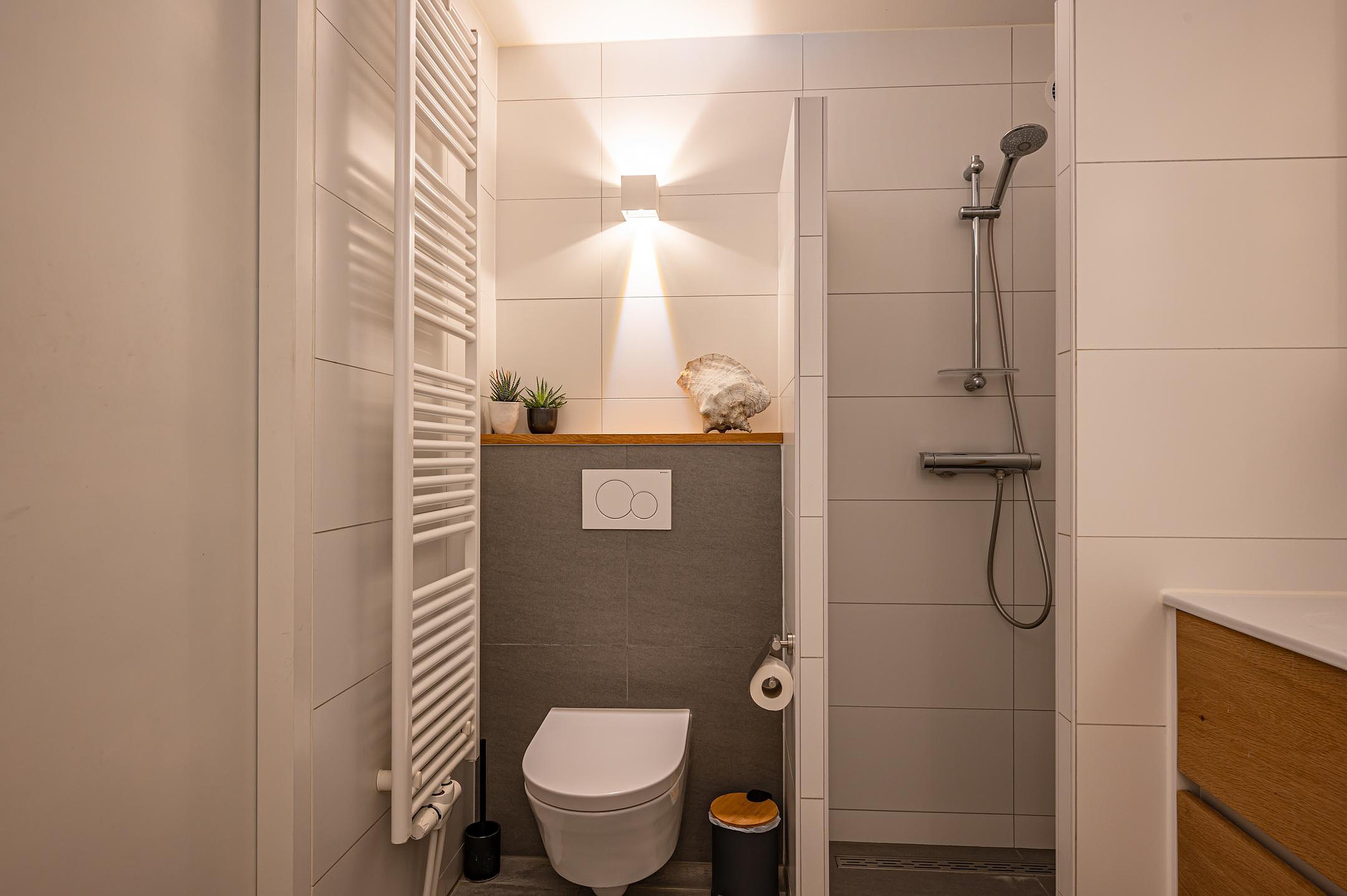 - Luxe, volledig betegelde badkamer (2018) met ligbad, inloopdouche, wastafelmeubel, toilet, designradiator en mechanische ventilatie.