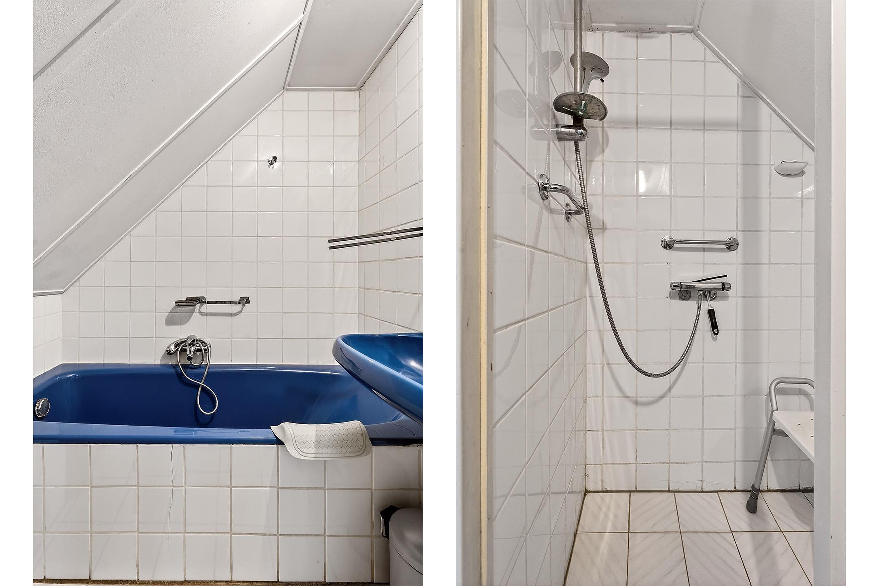 Overloop en drie slaapkamers, waarvan één voorzien is van badkamer die is uitgevoerd met ligbad, toilet, douche en wastafel. (Eén slaapkamer is gelegen met hun raam die uitkijkt over het perceel van Anerweg Noord 124) (Er is een offerte aanwezig om samen met de buren de indeling praktisch te maken tot een ‘normale’ twee-onder-één kapwoning.) (Eén slaapkamer van de buren kijkt uit over het perceel van Anerweg Noord 126.)