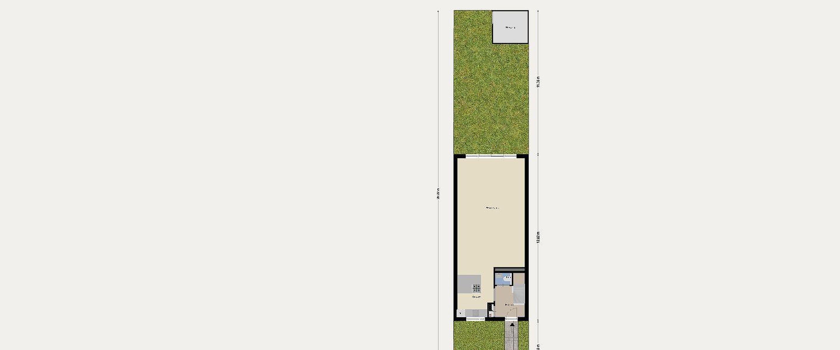 · Voortuin: Antraciet grind, haag en een looppad van keramische tegels.