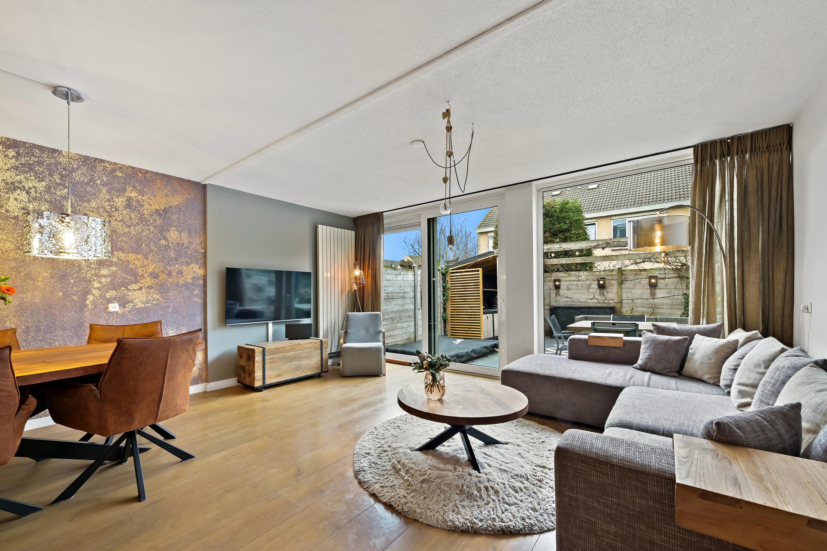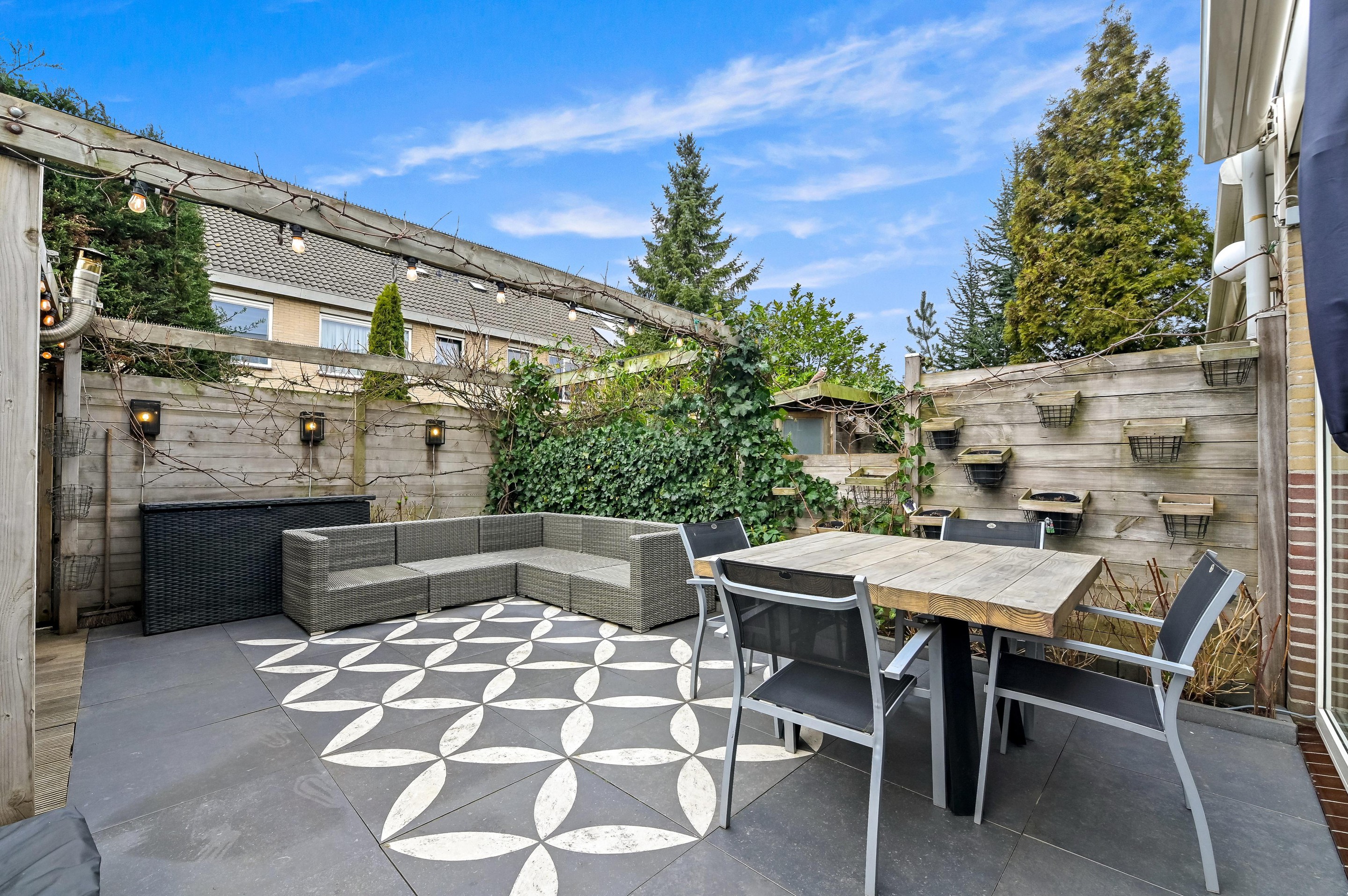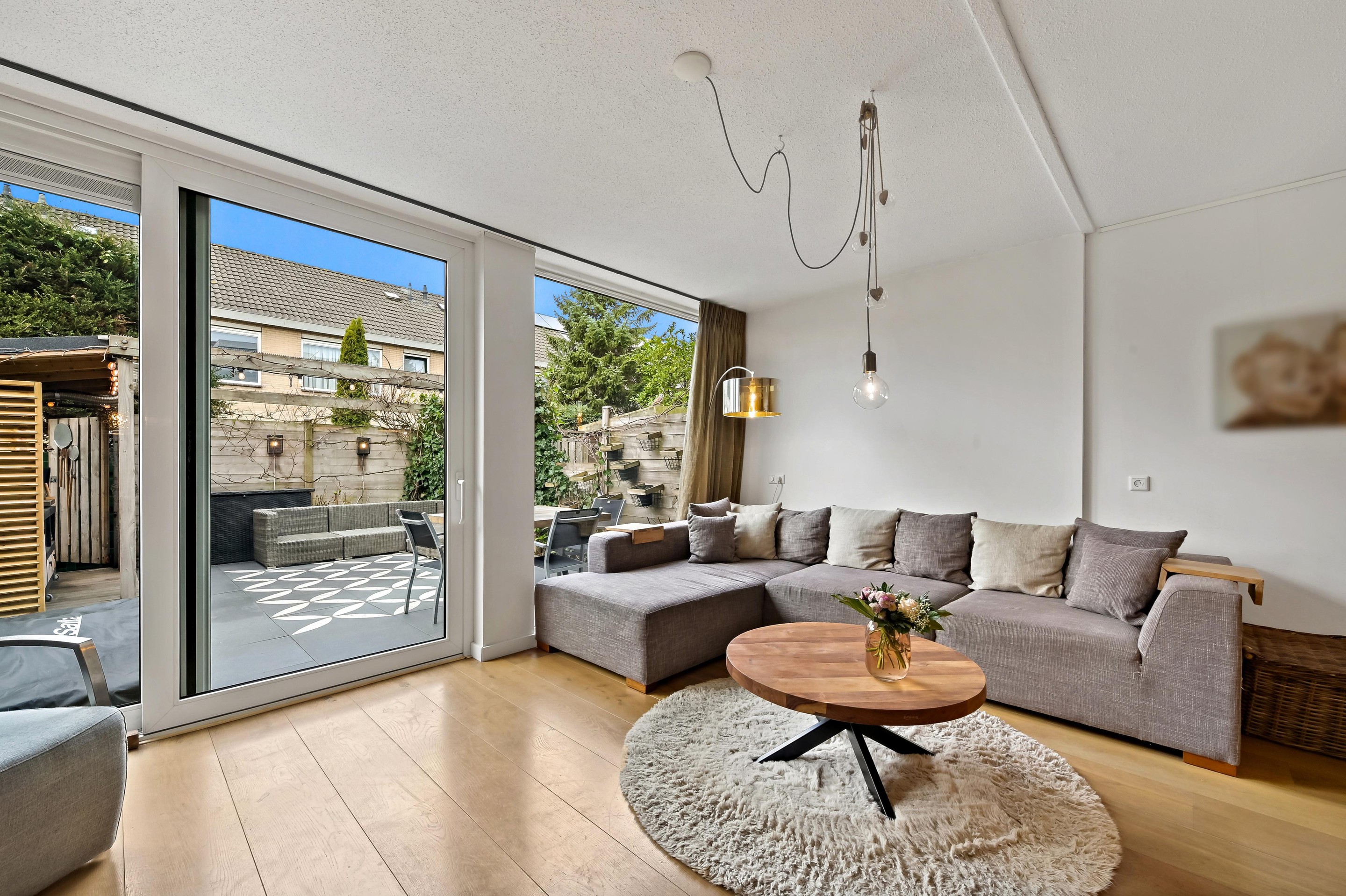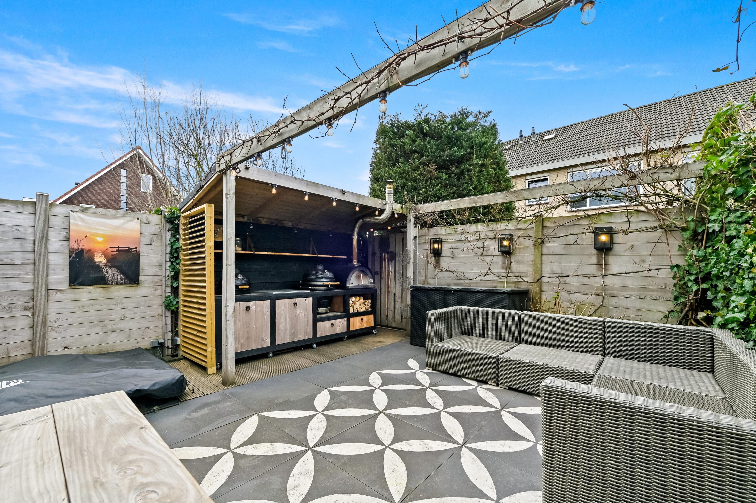 Voortuin met parkeerplaats en stenen berging. Aan de voorzijde van de woning is de entreehal uitgebouwd, zodat er een extra grote hal is gecreëerd met kast en garderoberuimte en toiletruimte met fonteintje. De woonkamer is een tuingerichte ruimte dankzij de kunststof schuifpui en de grote glasoppervlakten in de achtergevel. Aan de voorzijde van de woning bevindt zich de L-vormige keuken. De keuken staat in open verbinding met het woongedeelte, waardoor er vanuit alle hoeken contact met elkaar ontstaat. De keuken is in 2013 geplaatst en beschikt over diverse inbouwapparatuur waaronder een 5-pits gasfornuis met brede oven, afzuigkap combi oven/magnetron, vaatwasser (vervangen in december 2025) en koelkast met vriezer. De keuken is een lekker lichte ruimte, dankzij het grote raam in de voorgevel. De gehele begane grond is voorzien van fraaie houten vloerdelen. De gezellig ingerichte achtertuin is gunstig gelegen voor zonliefhebbers. Achterin de tuin staat een sfeervolle overkapping met een buitenkeuken. Aan de achterzijde is de tuin ontsloten via een poort tussen de woningen. Een heerlijke plek voor mooie zomers dagen!