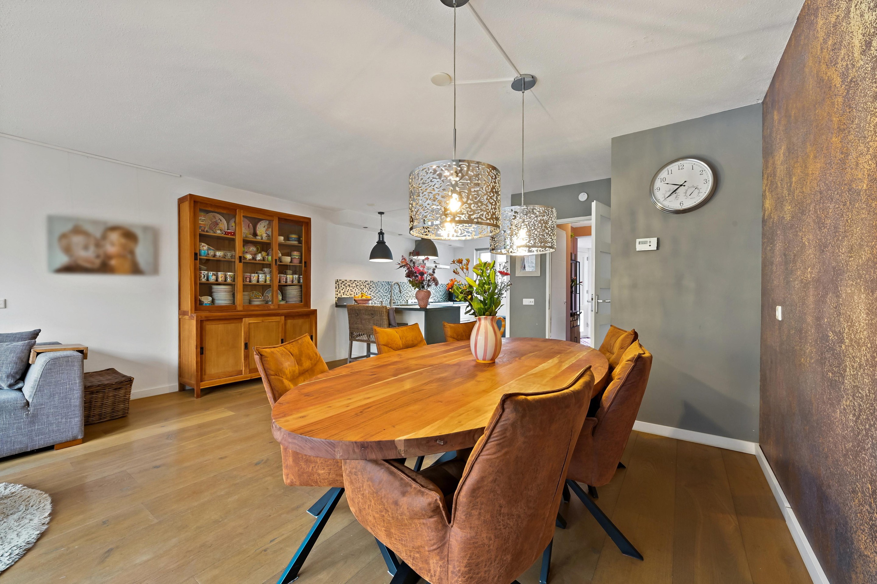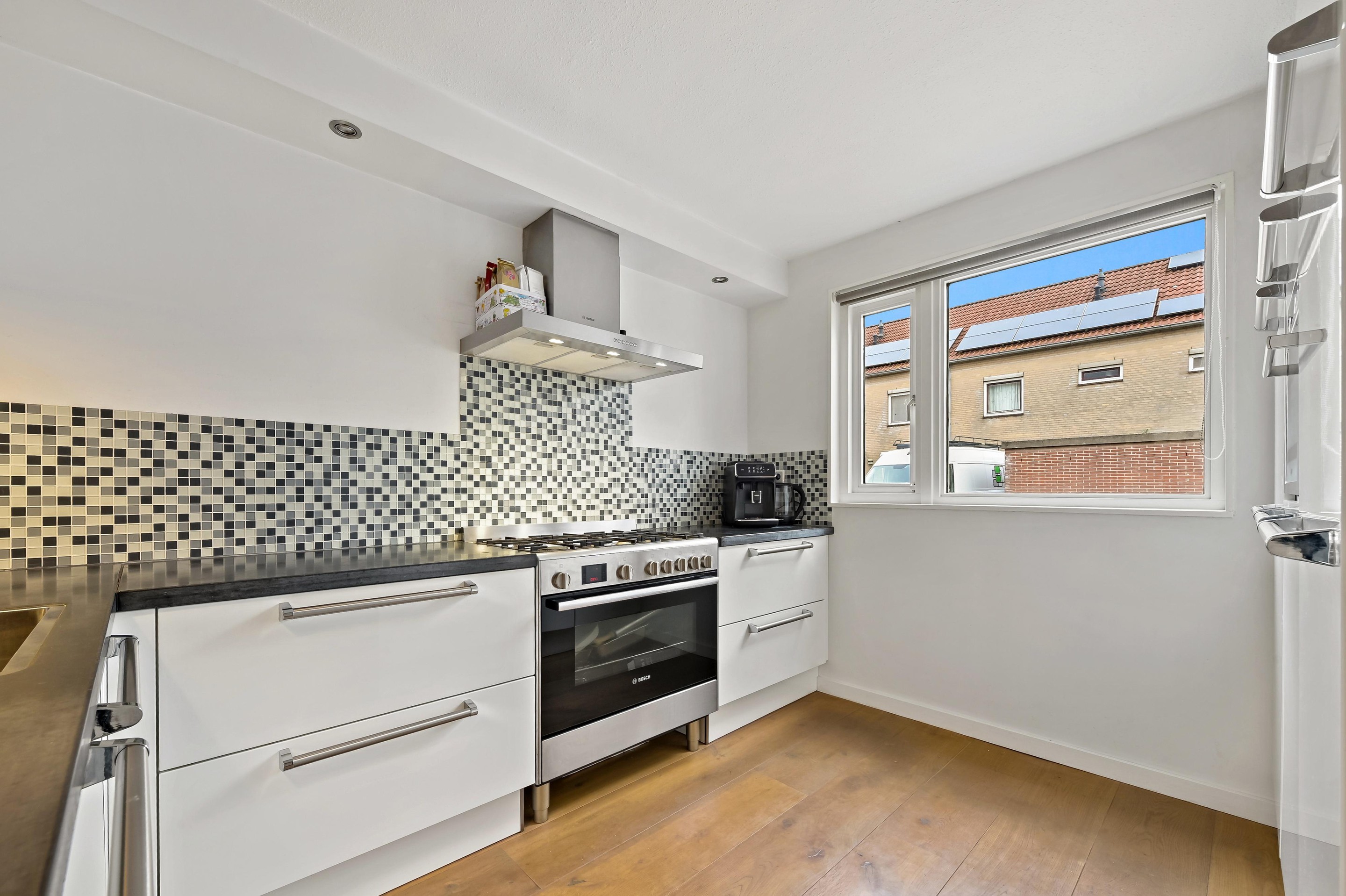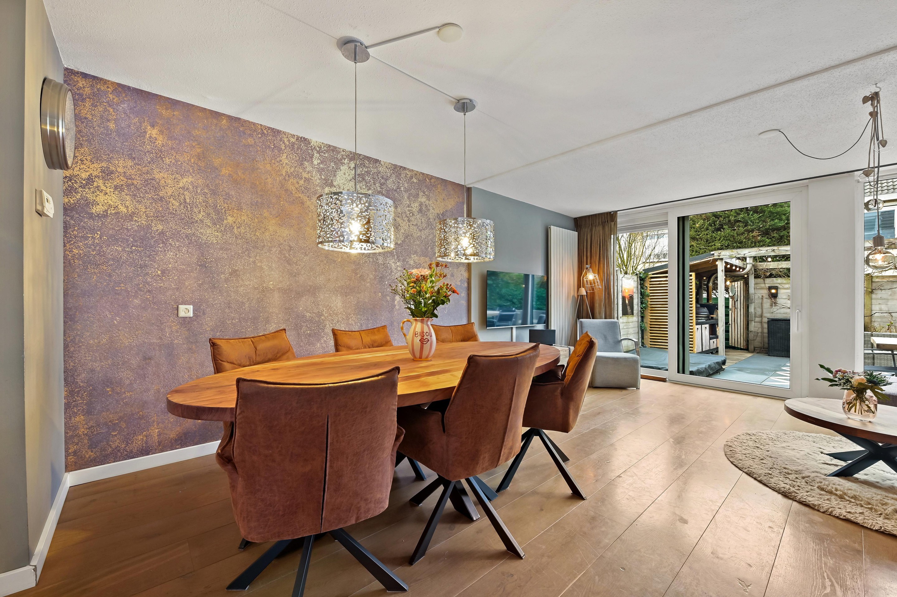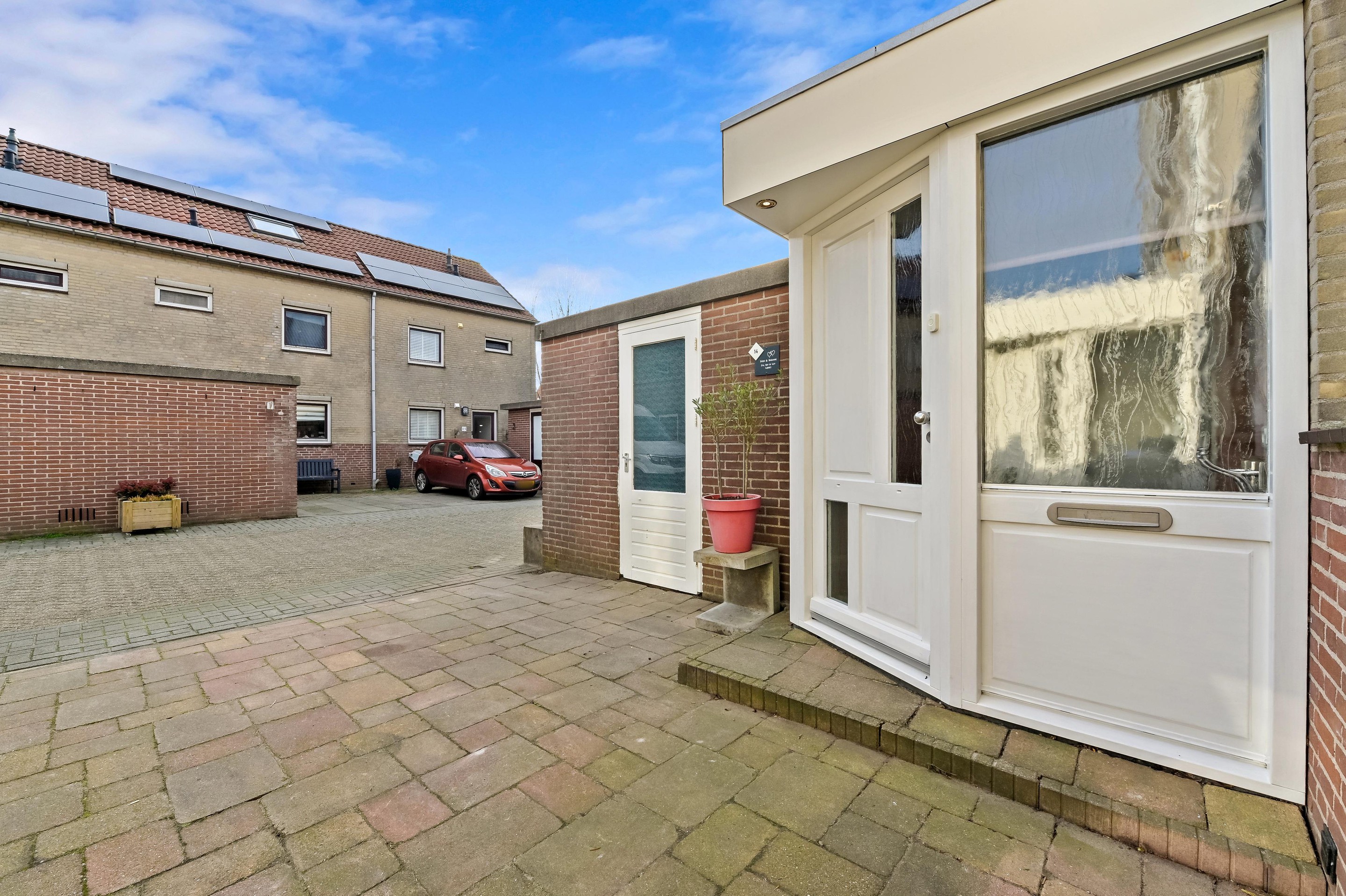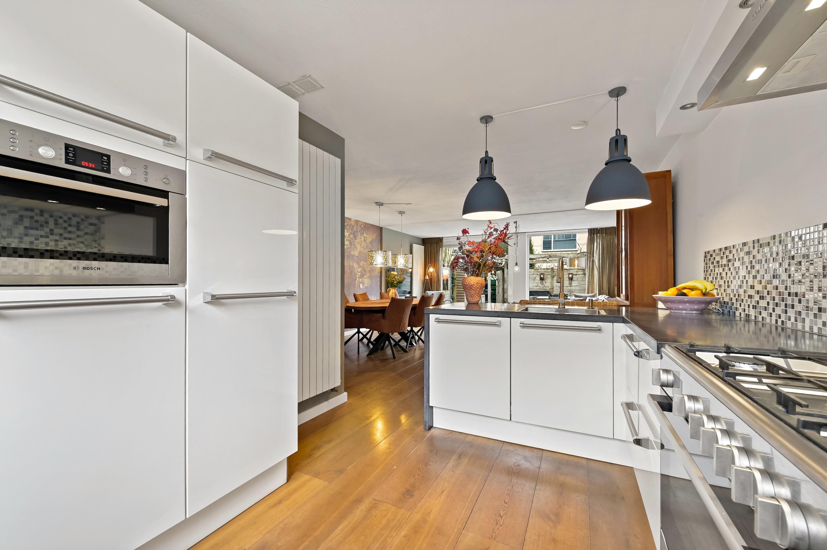 Voortuin met parkeerplaats en stenen berging. Aan de voorzijde van de woning is de entreehal uitgebouwd, zodat er een extra grote hal is gecreëerd met kast en garderoberuimte en toiletruimte met fonteintje. De woonkamer is een tuingerichte ruimte dankzij de kunststof schuifpui en de grote glasoppervlakten in de achtergevel. Aan de voorzijde van de woning bevindt zich de L-vormige keuken. De keuken staat in open verbinding met het woongedeelte, waardoor er vanuit alle hoeken contact met elkaar ontstaat. De keuken is in 2013 geplaatst en beschikt over diverse inbouwapparatuur waaronder een 5-pits gasfornuis met brede oven, afzuigkap combi oven/magnetron, vaatwasser (vervangen in december 2025) en koelkast met vriezer. De keuken is een lekker lichte ruimte, dankzij het grote raam in de voorgevel. De gehele begane grond is voorzien van fraaie houten vloerdelen. De gezellig ingerichte achtertuin is gunstig gelegen voor zonliefhebbers. Achterin de tuin staat een sfeervolle overkapping met een buitenkeuken. Aan de achterzijde is de tuin ontsloten via een poort tussen de woningen. Een heerlijke plek voor mooie zomers dagen!