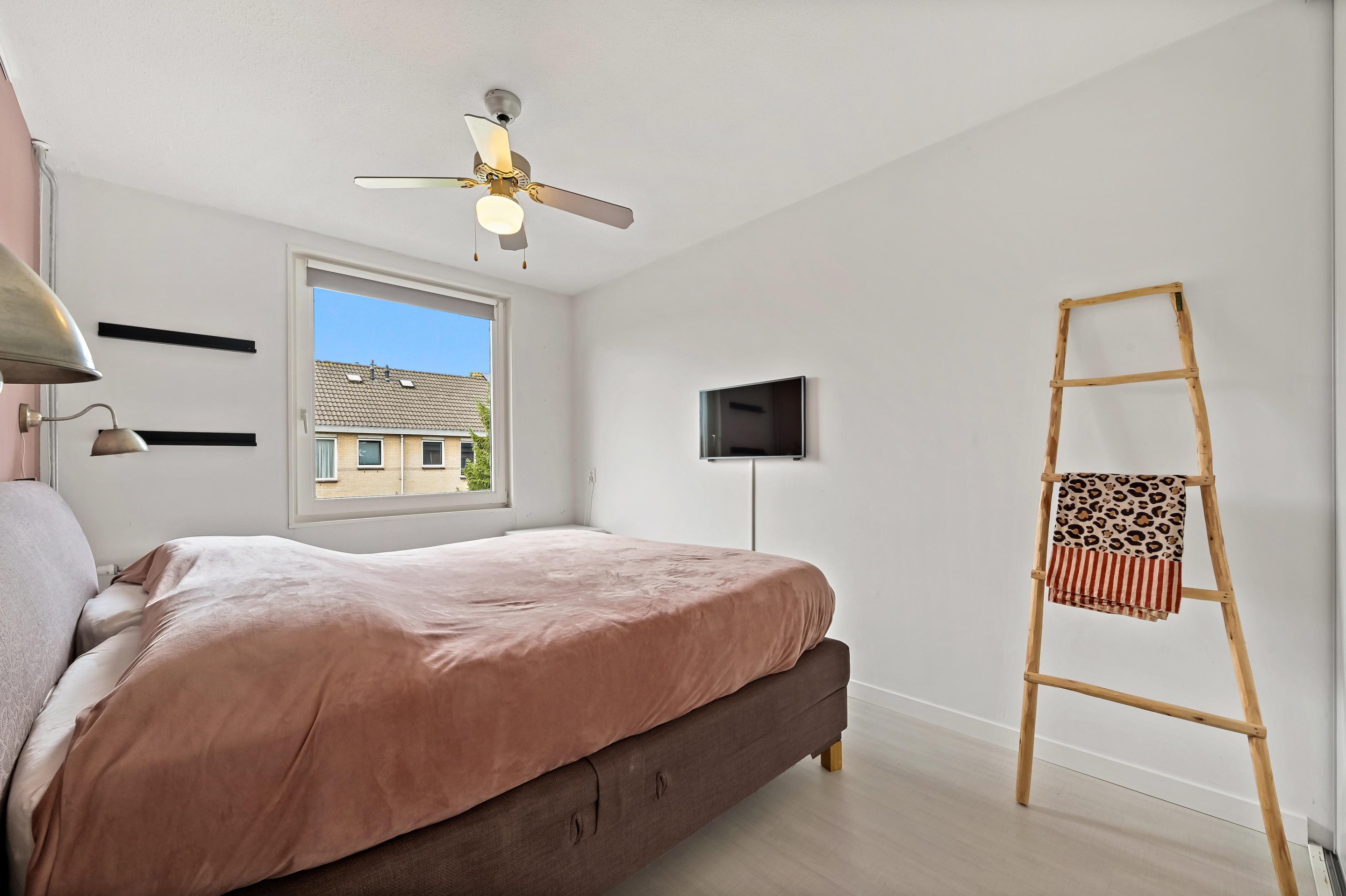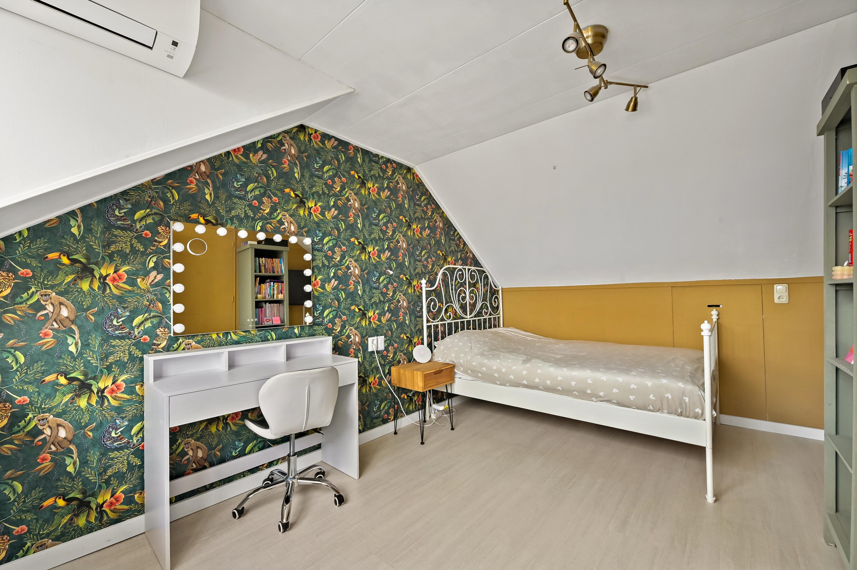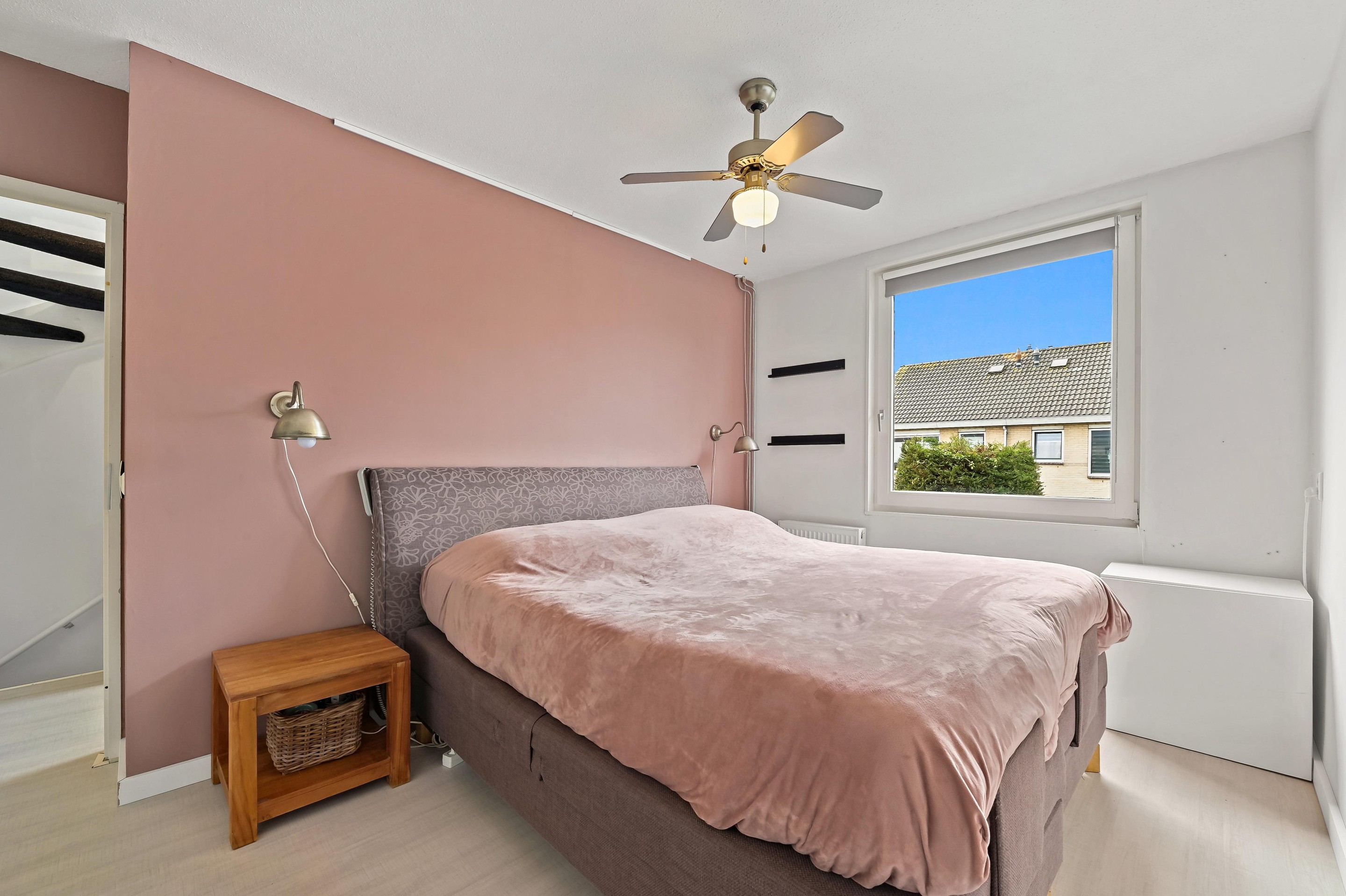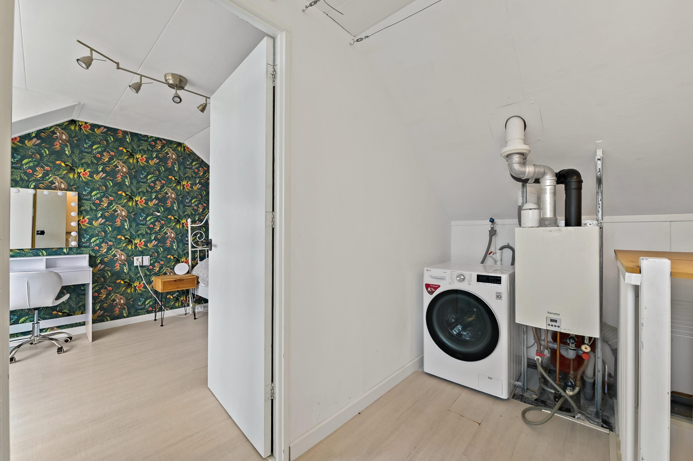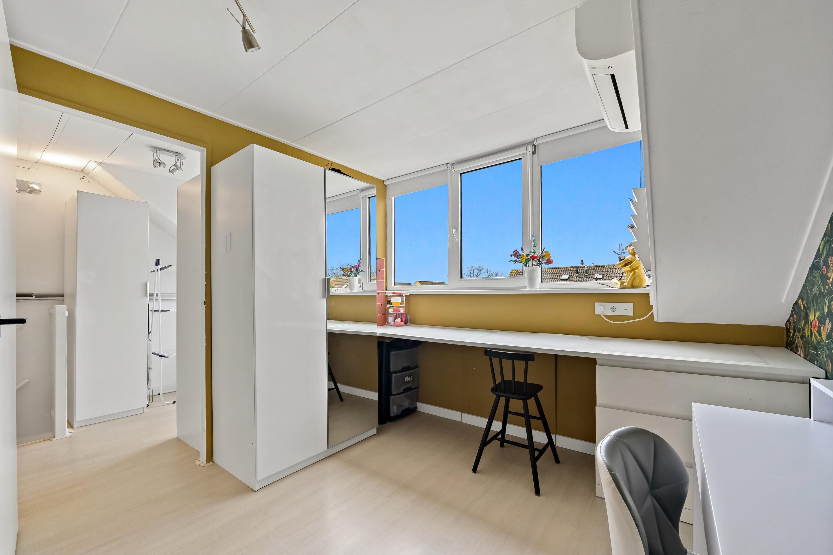 Op de zolderverdieping is aan de achterzijde een grote dakkapel geplaatst. Deze dakkapel is nagenoeg over de gehele breedte van de woning en zorgt voor een praktisch ingerichte overloop met aansluitingen voor wasmachine/droger en opstelplaats CV combiketel. De vierde slaapkamer is dankzij de dakkapel ook lekker ruim. Alle kozijnen op deze verdieping zijn uitgevoerd in kunststof, zodat schilderen niet meer nodig is. De slaapkamer is voorzien van een airco. Onder de schuine delen van de kap is veel bergruimte aanwezig.