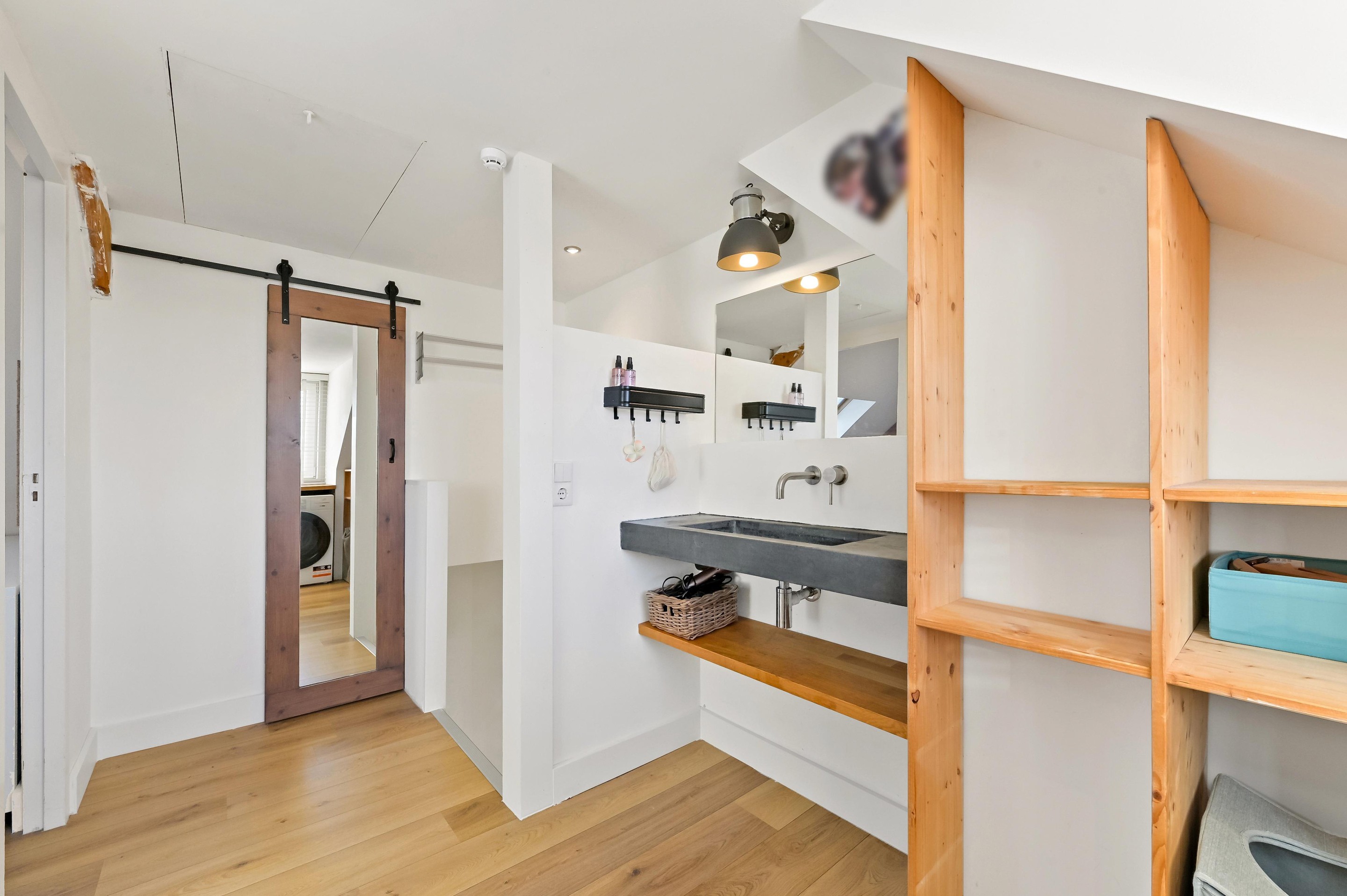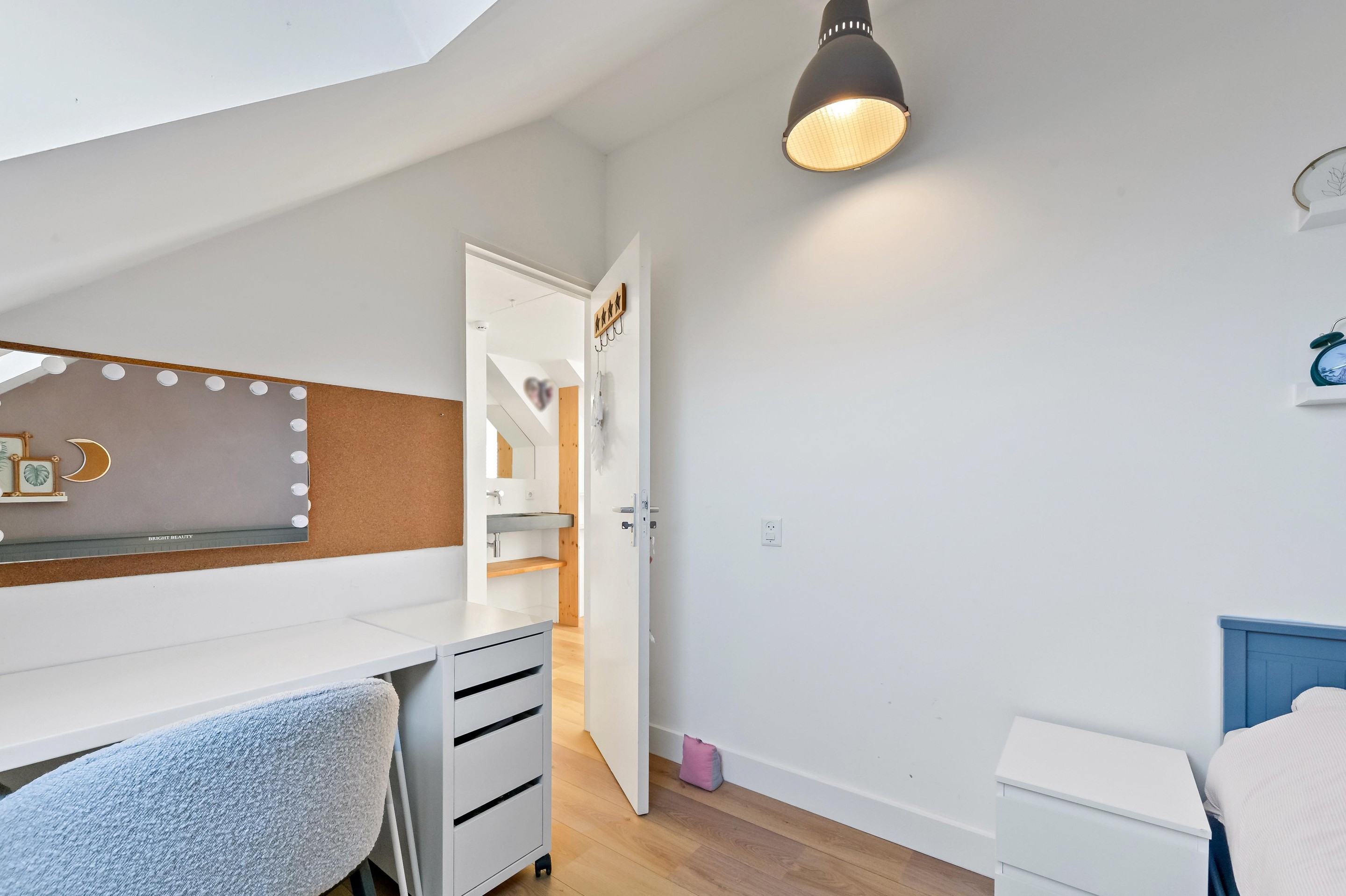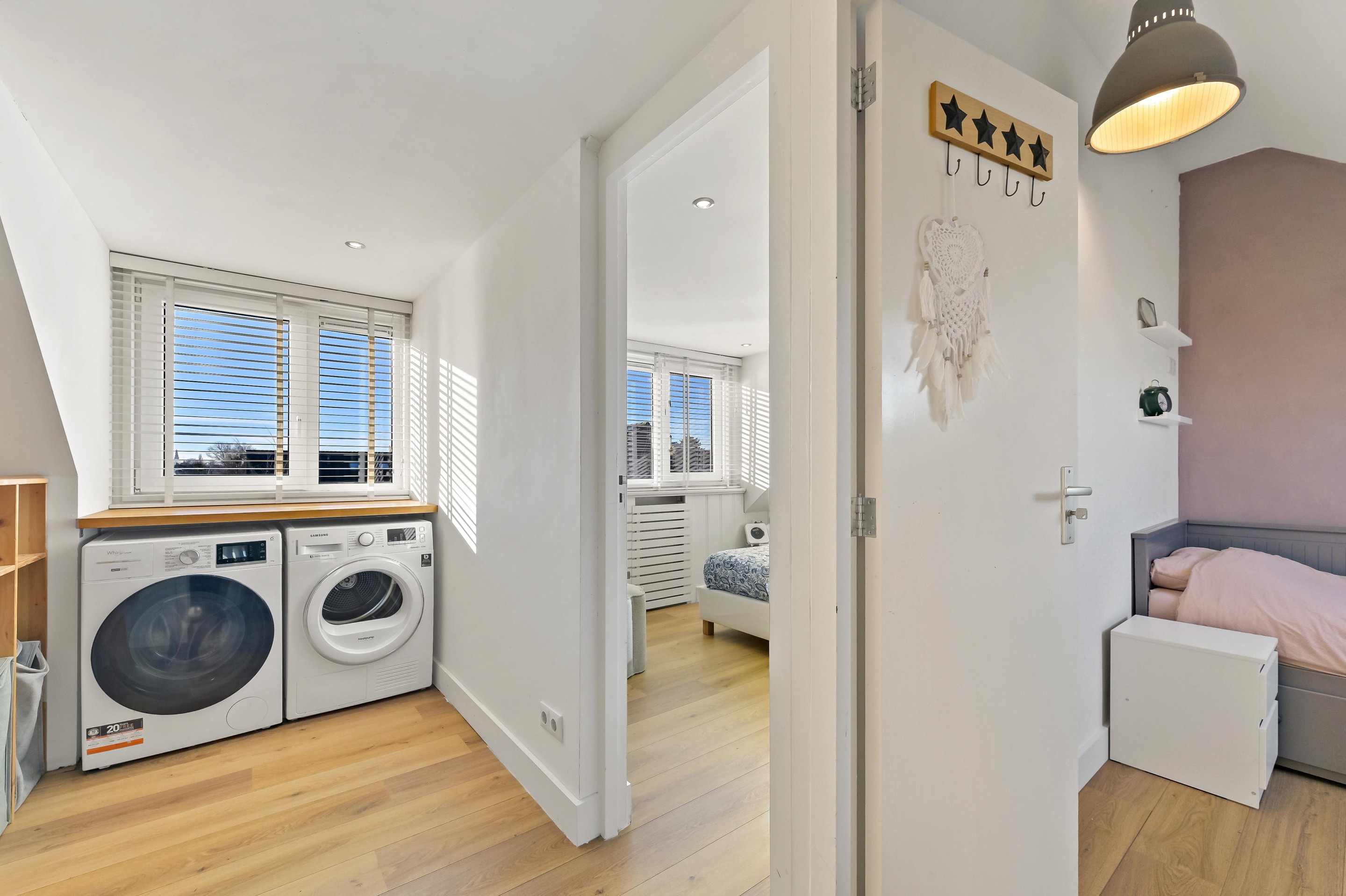 Tweede verdieping De tweede verdieping biedt verrassend veel ruimte dankzij de grote dakkapel aan de achterzijde. Op de overloop vindt u een wastafel, praktische bergkasten en de opstelplaats voor wasmachine en wasdroger. Daarnaast is er via een vlizotrap toegang tot de bergvliering. Op de tweede verdieping zijn twee slaapkamers aanwezig. De slaapkamer aan de achterzijde is voorzien van dakkapel, elektrisch bedienbare zonwering en inbouwspots. De slaapkamer aan de voorzijde beschikt over een groot dakraam en is aangenaam licht.