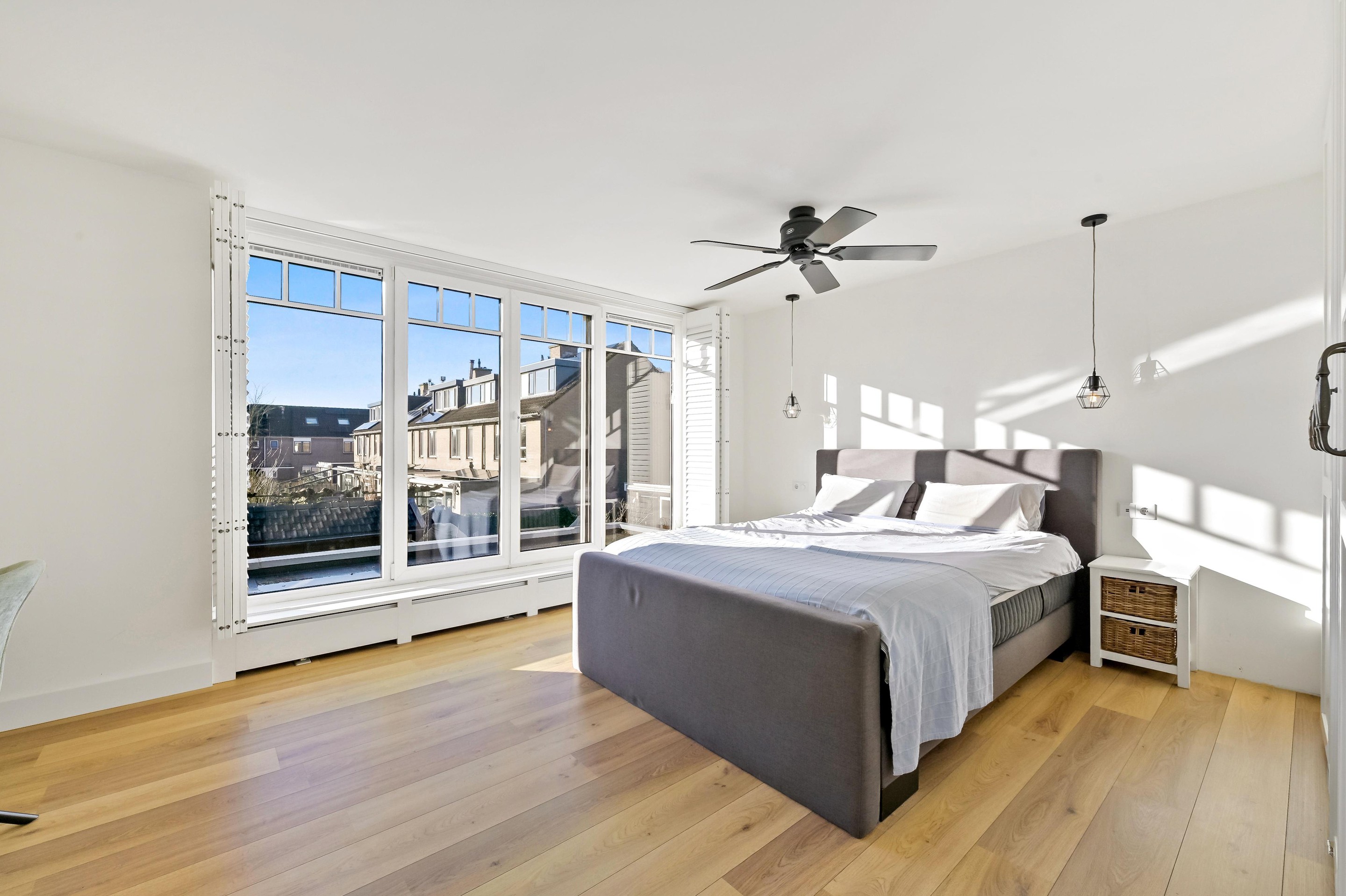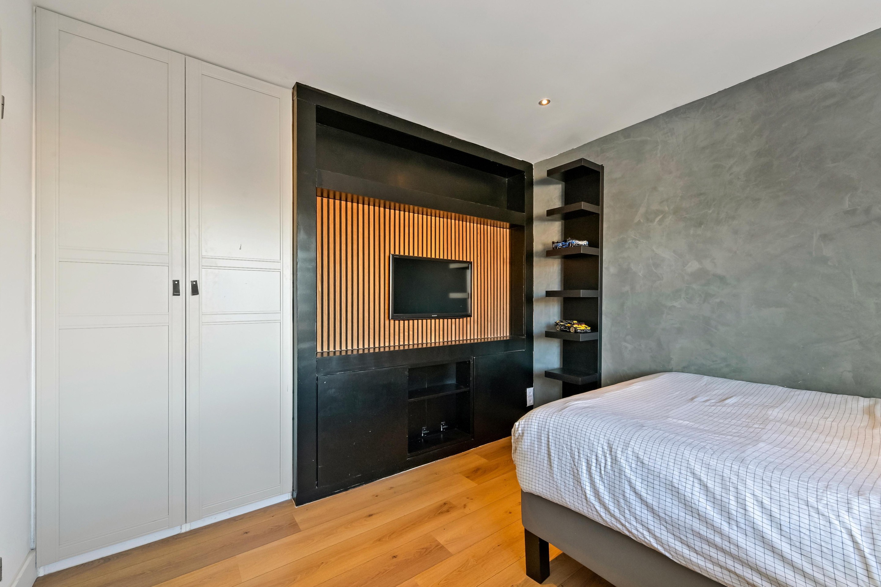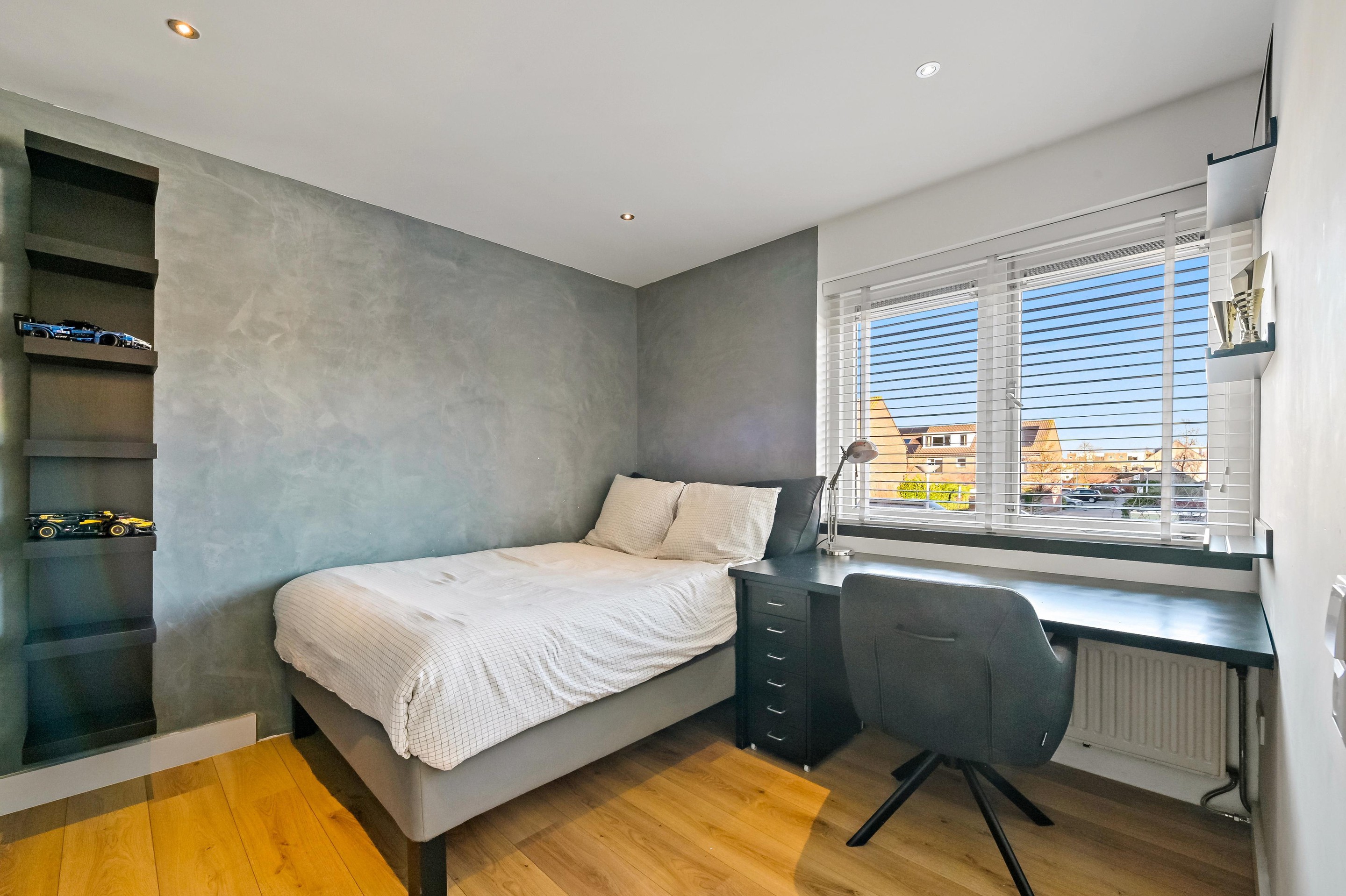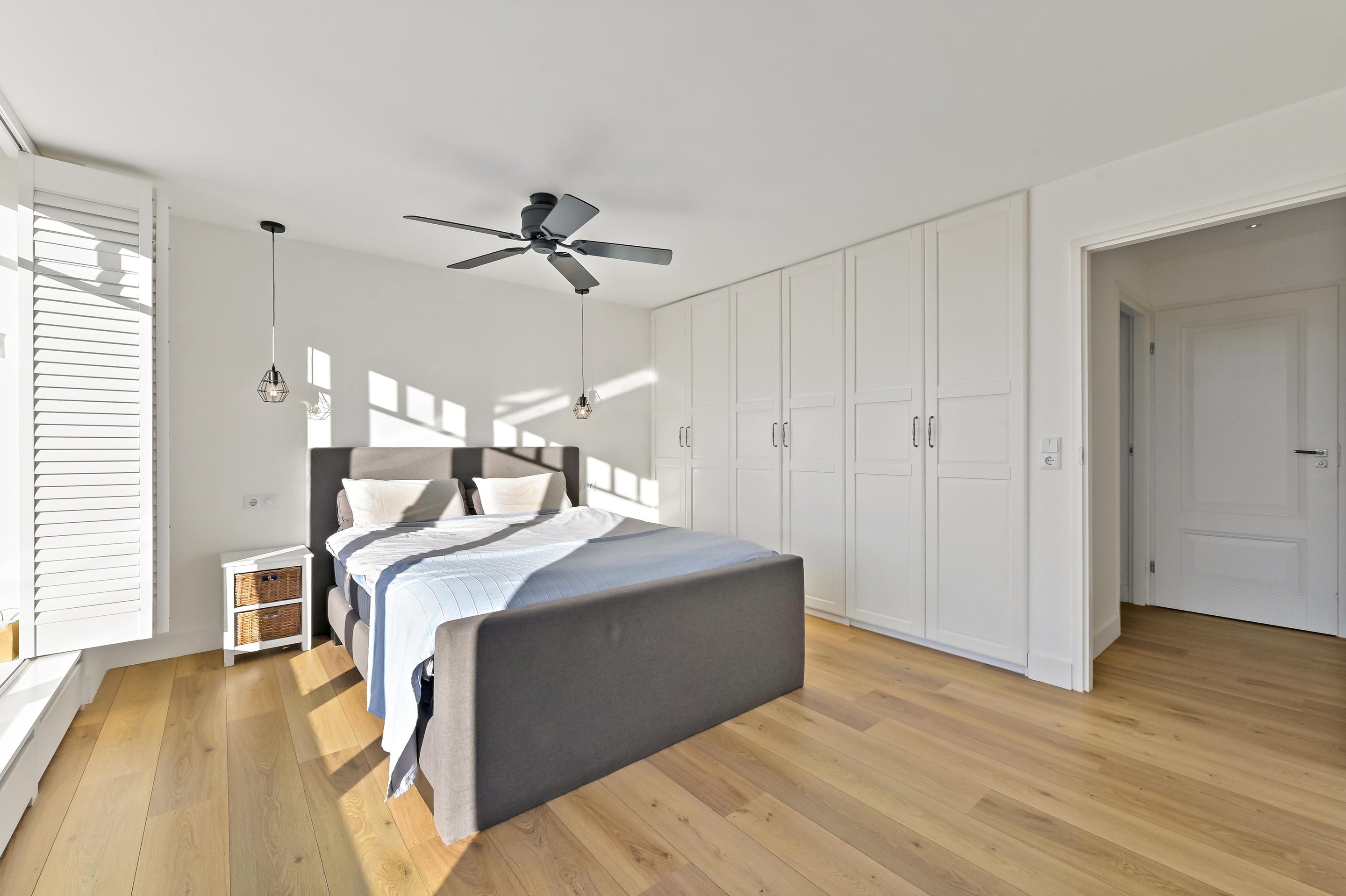 Eerste verdieping Ruime overloop met trapopgang naar de tweede verdieping en toegang tot alle vertrekken. Aan de achterzijde is een royale slaapkamer gesitueerd met vaste kasten en een grote raampartij met elektrisch bedienbare zonwering. Voorheen waren dit twee slaapkamers. De tweede slaapkamer bevindt zich aan de voorzijde van de woning. Deze kamer is eveneens voorzien van een vaste kast. Ook de luxe badkamer aan de voorzijde is compleet uitgevoerd met een wastafelmeubel, inloopdouche met rainshower en een tweede toilet.