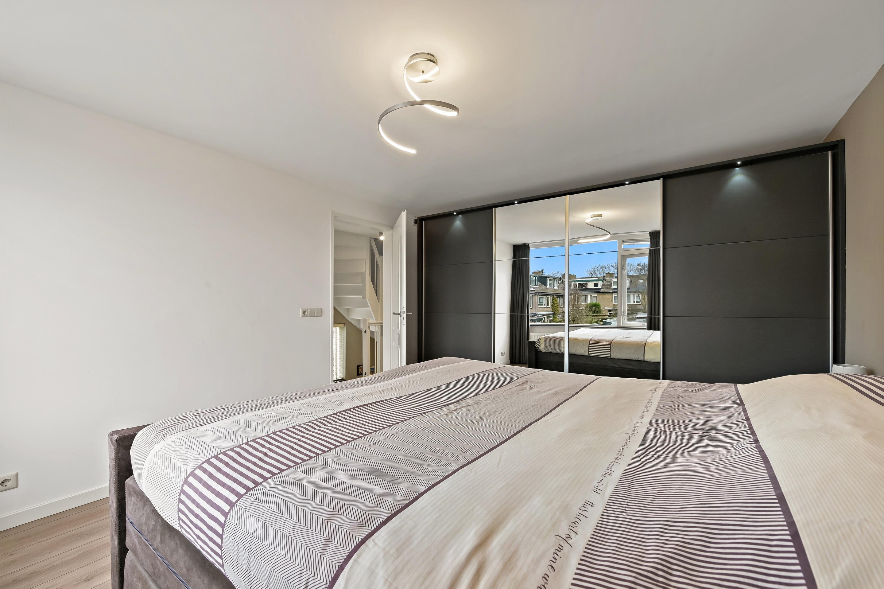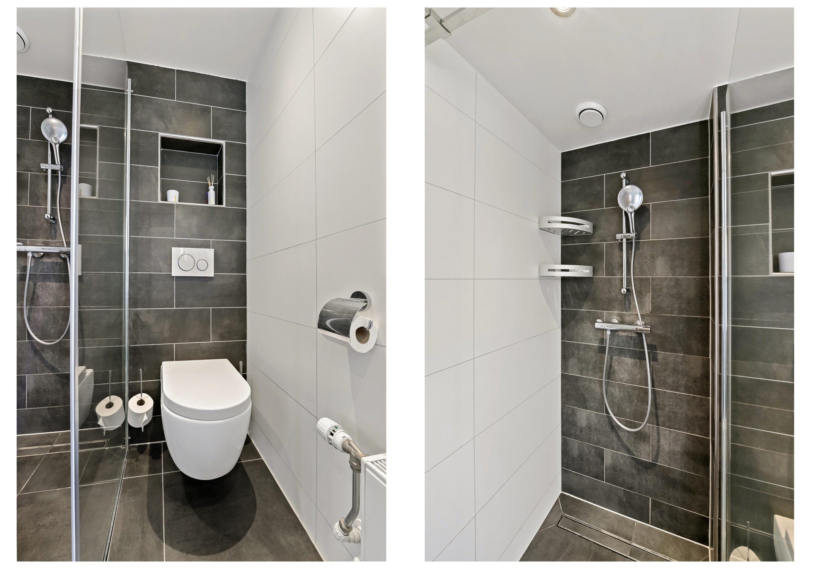 Eerste verdieping De lichte overloop met raam in de zijgevel beschikt over een trapopgang naar de tweede verdieping en bergkast. Vanaf de overloop heb je toegang tot de slaapkamers en de badkamer. De ruime hoofdslaapkamer is aan de achterzijde van de woning te vinden. Hier vind je een grote kledingkast en airco-unit welke beide in de woning achterblijven. Naast deze kamer is een tweede slaapkamer te vinden, welke is voorzien van een elektrisch bedienbaar rolluik. In deze kamer is een internetaansluiting aanwezig waardoor je deze ruimte bijvoorbeeld ook kunt gebruiken als kantoorruimte aan huis. De derde slaapkamer aan de voorzijde is royaal van formaat en voorzien van een airco-installatie en elektrisch bedienbaar rolluik. De moderne badkamer aan de voorzijde is praktisch ingedeeld en voorzien van douchecabine met rainshower, wastafelmeubel, bergkast, spiegel met verlichting, radiator en tweede toilet en elektrische vloerverwarming. De badkamer kan worden geventileerd door middel van mechanische en natuurlijke ventilatie. De eerste verdieping is (met uitzondering van de badkamer) voorzien van een nette laminaat vloer.