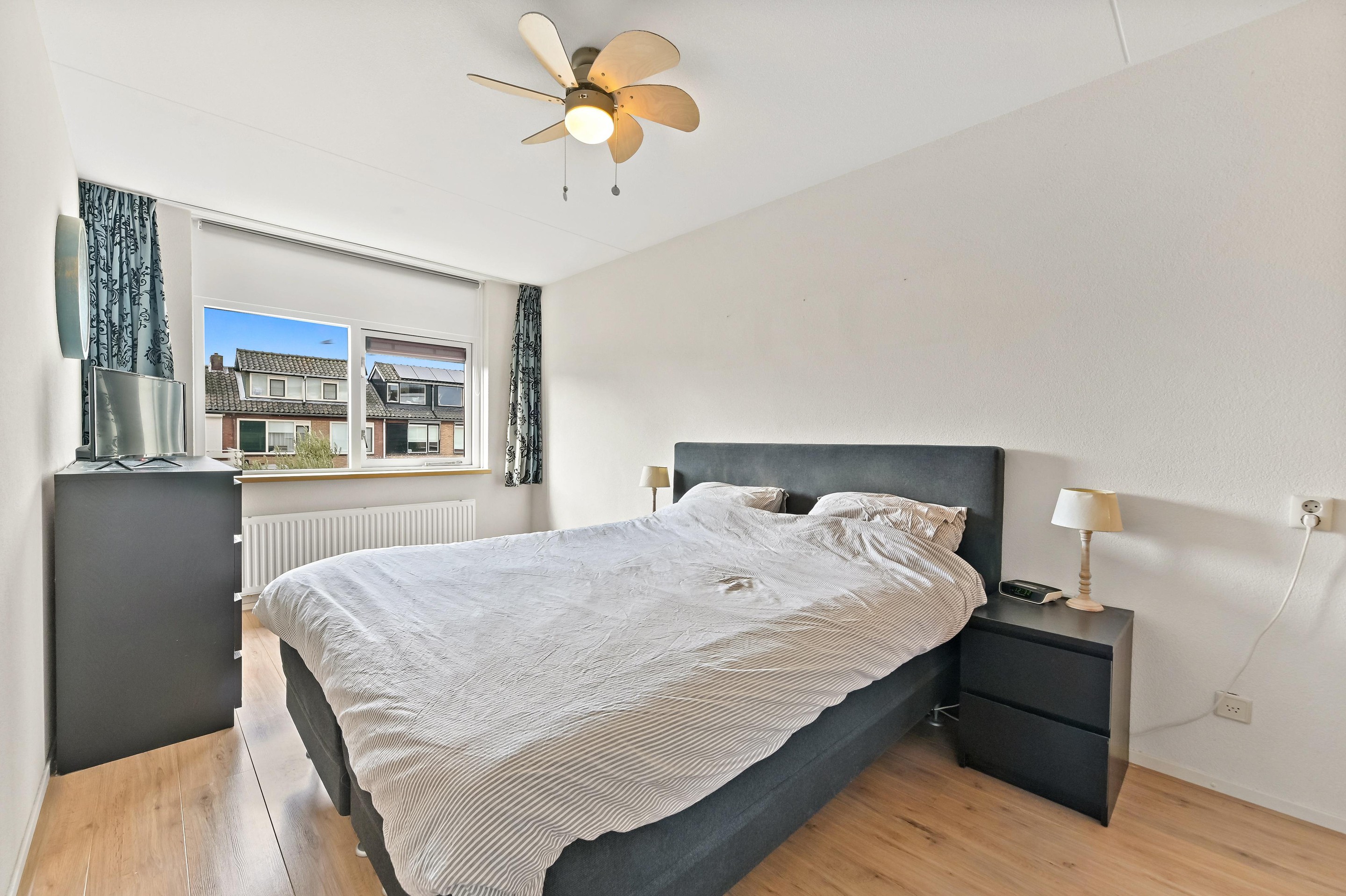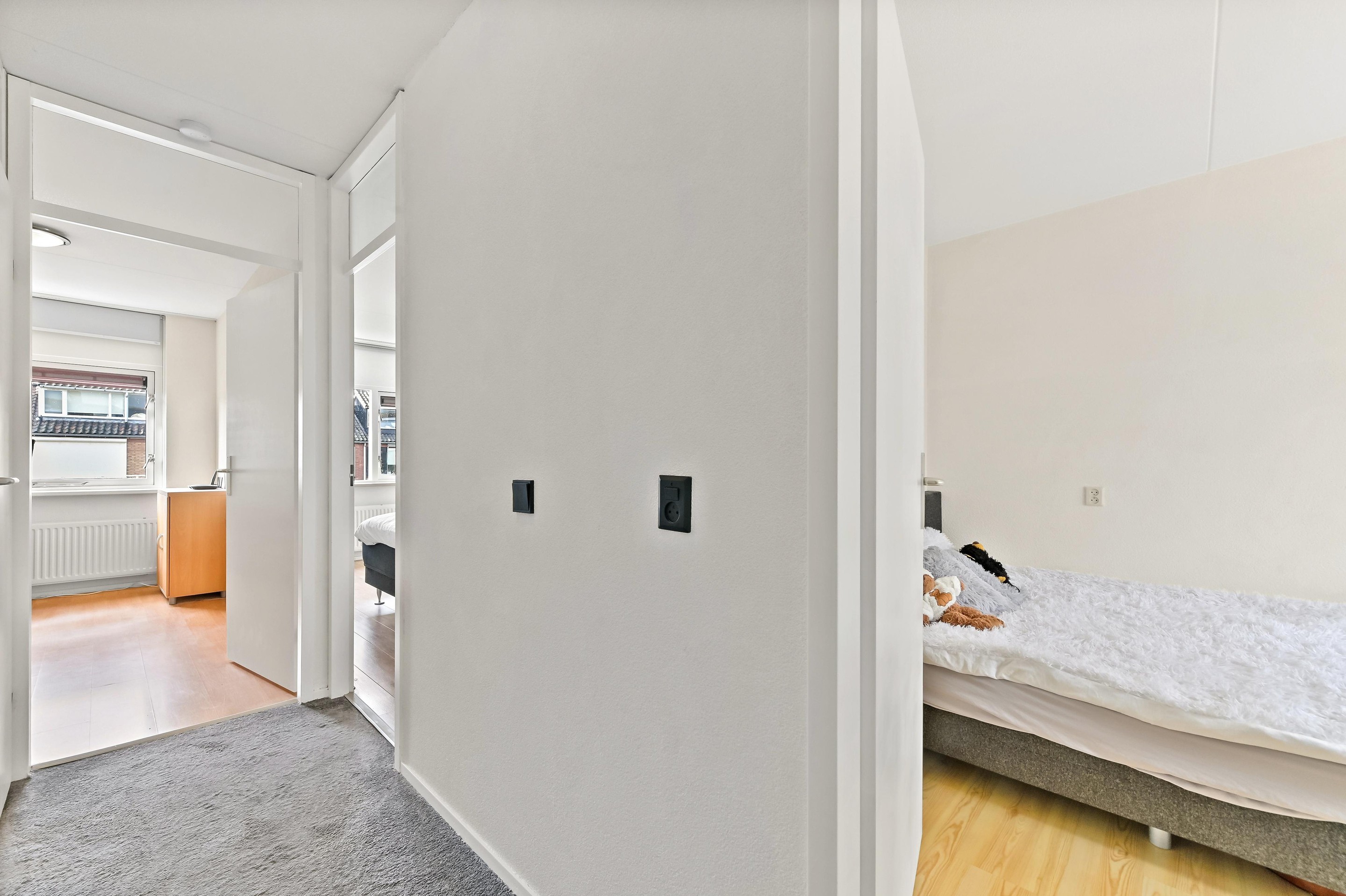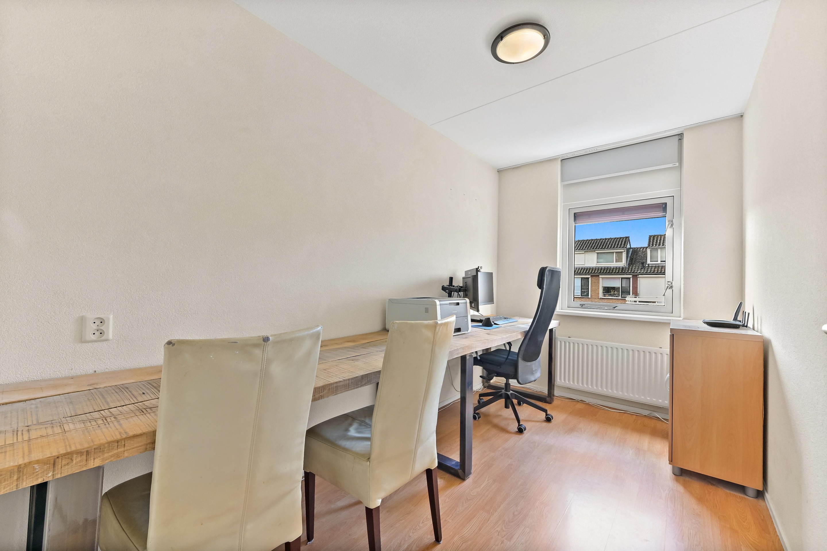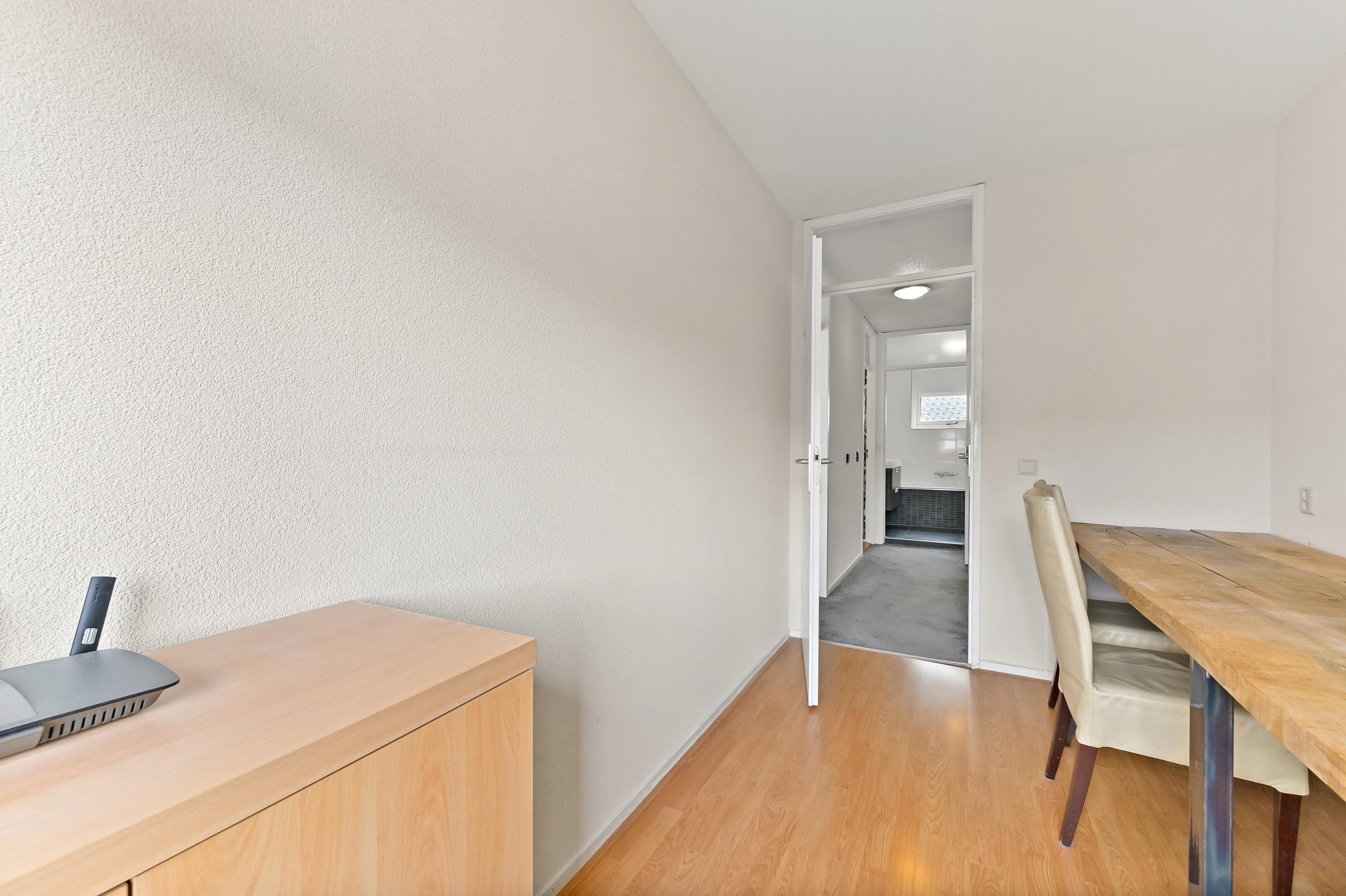 Eerste verdieping Vanaf de overloop heeft u toegang tot de drie slaapkamers, het separate toilet en de badkamer. Aan de achterzijde van de woning bevinden zich twee slaapkamers. De hoofdslaapkamer is ruim van opzet en beschikt over een vaste kastenwand wat zorgt voor praktische opbergruimte. De tweede kamer is eveneens ruim van formaat en wordt op dit moment gebruikt als kantoor. De derde slaapkamer is aan de voorzijde van de woning te vinden. Deze kamer is ruim van formaat en praktisch ingedeeld. Direct daarnaast ligt de nette, volledig betegelde badkamer. Deze is uitgerust met een wastafelmeubel, ligbad en douchecabine. Dankzij het raam in de voorgevel is er prettig daglicht en natuurlijke ventilatie aanwezig.