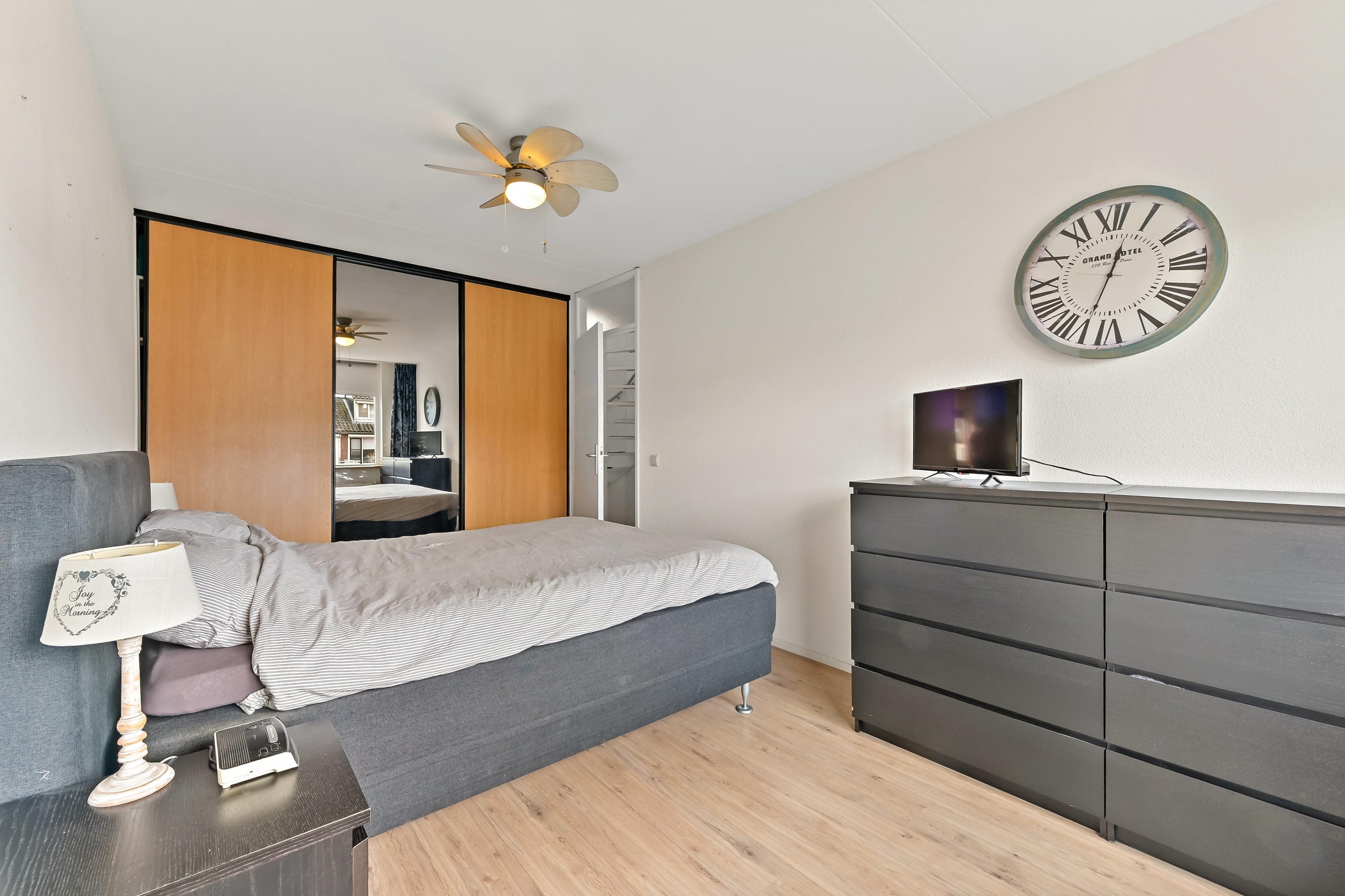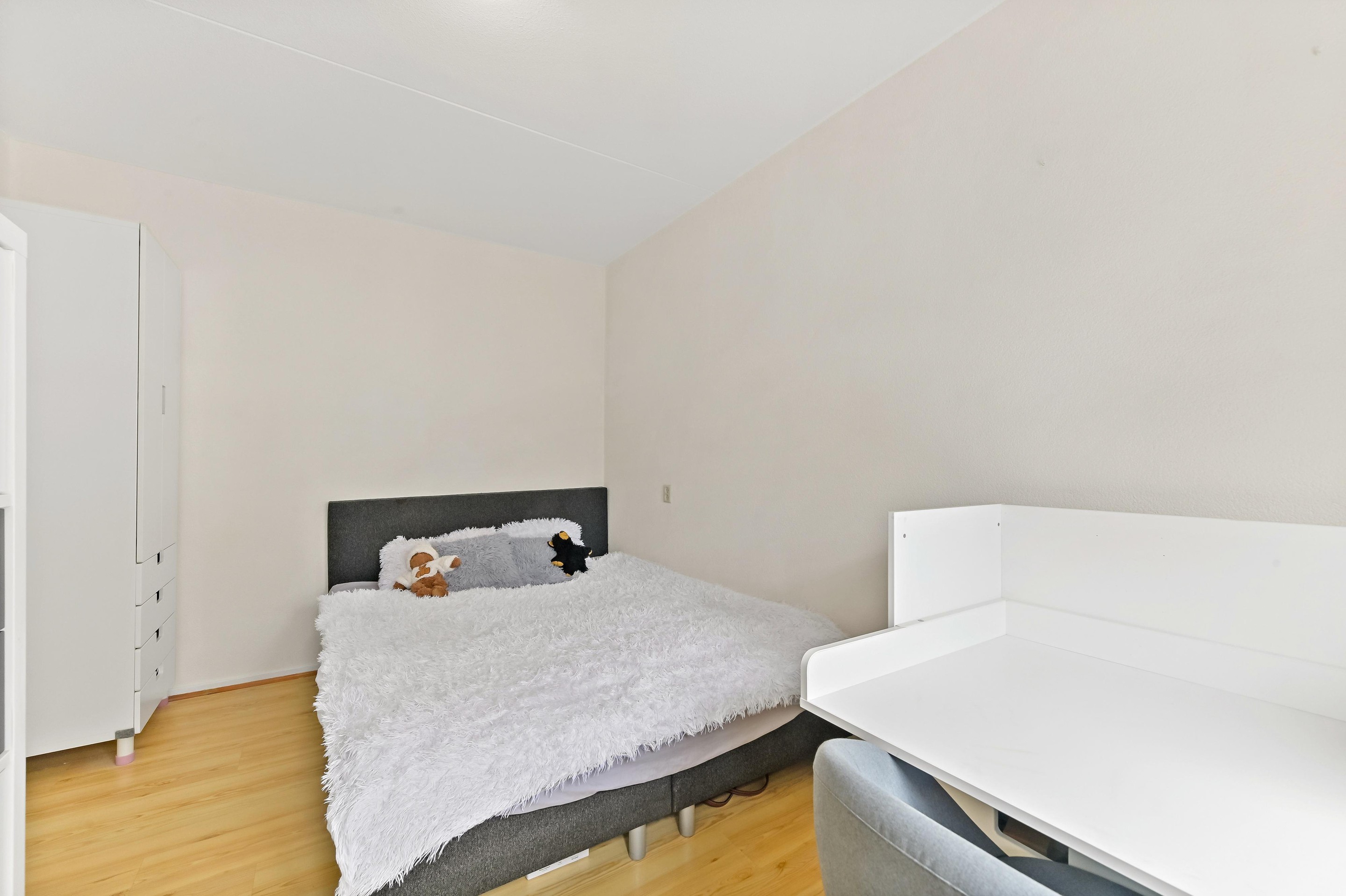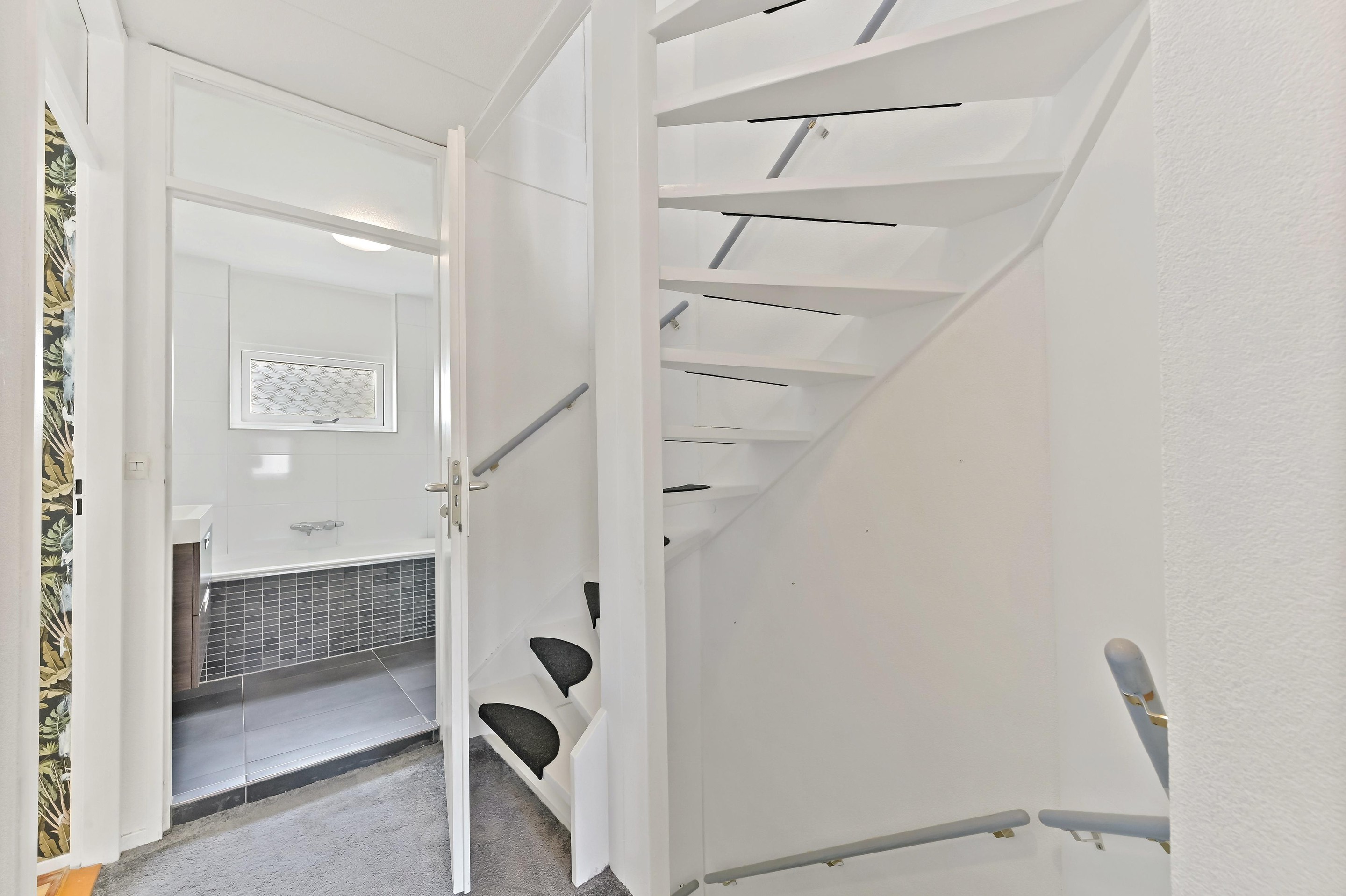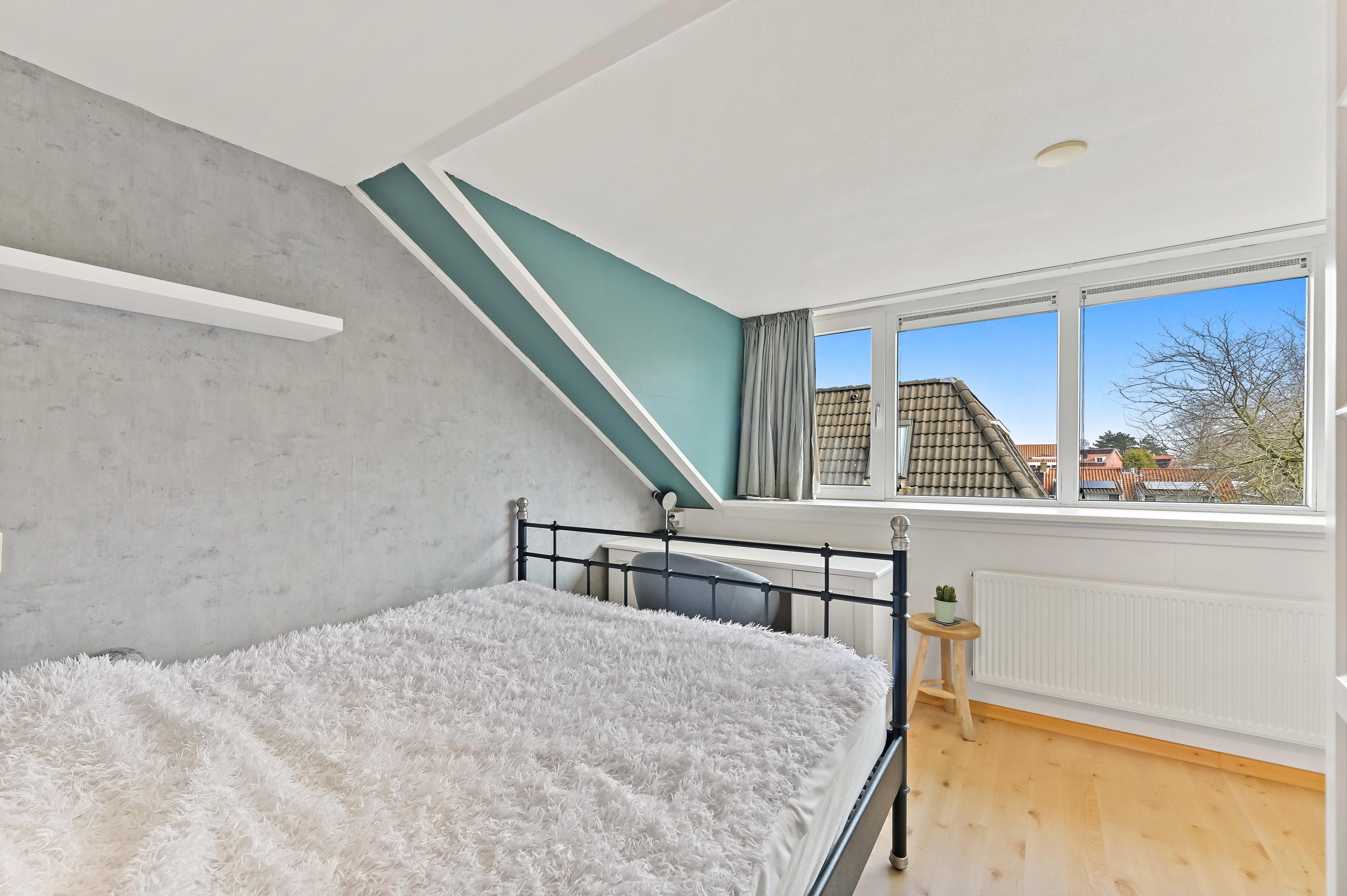 Eerste verdieping Vanaf de overloop heeft u toegang tot de drie slaapkamers, het separate toilet en de badkamer. Aan de achterzijde van de woning bevinden zich twee slaapkamers. De hoofdslaapkamer is ruim van opzet en beschikt over een vaste kastenwand wat zorgt voor praktische opbergruimte. De tweede kamer is eveneens ruim van formaat en wordt op dit moment gebruikt als kantoor. De derde slaapkamer is aan de voorzijde van de woning te vinden. Deze kamer is ruim van formaat en praktisch ingedeeld. Direct daarnaast ligt de nette, volledig betegelde badkamer. Deze is uitgerust met een wastafelmeubel, ligbad en douchecabine. Dankzij het raam in de voorgevel is er prettig daglicht en natuurlijke ventilatie aanwezig.